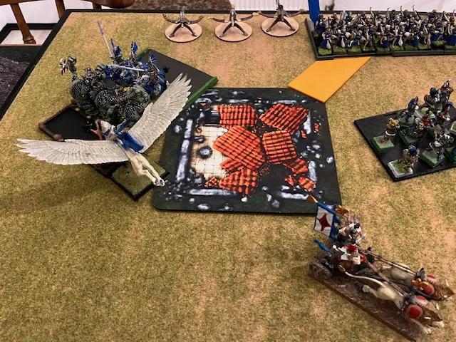 Das Spiel war vor allem auf der rechten Flanke sehr spannend, weil ich den Falkenreitern aus dem Weg gehen musste und gleichzeitig mit dem Gortach Druck ausüben wollte. Der Gortach war dann im ganzen Spiel auch der Unterschied. Ich konnte eine Einheit Dryaden töten und eine Einheit Bogenschützen verjagen. Der fliegende Held konnte meinen Gortach zwar dann ins Zentrum verjagen, aber was dann passierte war einfach nur Glück.
