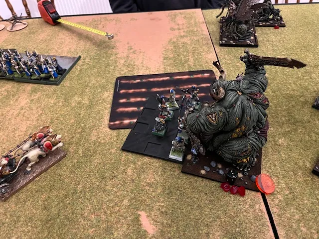 Ich versuchte die rechten Wretched Ones mit der Streitwagen lange aufzuhalten, denn die Streitwagen hatten wenigstens einen Rüstungswurf. Das klappte auch recht gut, aber nicht bis zum Ende des Spiels. Auf der linke Flanke bekam ich einen Nahkampf von meinem Gortach und den Razortusk in die Chaosritter hin und konnte alle vernichten. Danach fraßen sich die Wretched Ones durch meinen Gortach durch.