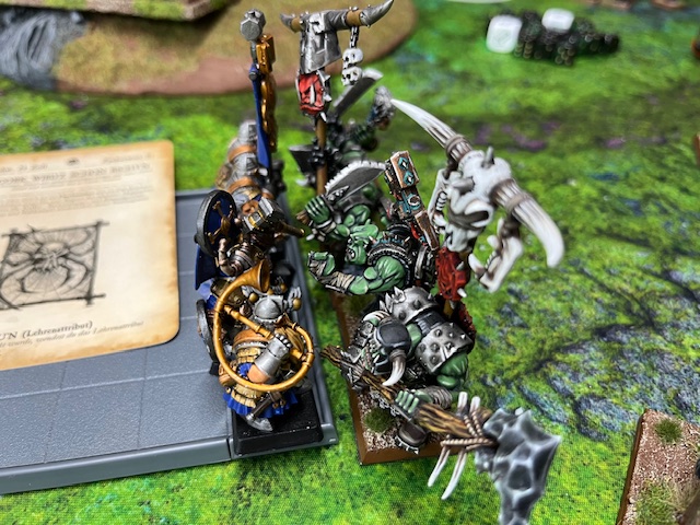 Die Trolle schafften sogut wie keinen Regiwurf und wurden in die Flucht geschlagen. Also musste mein angeschlagener Orktrupp mit AST, General und Schamane ran!