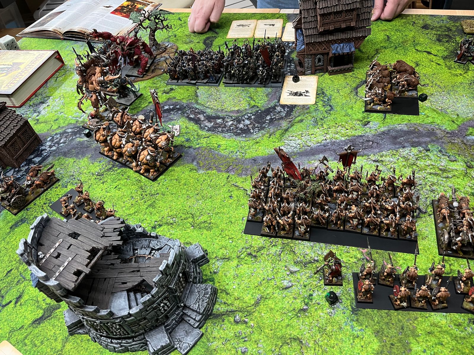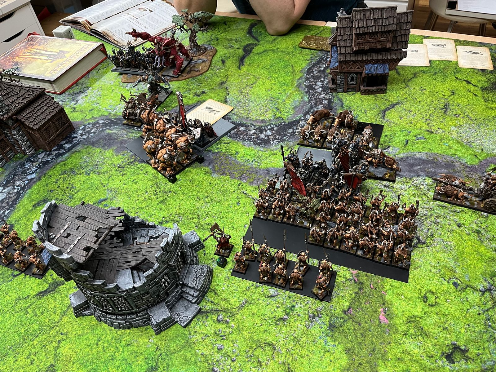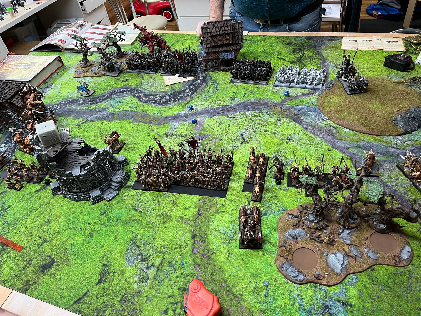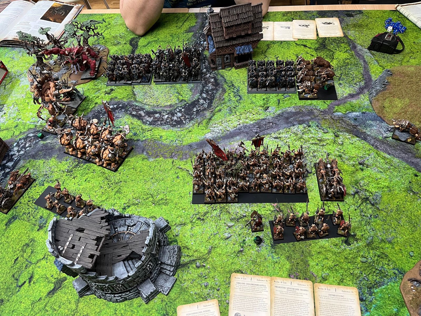 Da der Durchbruch der Chaoskrieger völlig schief gelaufen ist, kam nun die Kehrtwende. Die Razortusk gingen in den Rücken der Ritter und die Streitwagen in den Dämonenprinz. In der Magiephase wurden dann noch Ini, KG und Bewegung um 2 von den Rittern gesenkt, was den Chaoskrieger die Bannwürfel kostete und komplett verwürfelt wurde. Und dann wurde noch der Widerstand vom Dämonenprinzen um 2 reduziert.
