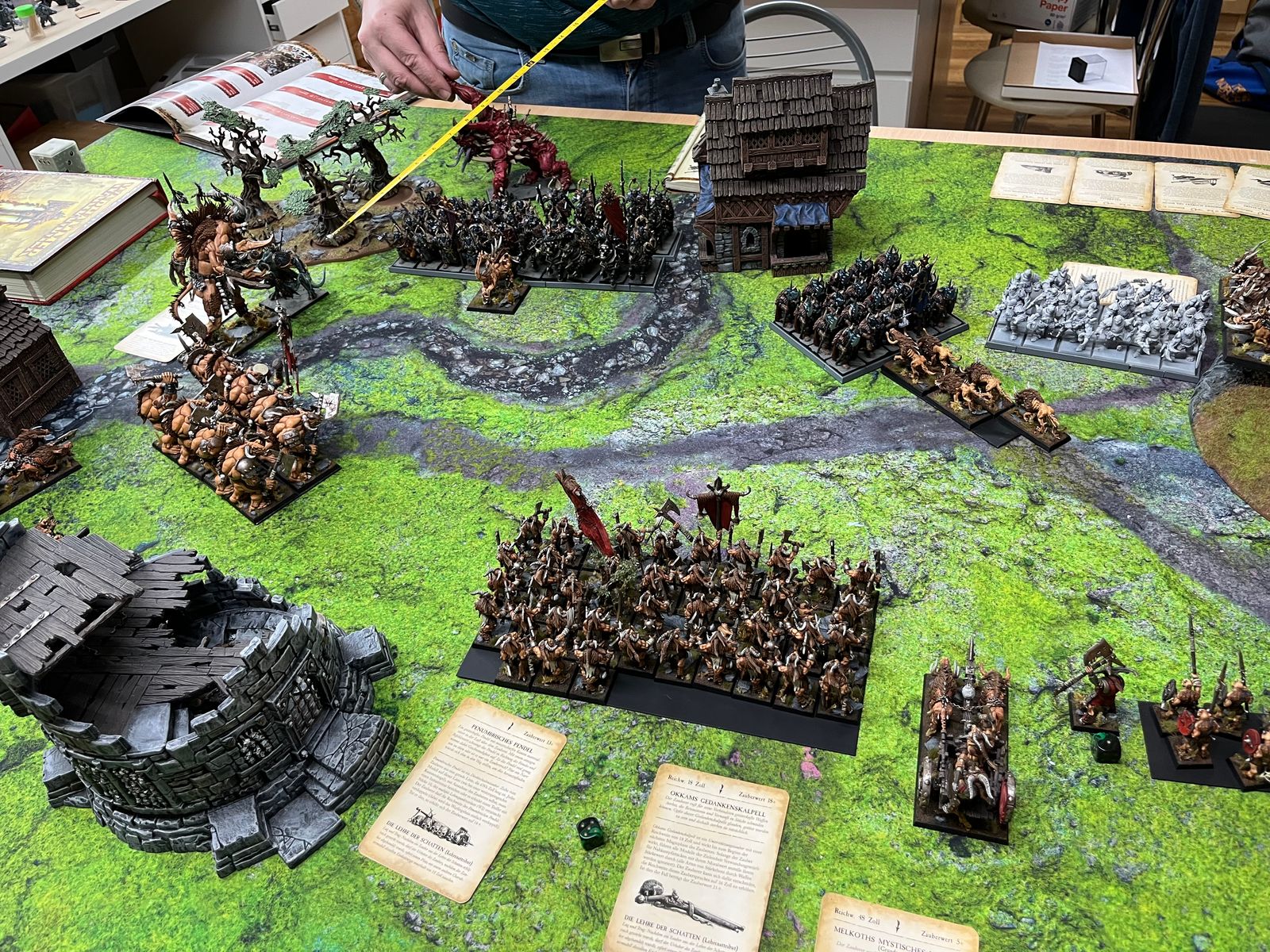 Die Chaosritter schlagen hart zu und verlieren trotz der vielen Attacken der Gor nur drei Ritter. Ich teste standhaft auf die 8 und der Trupp hält. Es wäre dank AST wiederholbar gewesen, aber hier hätte sich das Blatt wenden können.