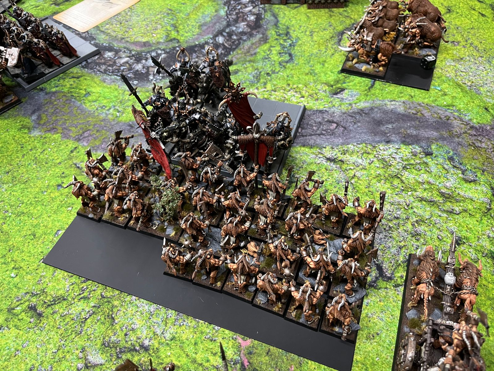 Jetzt die Angriffe der Tiermenschen. Der Ghorgor in die Brut rein, die Minos verwürfeln die Raserei und müssen einen Angriff ansagen, aber die 10 auf die Reiter schaffen sie nicht und laufen vor und ich muss mit dem Razortusk umlenken. Rechts gehen die 6 Razortusk in den Streitwagen.