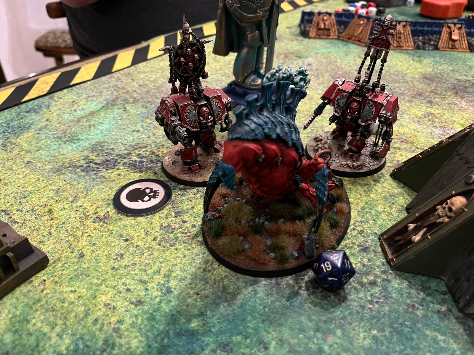 Hier spiele ich gegen 1000 Punkte World Eaters... Ziemlich krass, was die alles können. Einen Cybot habe ich tatsächlich tod bekommen mit den Symbionten, aber die anderen zwei waren nicht zu knacken. Meine Liste kann kaum etwas gegen Panzerung, bzw hohen Rüster und viele Leben...