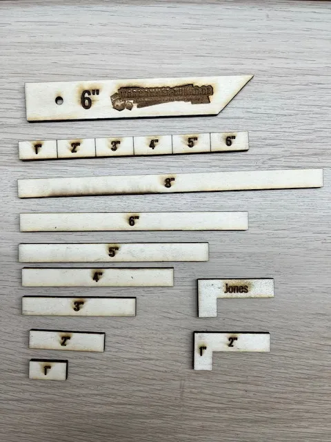 Es ist alle aus Pappelsperrholz ausgelasert. Das ist ziemlich leicht. Bei dem 6 Zoll Stab oben, der mit den Linien, merkt man, dass er bald kaputt gehen könnte. Da habe ich die Linien etwas tief gemacht, aber das Material ist vielleicht auch nicht ganz optimal. Hat da wer Erfahrung mehr? Was würdet ihr nehmen?