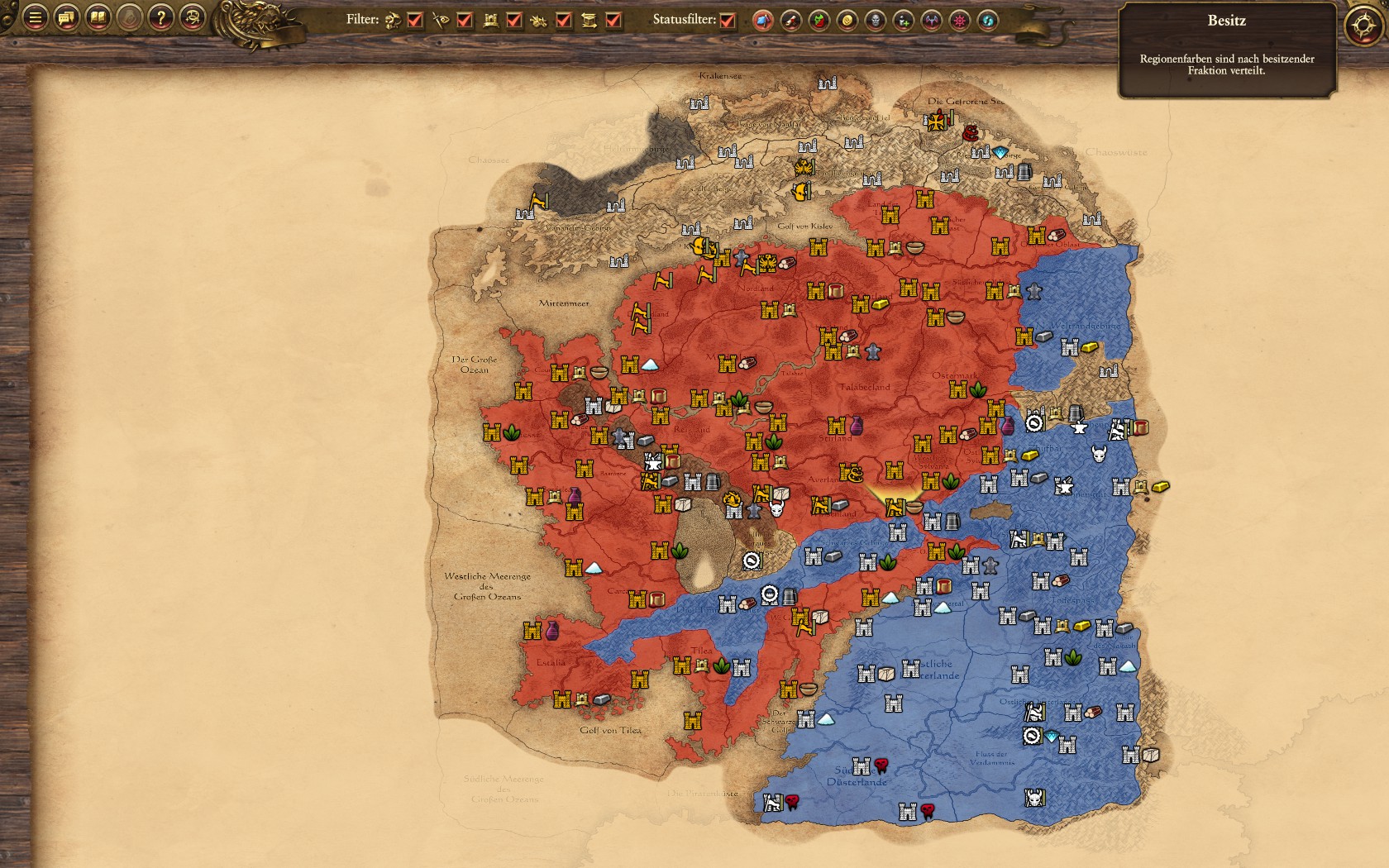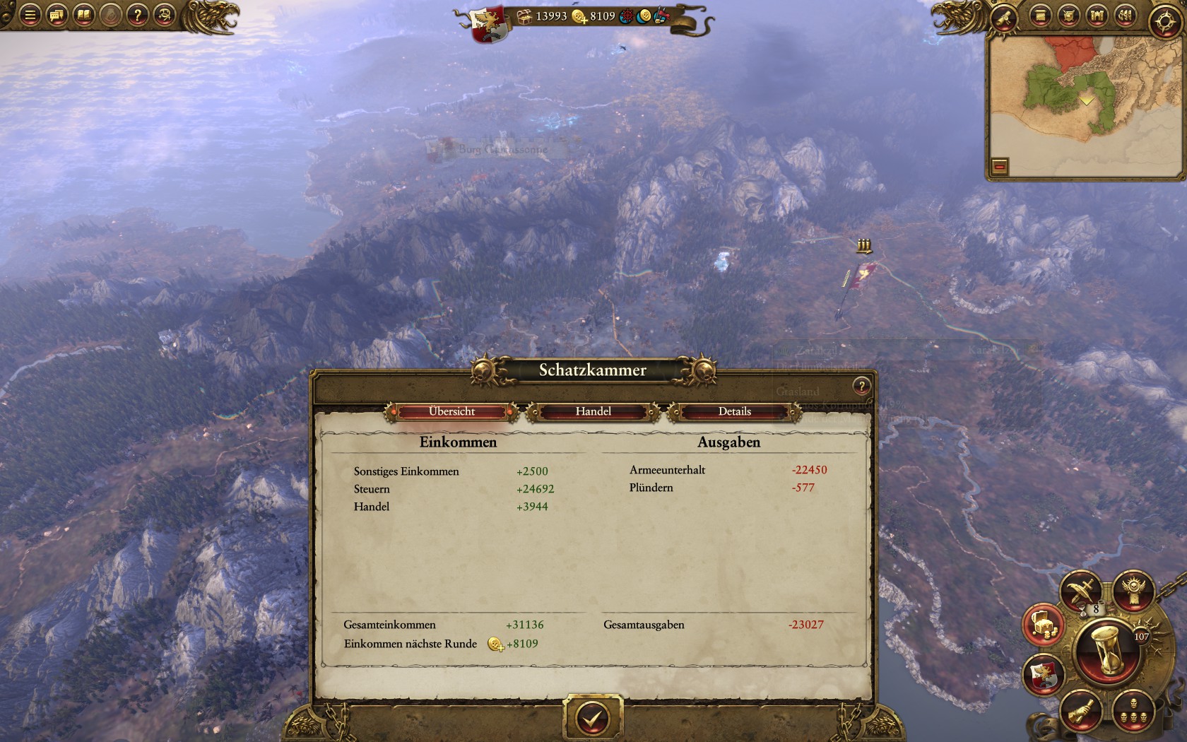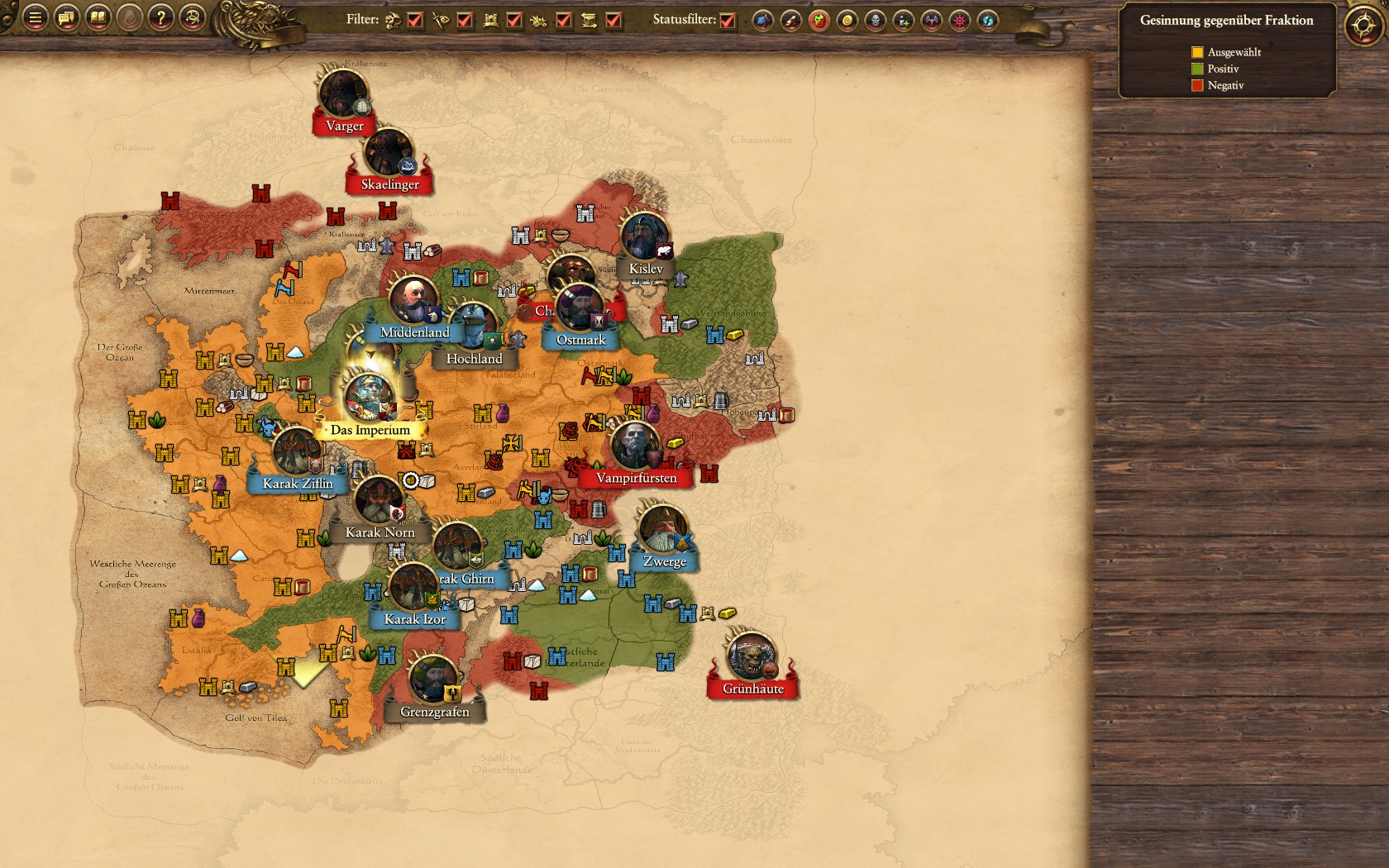 Das Chaos ignoriere ich noch. Scheinbar wurde es aber von den Kurfürsten in schach gehalten. Die Zwerge kämpfen gegen die Orks. So je nach dem ob ich das Chaos oder die Orks als größere Bedrohnung sehe, werde ich mich um ein von den beiden kümmern. Denke mal das das Chaos die höhere Priorität hat.