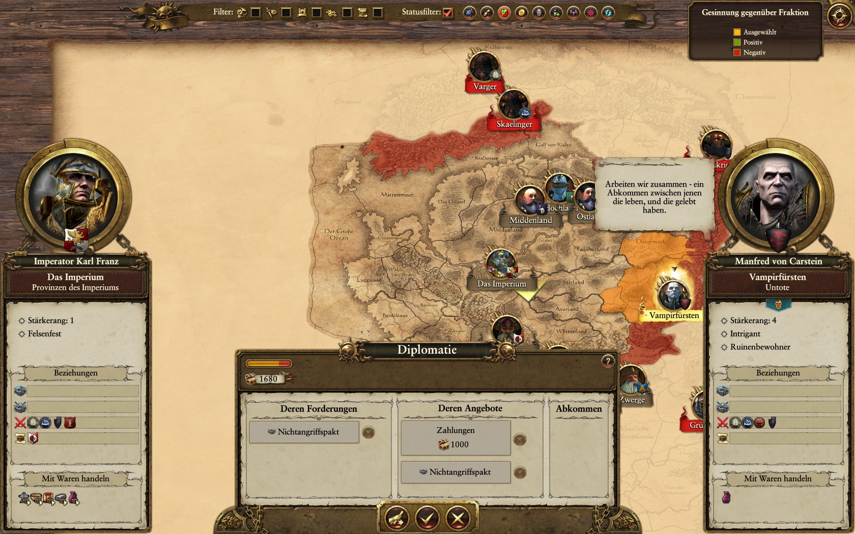 Die Fürstentümer haben untereinander einen gesicherten Frieden geschlossen. Der Imperator schloss ein nicht angriffspakt zusätzlich mit dem Vampir Fürst Manfred von Carstein. Der Imperator sieht das die Vampir bedrohung nicht so gefährlich ist, wie die bedrohung durch das Chaos. Der Imperator nahm Baumaßnahmen durch, die er zuvor vernachlässig hat. Er versucht die Öffentliche Ordnung und die Koruption durch das Chaos in Schach zu halten.