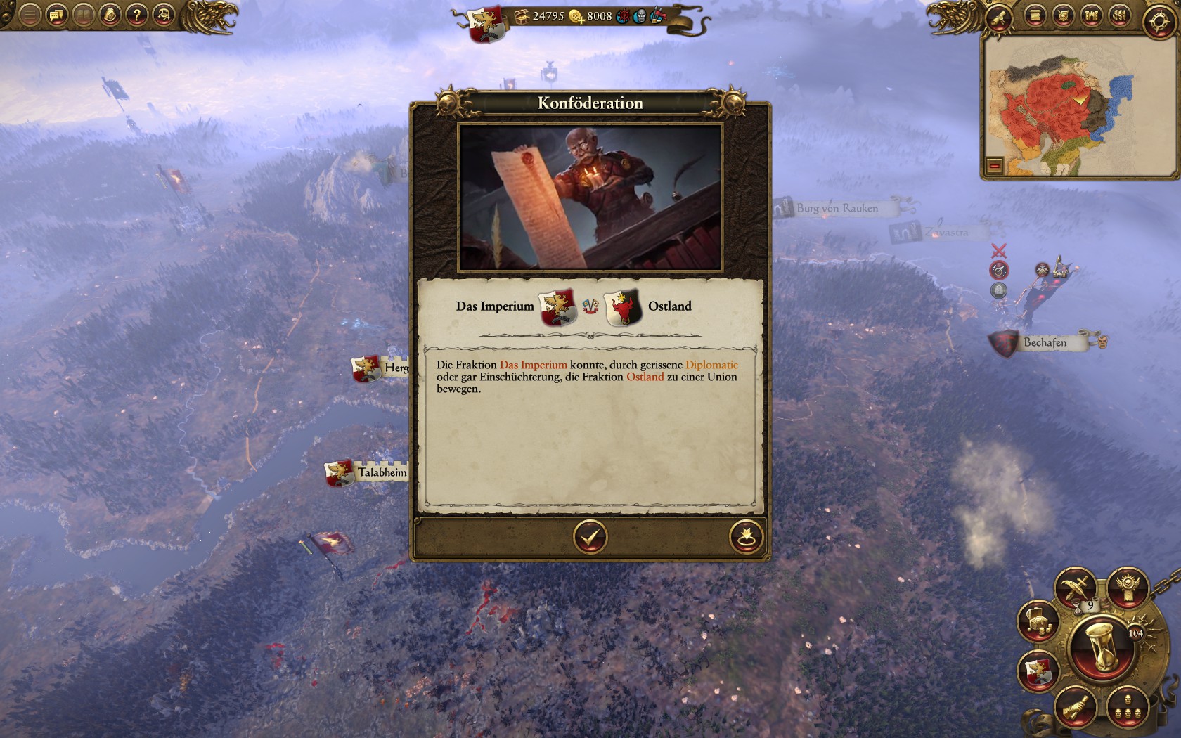 Das Imperium vergrößeren. Ich wusste nicht wohin ich mich ausbreiten soll. Mit den ganzen anderen Fürstentümer hatte ich nicht angriffspakte geschlossen und konnte daher nur nach süden und da waren halt die Bretonen. Miltenburg ist jetzt mit mir eine Konförderation eingegangen. Die haben kaum armeen. Zwei stück, und eine davon hat gerade mal 2 oder 3 einheiten. Da muss ich wohl jetzt erst mal viel Ordnung rein bringen.