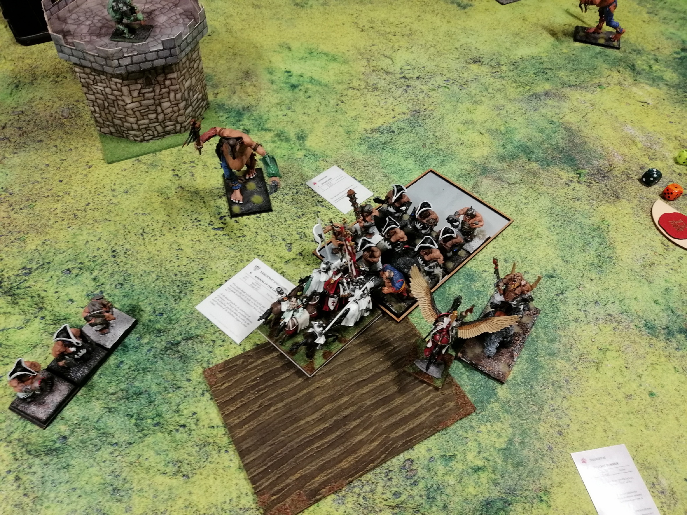 Einserrüster, deren Beschriftungen nicht mehr ins Bild gepasst hatten). Die beweglichen Reiters würden meinem überforderten Riesen rechtsaußen das Leben zu Hölle machen, dafür hatte Hunter Yorck im Tandem mit seiner Säbelzahnkatze(blockiert den Rittertrupp) linksaußen ein schönes Plätzchen mit Vorhut gefunden.