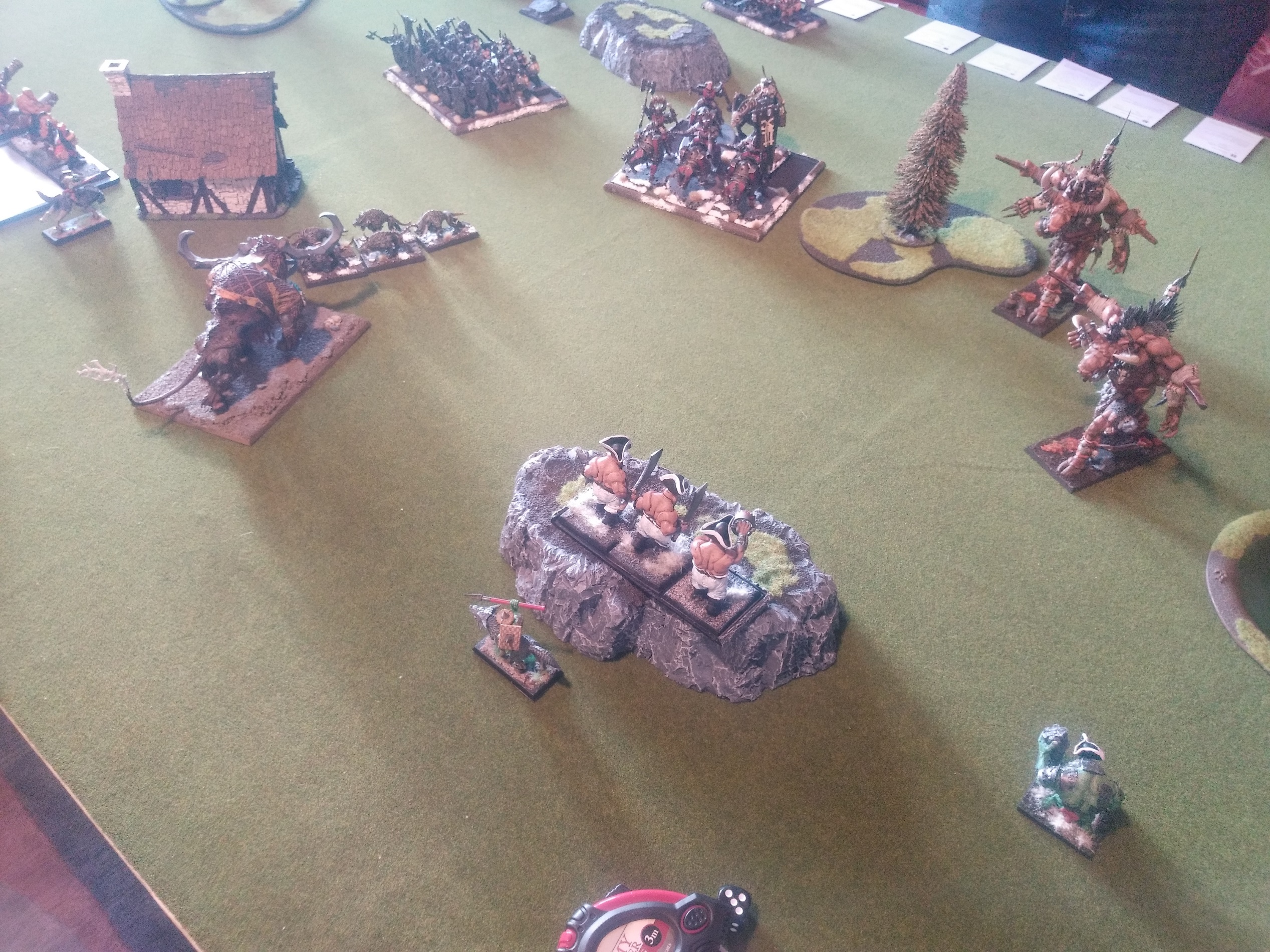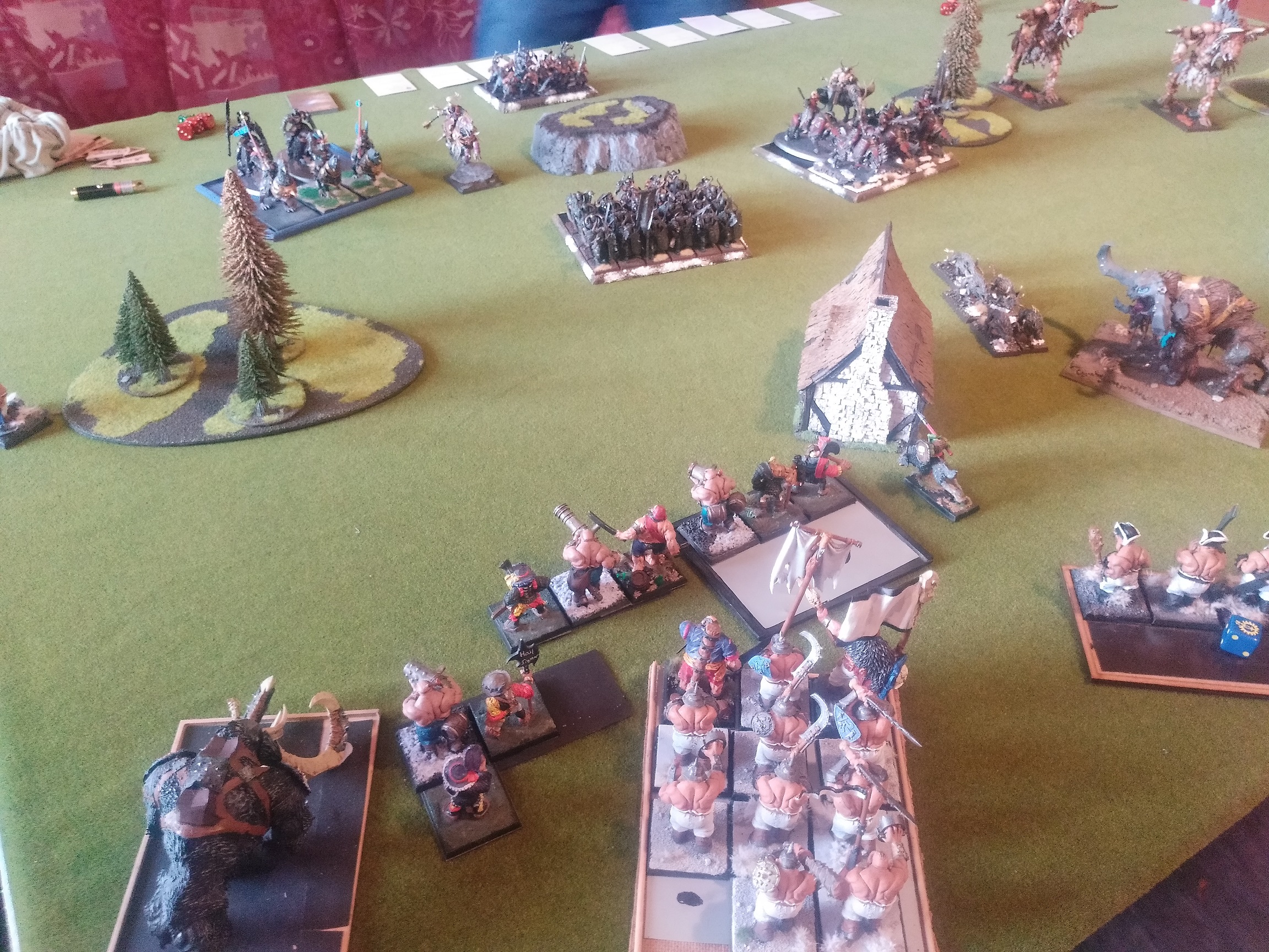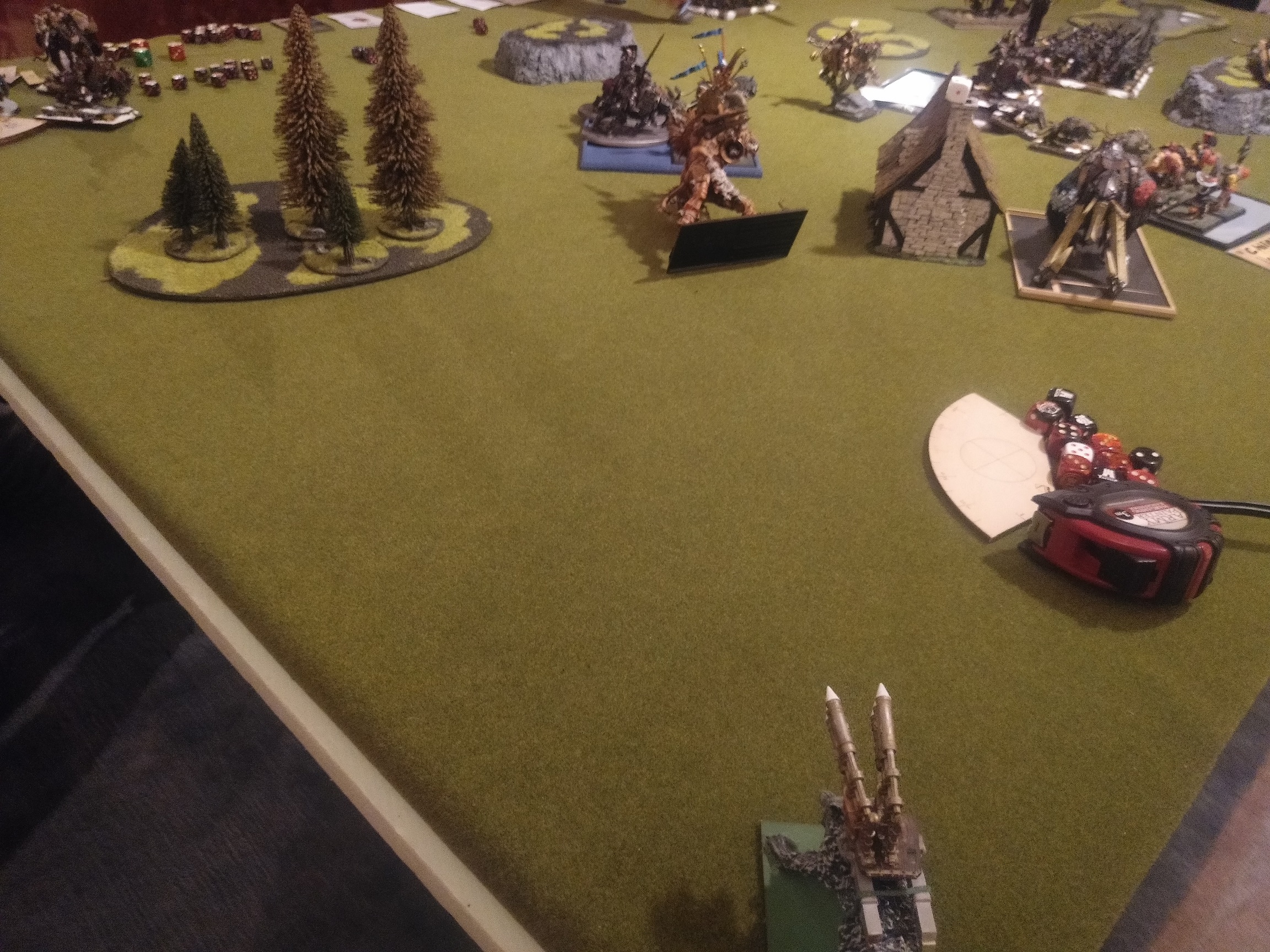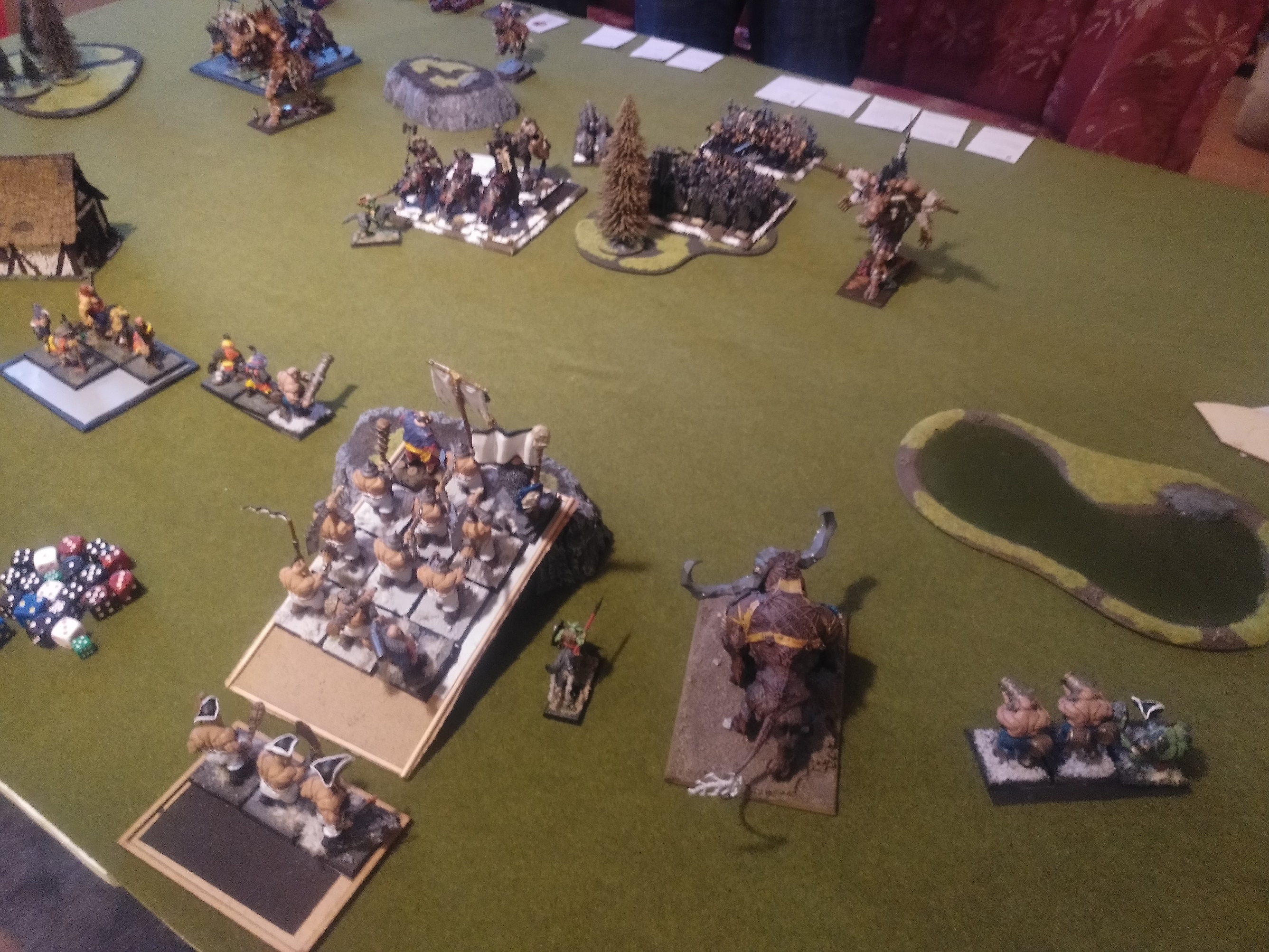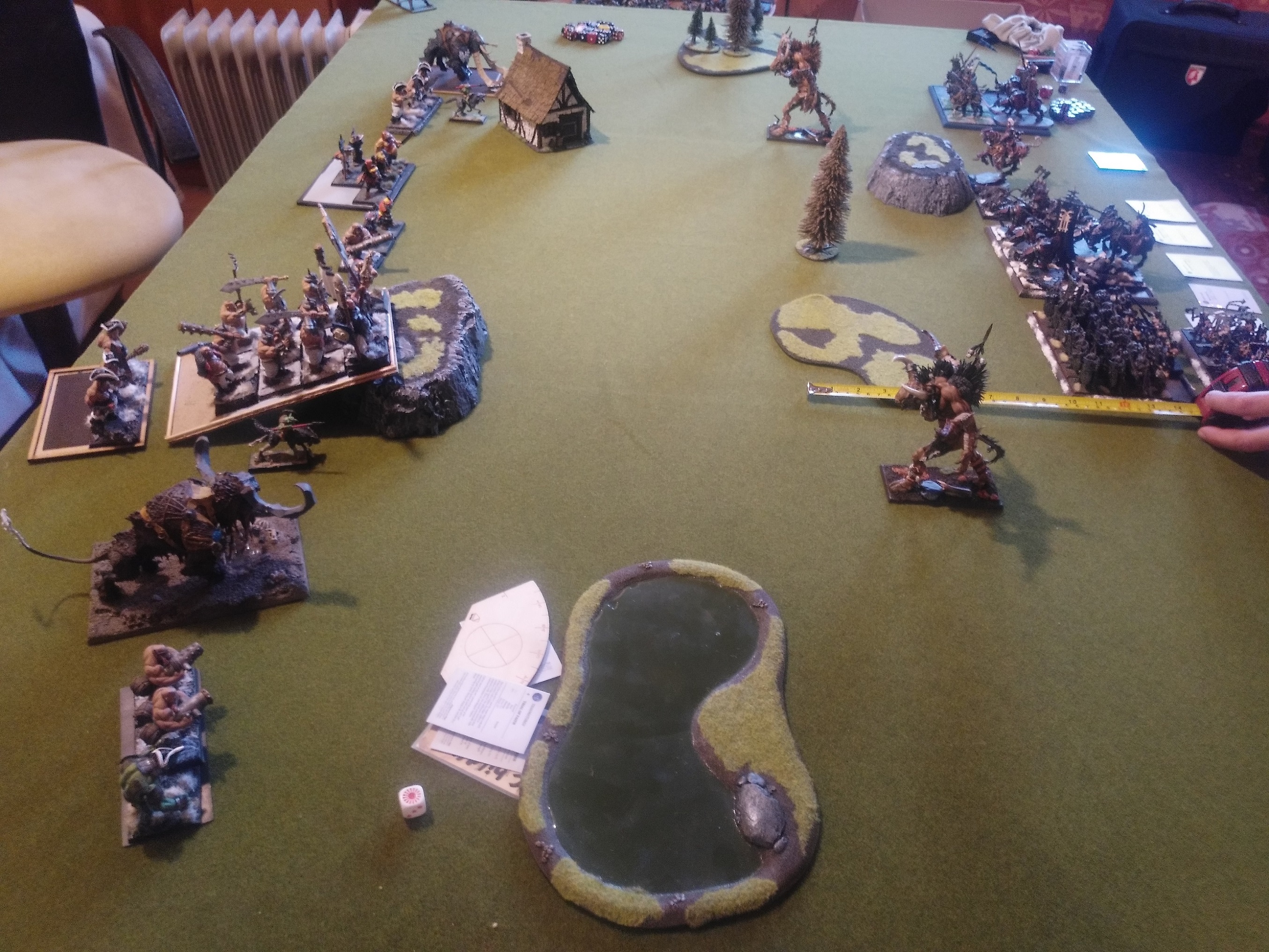 also wählte ich den Wald linksaußen vor meiner Aufstellungszone als zu beschützendes Geländestück und er den Fluss ganz auf meiner rechten Seite. Ich quetsche den Großteil der Preußen-Oger in die linke Ecke, um länger auf seine Monster und Crusher schießen zu können.