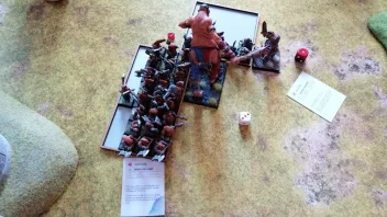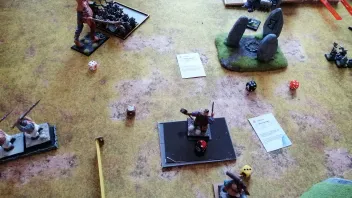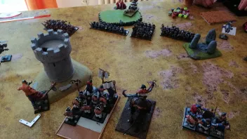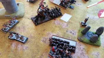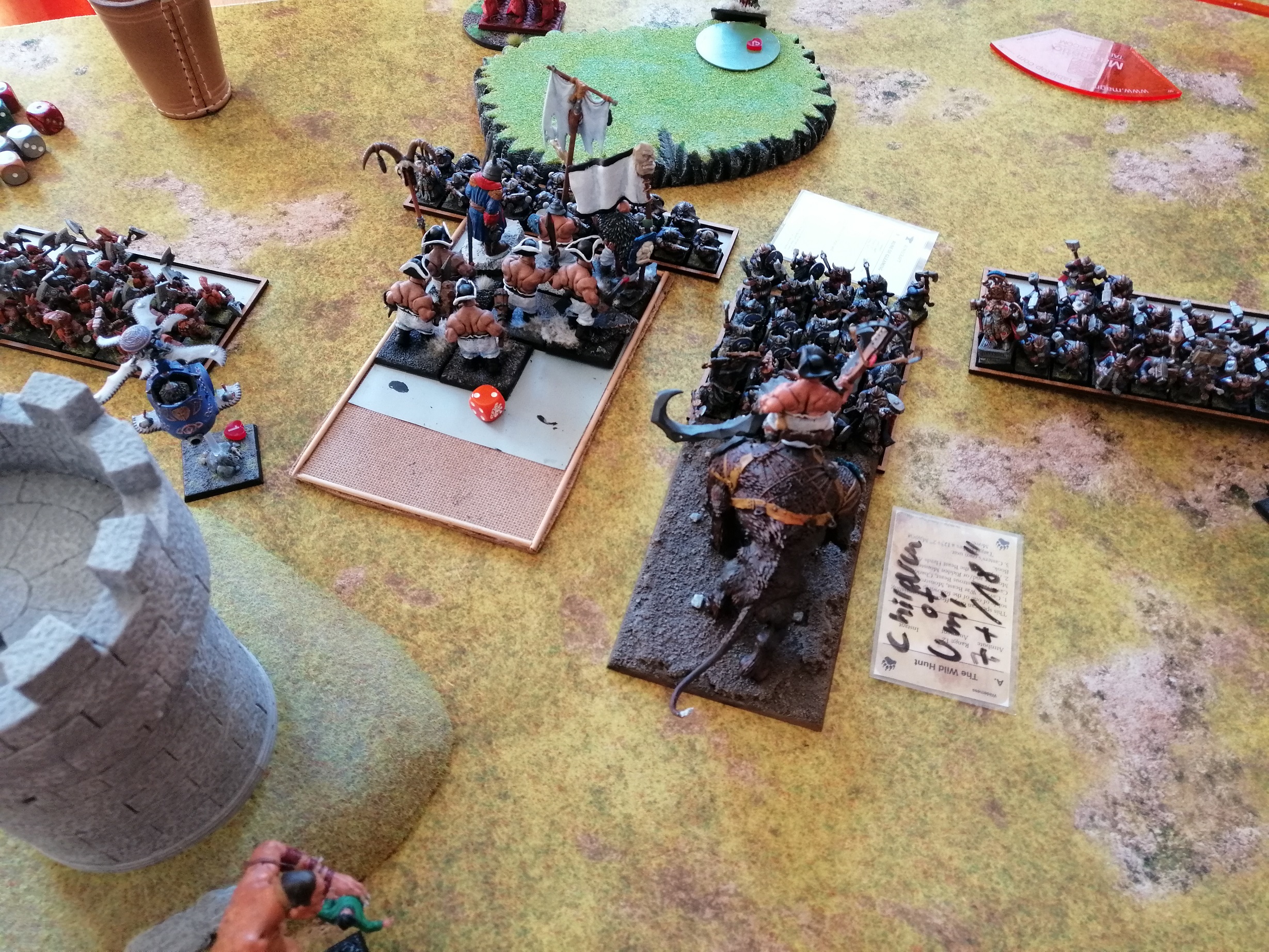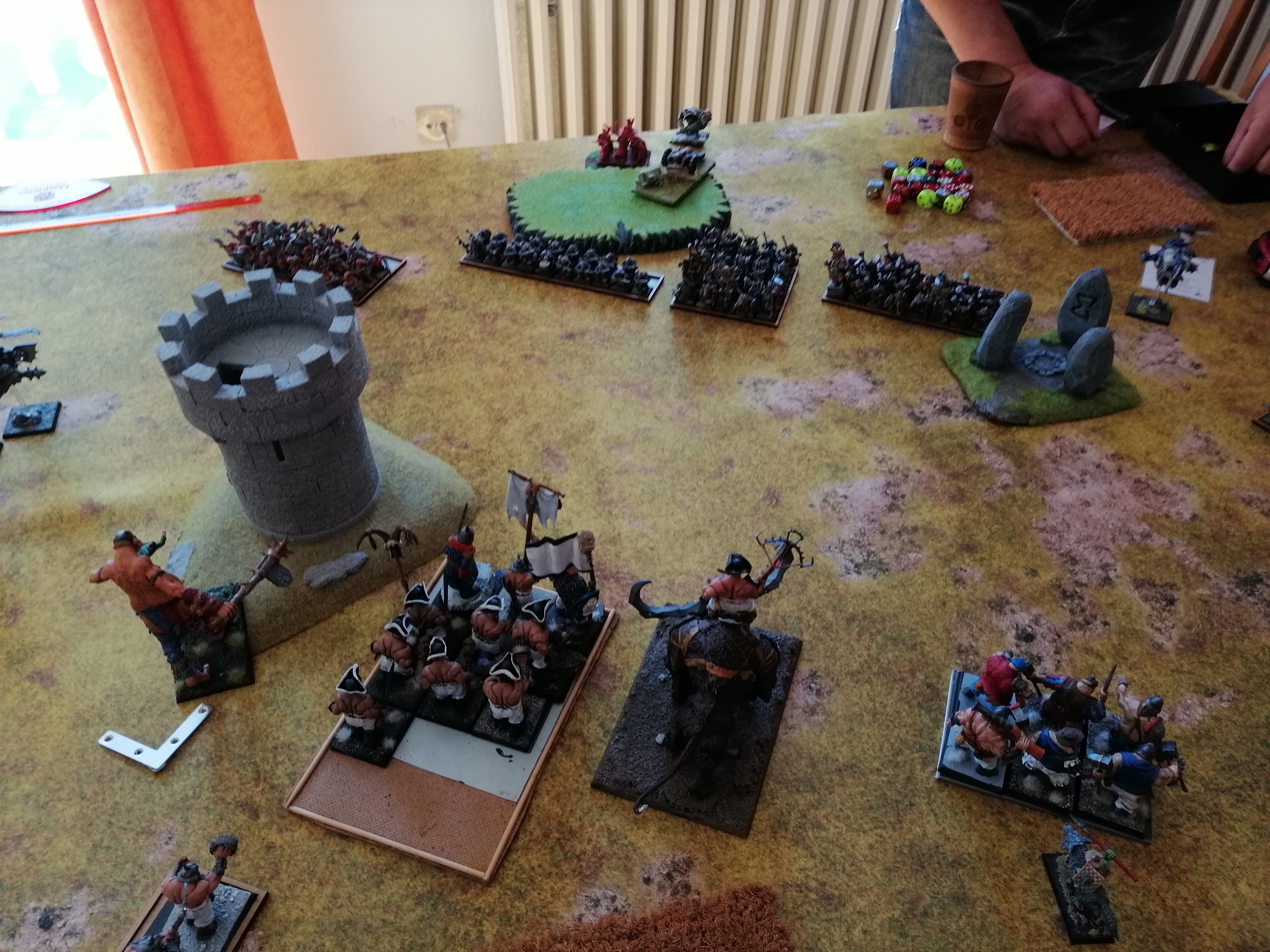 Mein setup kennt Ihr ja schon mit den drei Riesen, den beiden Jägern zu Fuß und auf Yak, den beiden 3er Trupps an langen Kerls(bruiser),