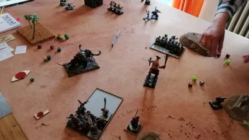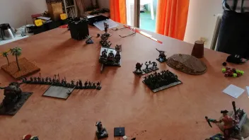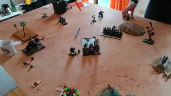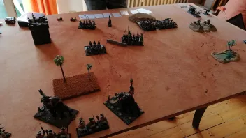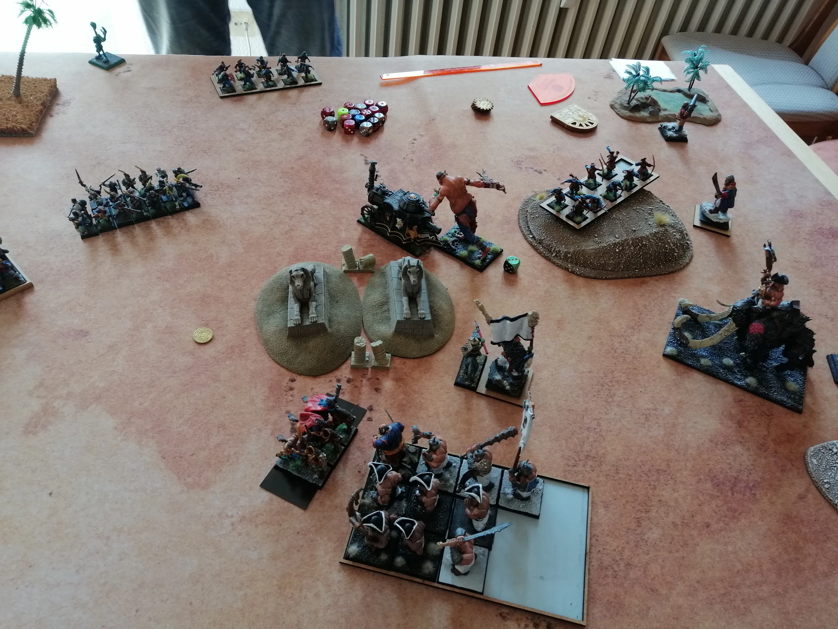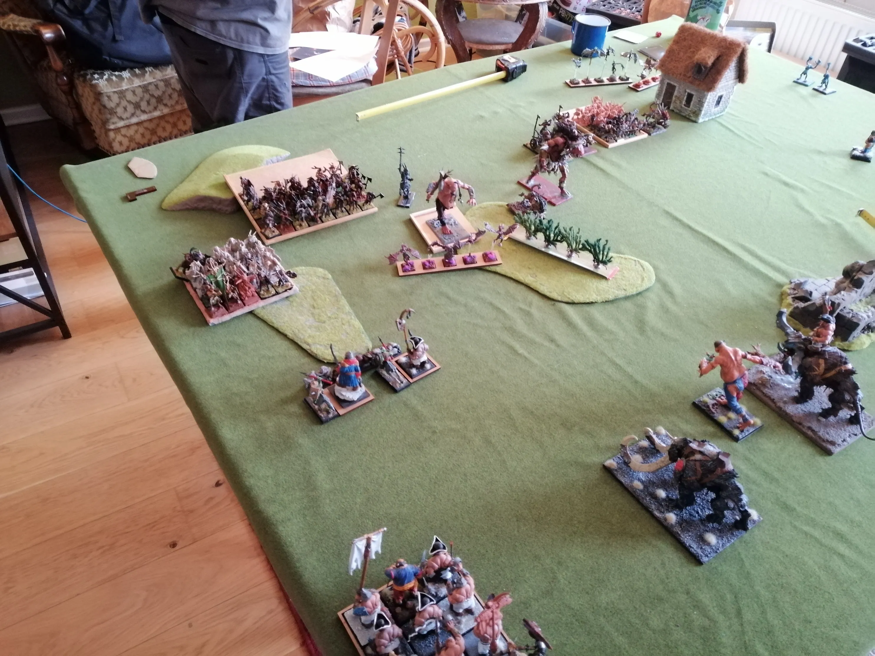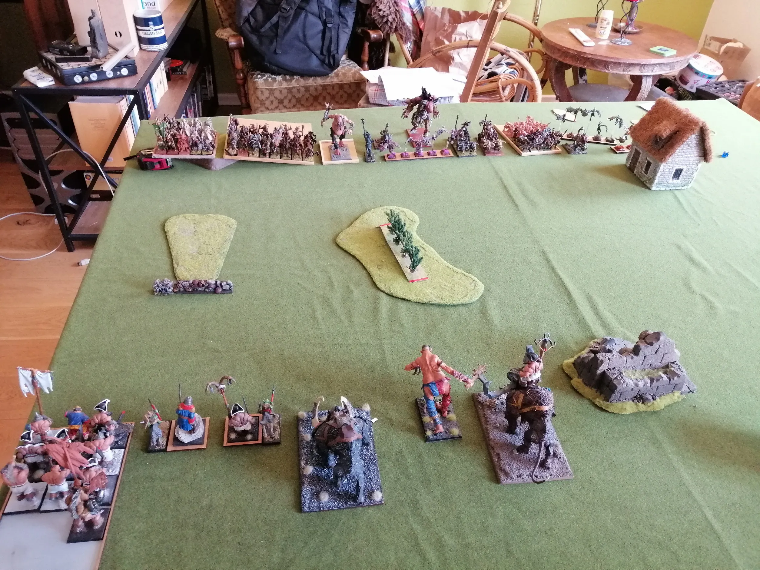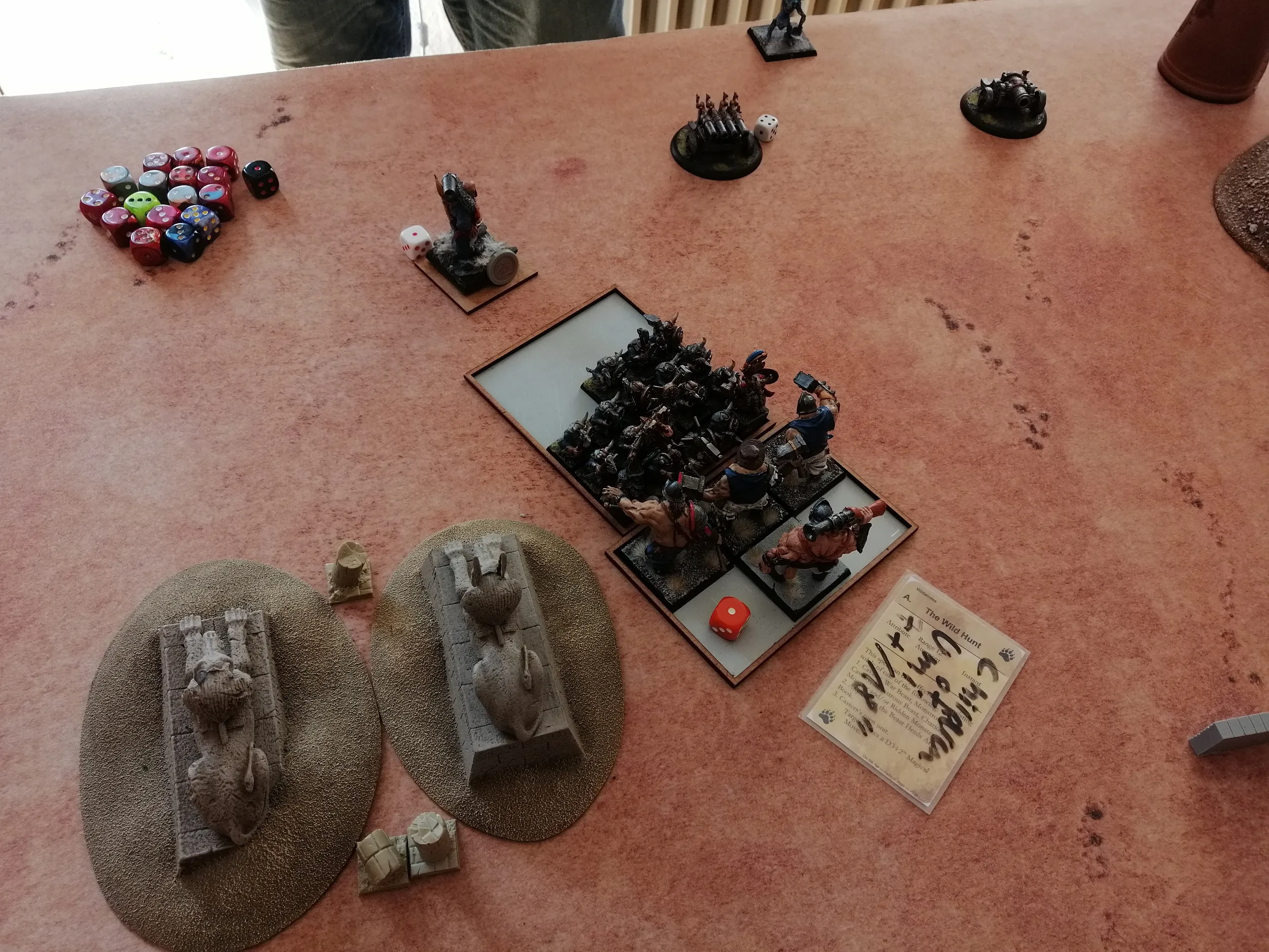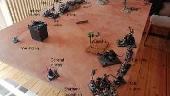 Während sich auf den beiden Flanken die Varkholags und meine Jäger und der Riese gegenseitig in Schach halten,