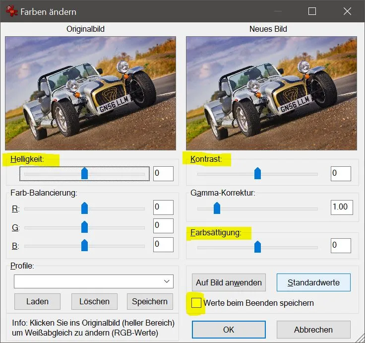 Wenn Du dann noch die Checkbox "Werte beim Beenden Speichern" angehalt hast, hast Du deine Einstellungen für das nächste Bild als Grundlage und bist vielleicht ohne großes Nachsteuern schon okay.