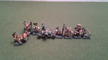Im anderen die komplette Kanonen Abteilung des Regiments. 18 Wummen, 21 Gespanne, 225 Dawi. Macht auf der Gegenseite eine Mords Sauerei -