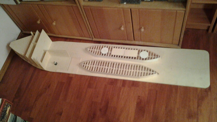 Im letzten Bild die Rümpfe der beiden Schwesterboote. Darunter ist nicht etwa ein angefangenes Ikea Regal, sondern die Rumpfplatte des Kopterträgers Ägir. Hab mal einen Dawinauten draufgestellt zu Größenvergleich. Der Pott wird 160 cm lang. Wie groß der Schlachtkreuzer " DONNERKEIL " wird sag ich euch nicht, ihr glaubts eh nicht. -