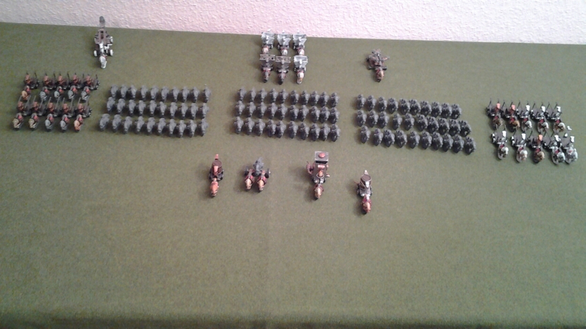 3 Kernherden, 3 Eliteherden 2 Kriegsmaschinen und diverse Chars. General ist ein Leithengst auf Deichsel. -