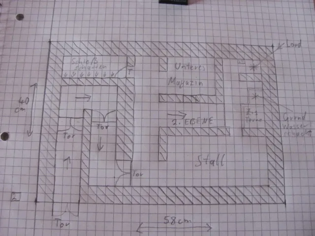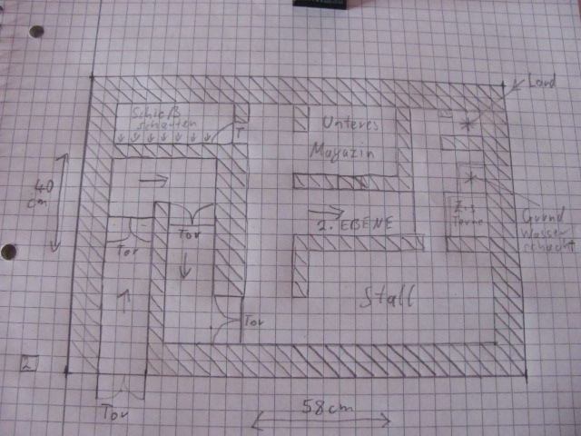 Die erste Ebene wird ausser Magazinen und Schlafräume der Zwerge, einen Grundwasserbrunnen mit Dampfpumpe und Brennstofftanks enthalten.