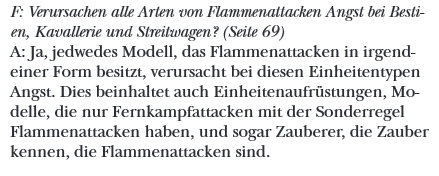 Zum Thema Flammenattacken und Angst kann ich wärmstens den 2 Absatz im Regelbuch zu Flammenattacken ans Herz legen. Viele, fast alle vergessen das gerne. Aber ein Magier der Feuerlehre verursacht z.B. im NK Angst bei Kavallerie.