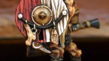 • Da würde ich fast zu nem Grau raten, da Du sowohl auf der Base als auch der Mini viele Brauntöne und zusätzlich noch rötliche Töne mit dabei hast. Oder ein gesättigtes, mattes Braun, dass nen Olivfarbenen Stich hat. Sowas wie der Marron Caqui/Khaki-Ton der Vallejo Model Reihe.