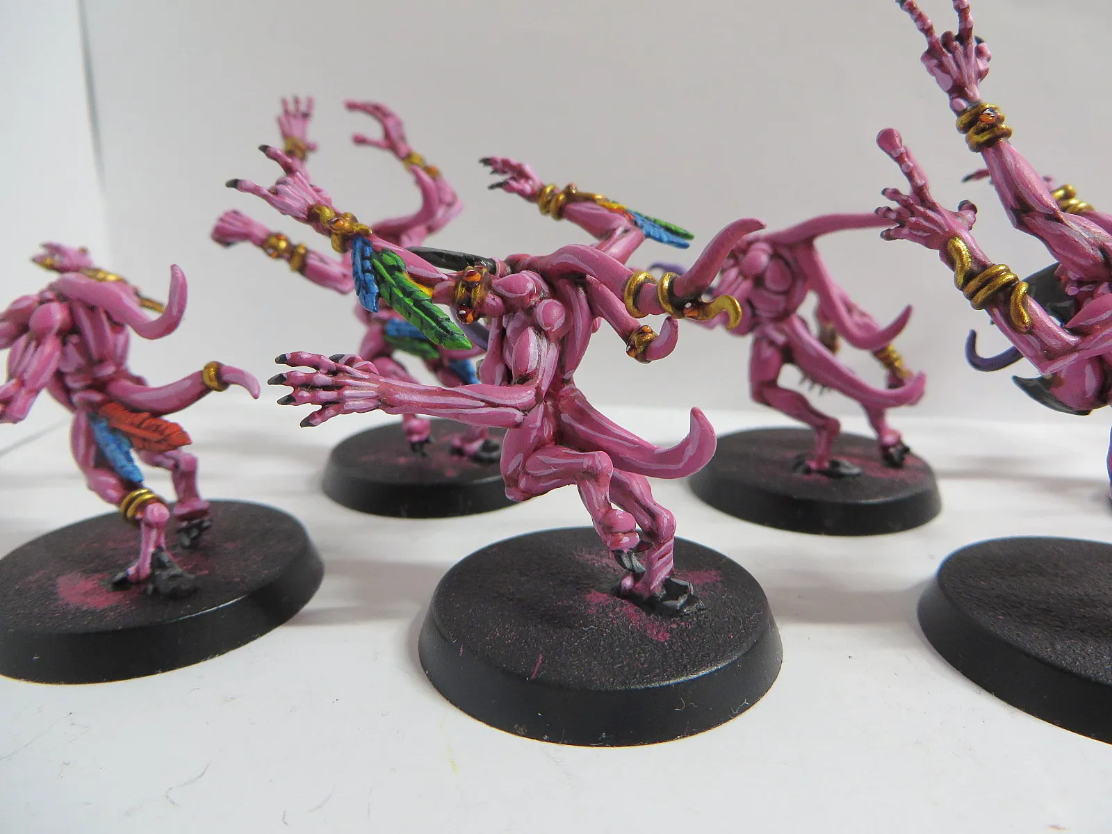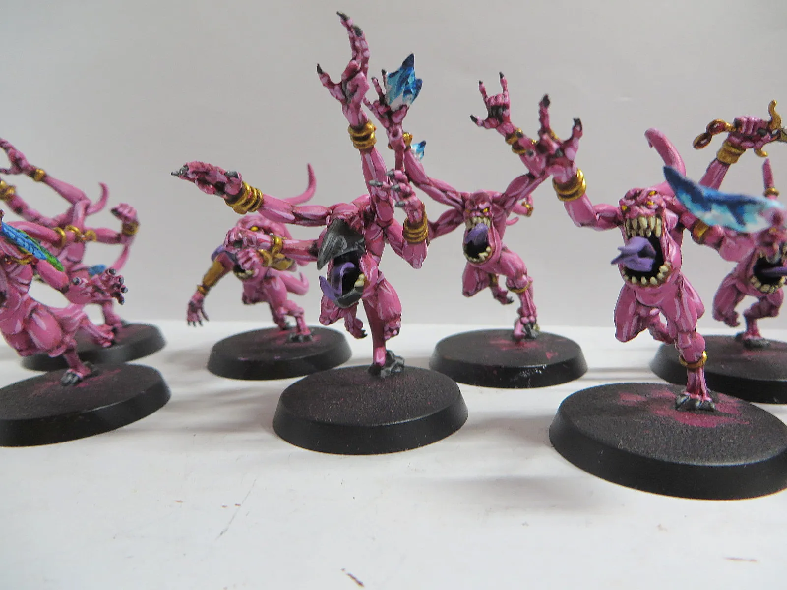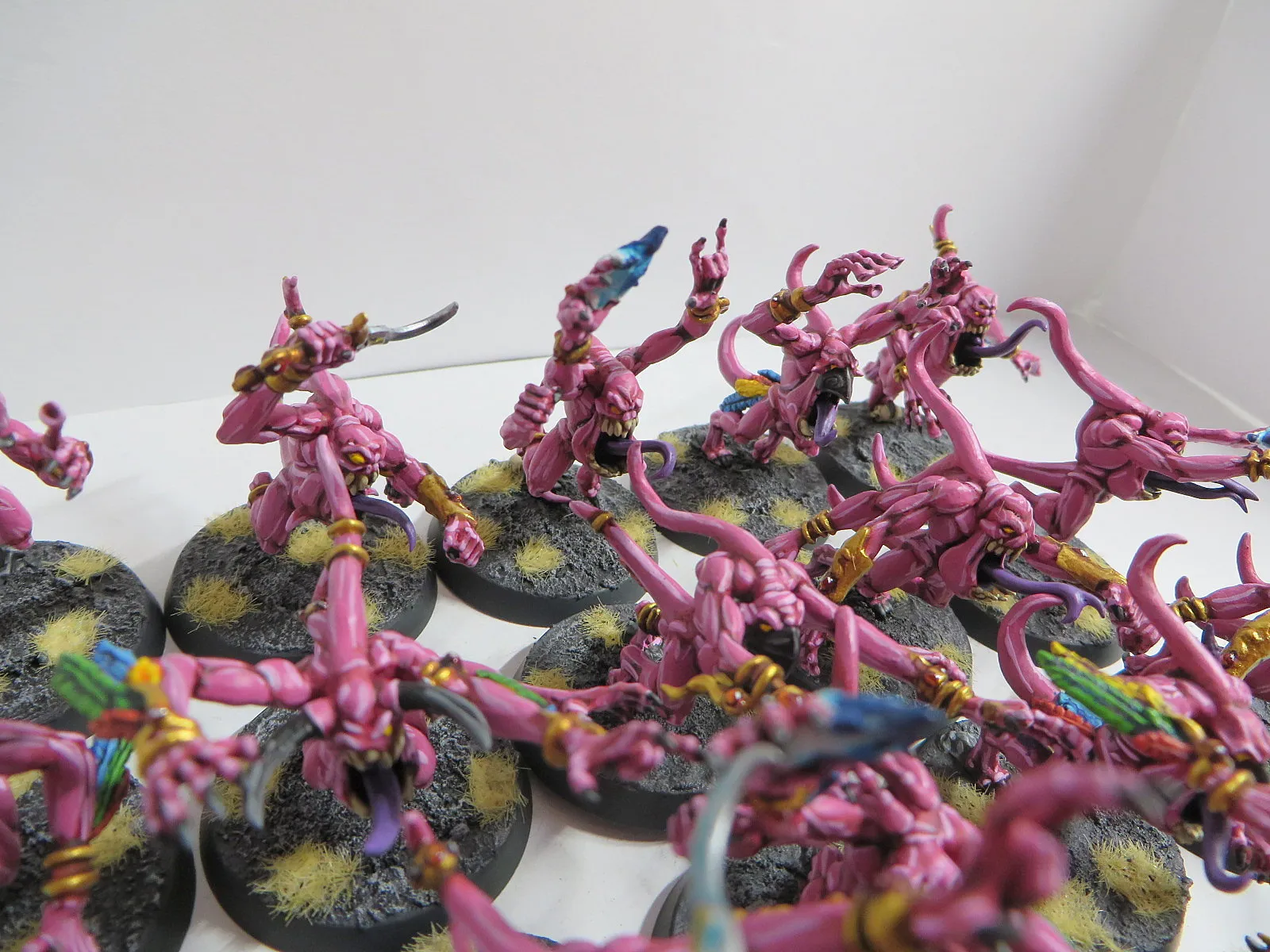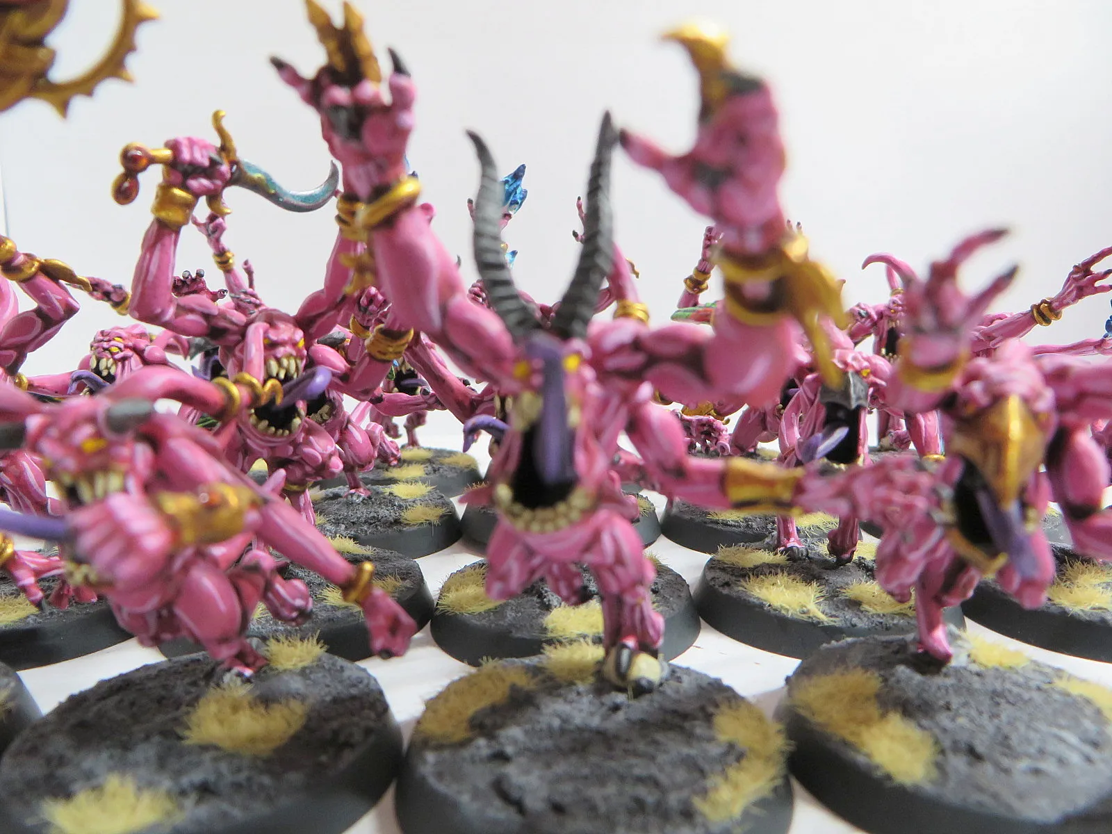 Und das Feuer hab ich bei den Rosa Horrors blau, damit es einen schönen Kontrast darstellt. Die andere Tzeentchdämonen sind ja hauptsächlich blau-weiß, da ist das Feuer dann 'feurig' (wieder als Kontrast). -