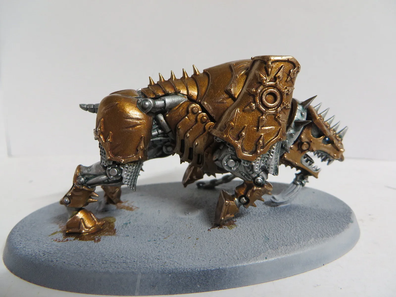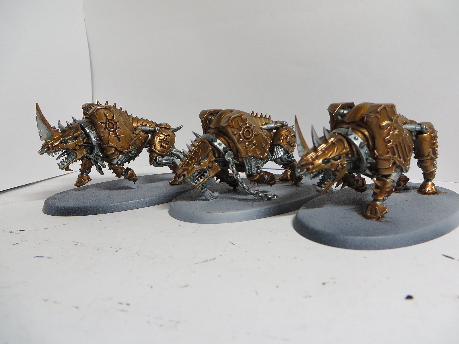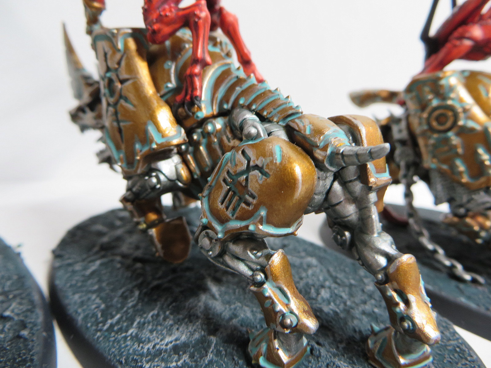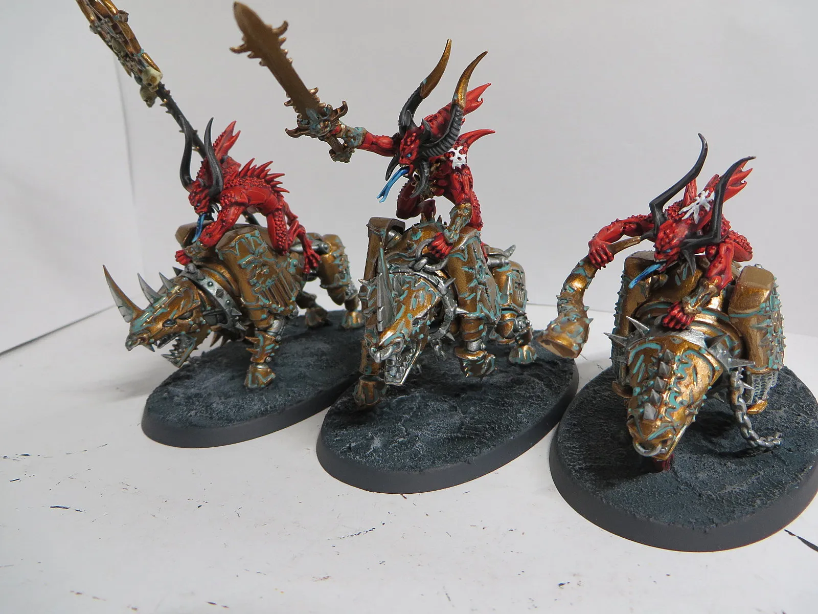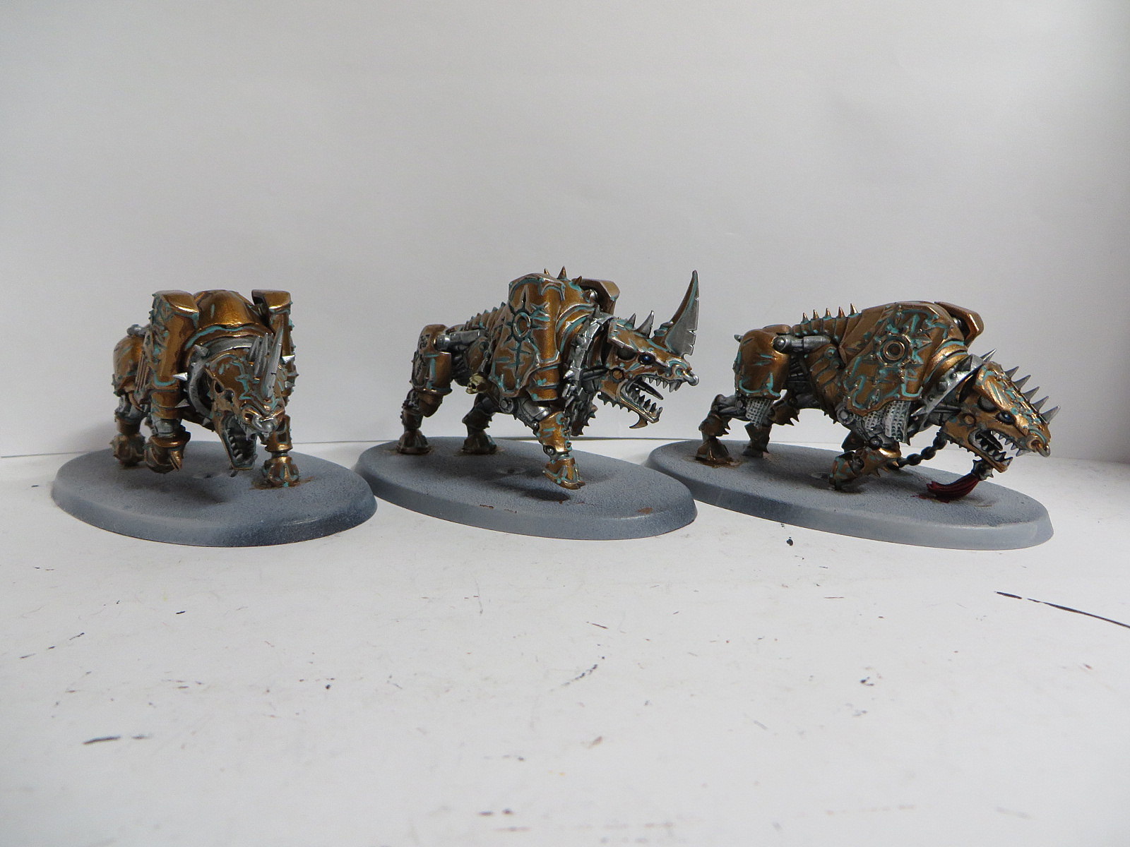 ad Bases: Bei allen Chaoten (CSM, Dämonen, AoS) habe ich Astrogranite und Astrogranite Debris verwendet. Dies dann mit Dunkelgrün getuscht und grau gebürstet. Die Baseränder sind mit Black Grey von Vallejo bemalt.