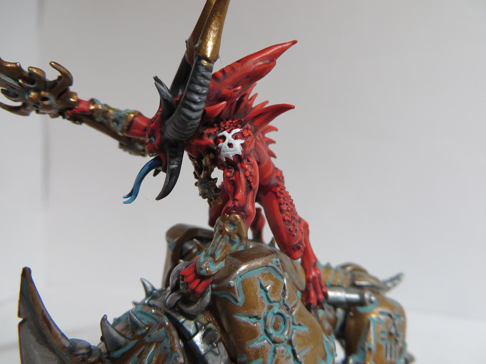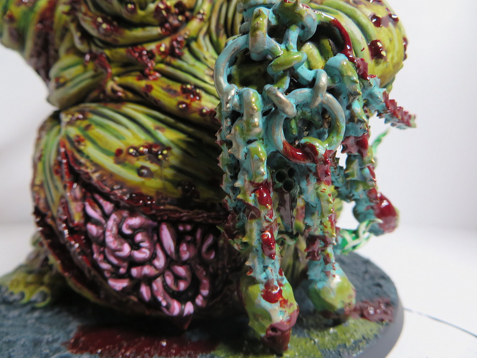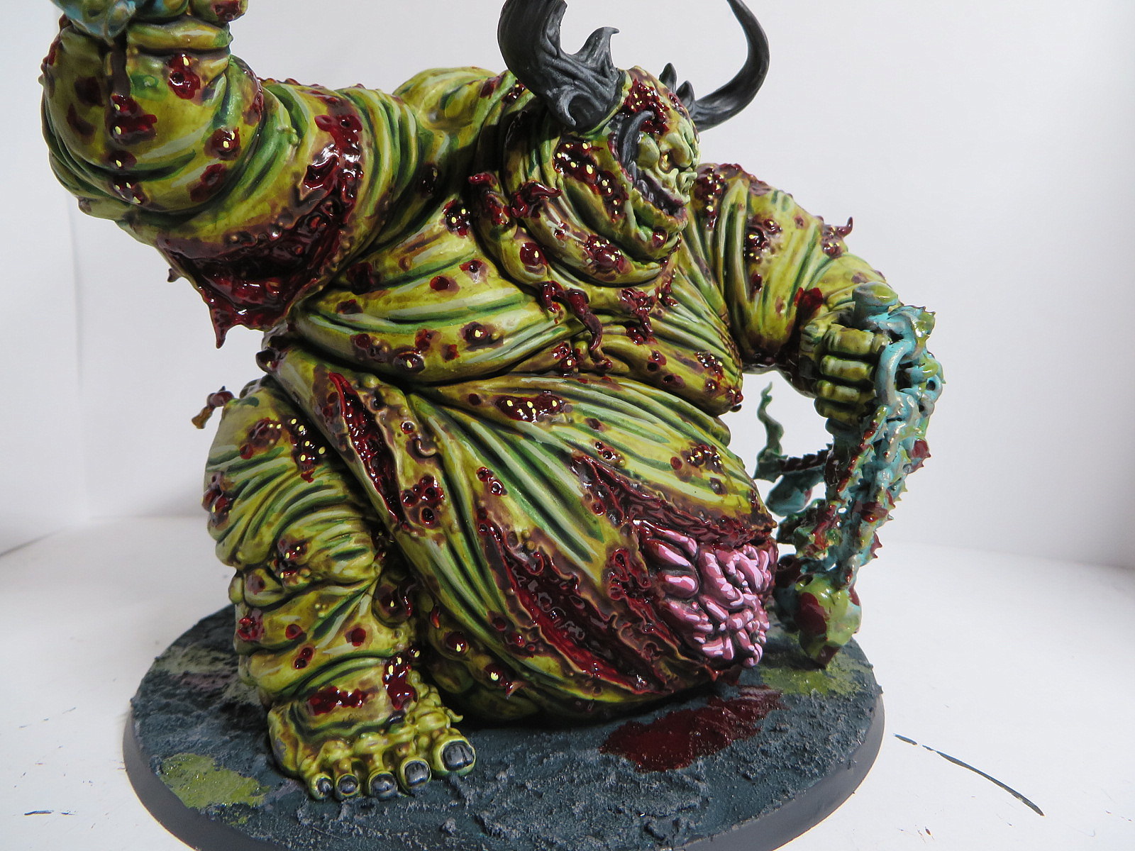 ad Gesicht: Ich habe versucht, es ein wenig heller zu akzentuieren, aber es geht wirklich etwas unter...Sonst ist Nurgle ja recht dankbar, man kann viel mit Bluteffektfarbe und Eiter zuschmieren...^^