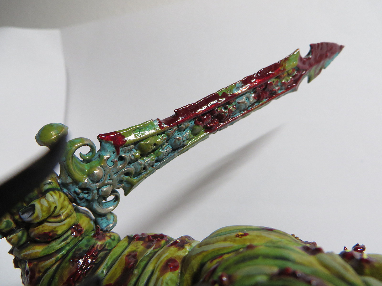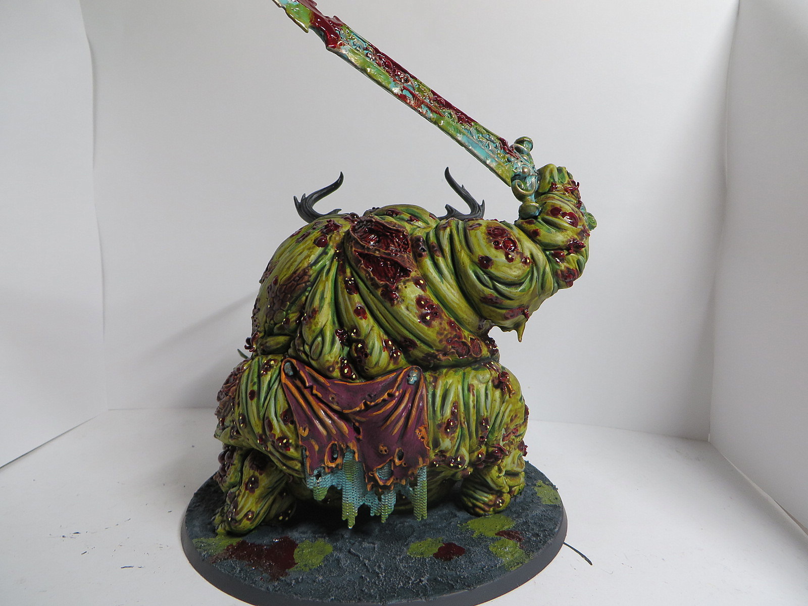 ad Gesicht: Ich habe versucht, es ein wenig heller zu akzentuieren, aber es geht wirklich etwas unter...Sonst ist Nurgle ja recht dankbar, man kann viel mit Bluteffektfarbe und Eiter zuschmieren...^^