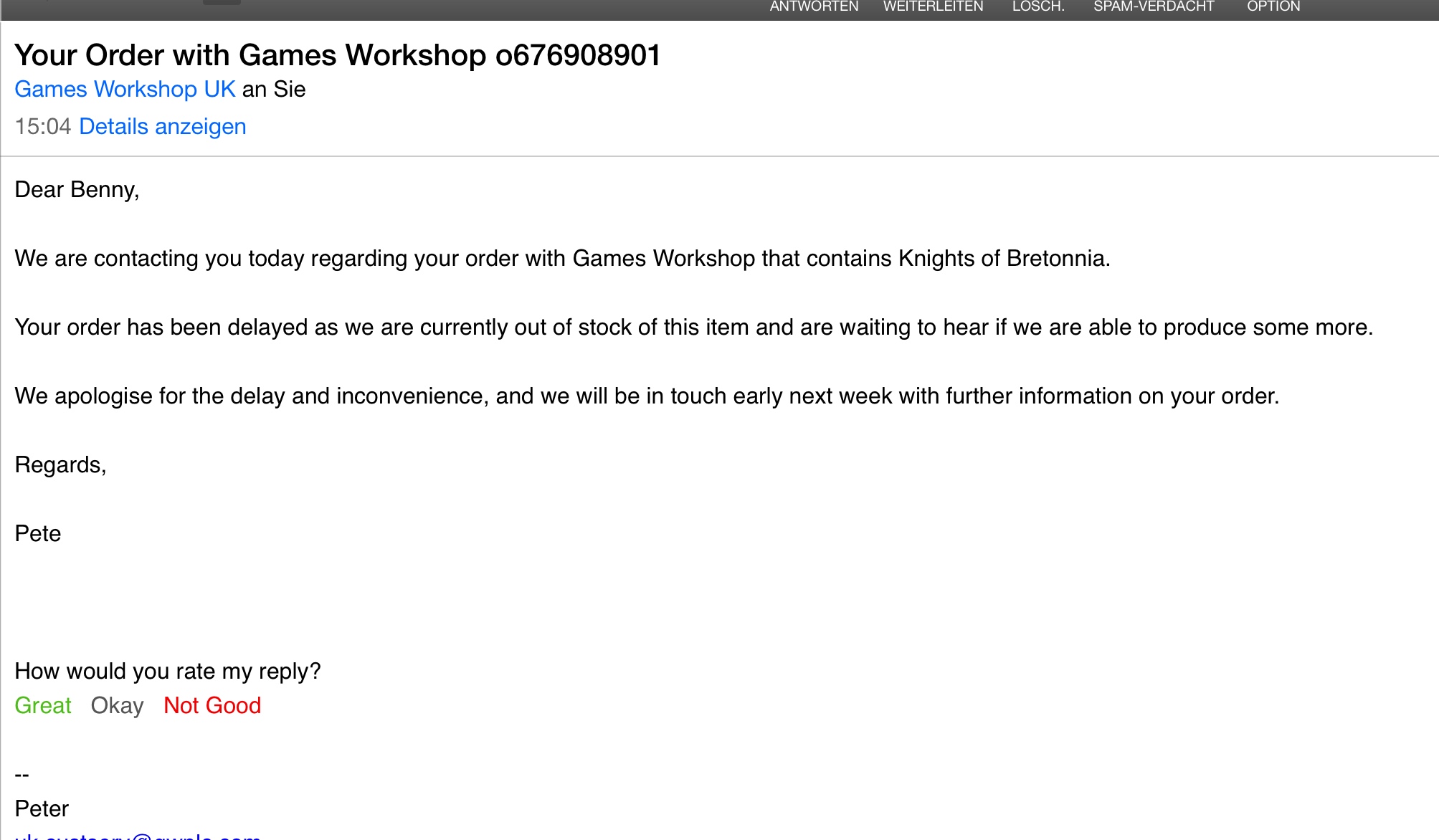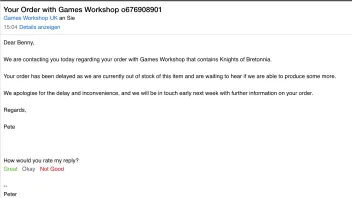 So anscheinend hat GW noch ne Box Ritter gefunden oder sie haben sogar noch welche nachgepresst. Mein Packet soll sich auf dem Weg zu mir befinden, ich bin gespannt