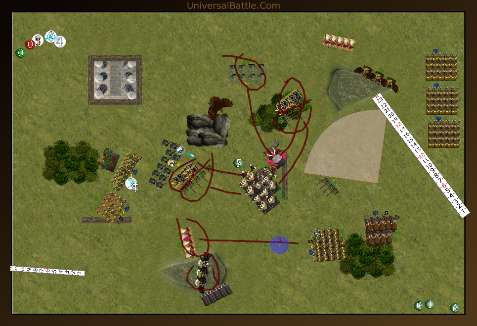 Adler Wird klar vom lord erschlagen,((hier macht er für mich einen riesen fehler......er dreht seine Front richtung tänzer somit steht rechts Kestrels+Jagd in seiner Flanke und Links Rumpel in seiner Flanke,Rücken stehen die Dryaden.))