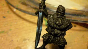Wenn der Verlauf dann halbwegs gut aussieht, schnappe ich mir einen Schwamm und tupfe mit Schwarz vorsichtig etwas Battledamage auf. Wie das geht kann ich gern mal in nem eigenen Tutorial zeigen. Außerdem male ich mit Schwarz und Weiß kleine Kratzer auf die Klinge. Der Battledamage macht die Klinge etwas lebendiger und vor allem kaschiert er hervorragend Unsauberkeiten im Farbverlauf. Danke nochmal an bucks für den tollen Tipp! ![]()