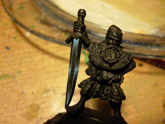 Wenn der Verlauf dann halbwegs gut aussieht, schnappe ich mir einen Schwamm und tupfe mit Schwarz vorsichtig etwas Battledamage auf. Wie das geht kann ich gern mal in nem eigenen Tutorial zeigen. Außerdem male ich mit Schwarz und Weiß kleine Kratzer auf die Klinge. Der Battledamage macht die Klinge etwas lebendiger und vor allem kaschiert er hervorragend Unsauberkeiten im Farbverlauf. Danke nochmal an bucks für den tollen Tipp! ![]()