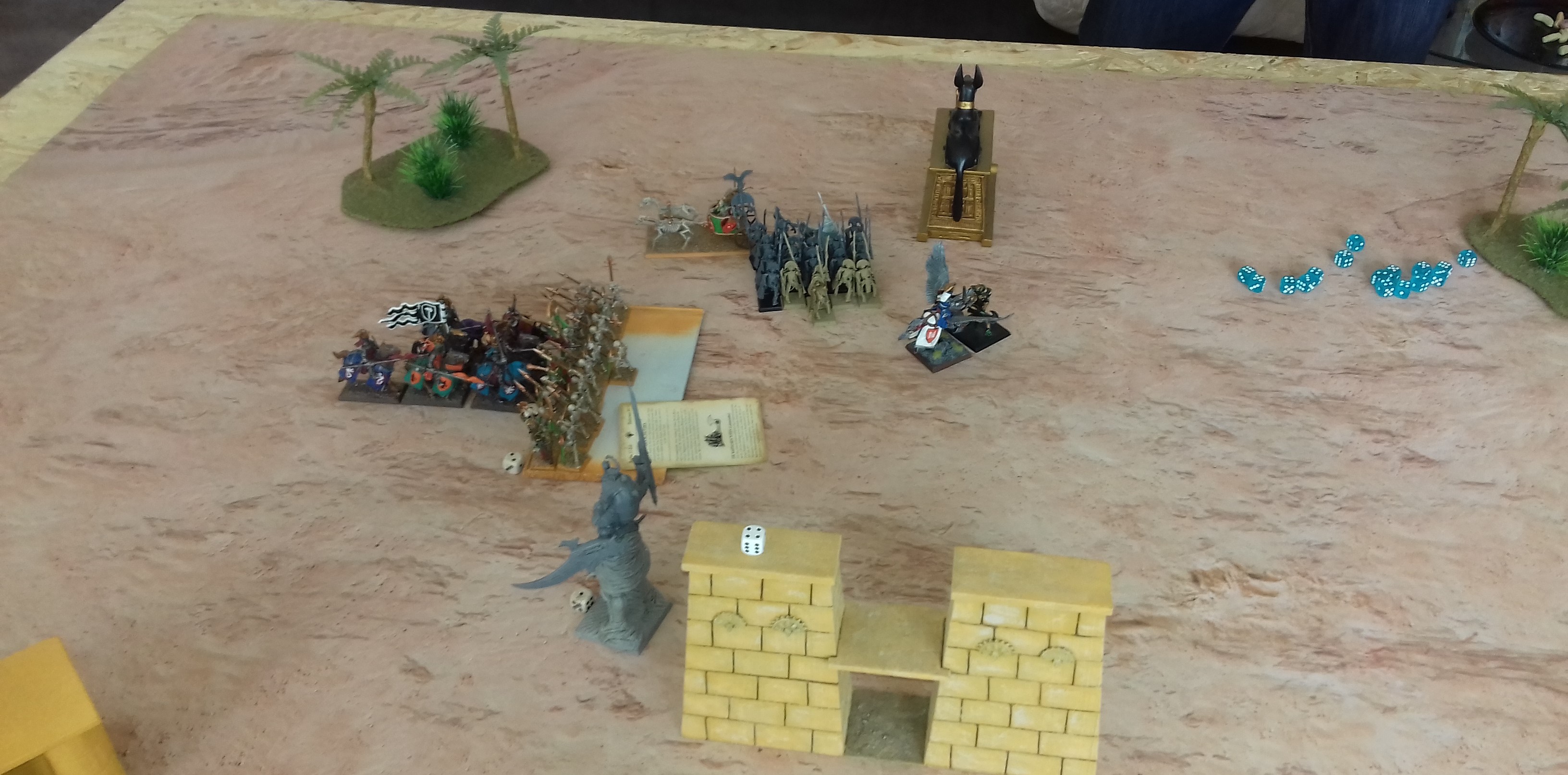 Da wir uns in der taktischen Finesse nahezu ebenbürtig waren und auch die Würfel recht ausgewogen mitspielten (in den ersten beiden Runden waren sie mehr mir gewogen, in der dritten und vierten Runde deutlich meinem Gegner und der fünfte und letzte Spielzug war ziemlich ausgeglichen) wäre es wohl auf ein Unentschieden hinausgelaufen...Da wir aber die Aufstellung der Skelette zu Beginn verpeilten, hatte ich zu wenig Möglichkeiten, die 625 Punkte auszugleichen und so wurde es ein knapper Sieg für die Wüstenkrieger auf ihrer hübschen (Fotos folgen sicher noch) Platte!