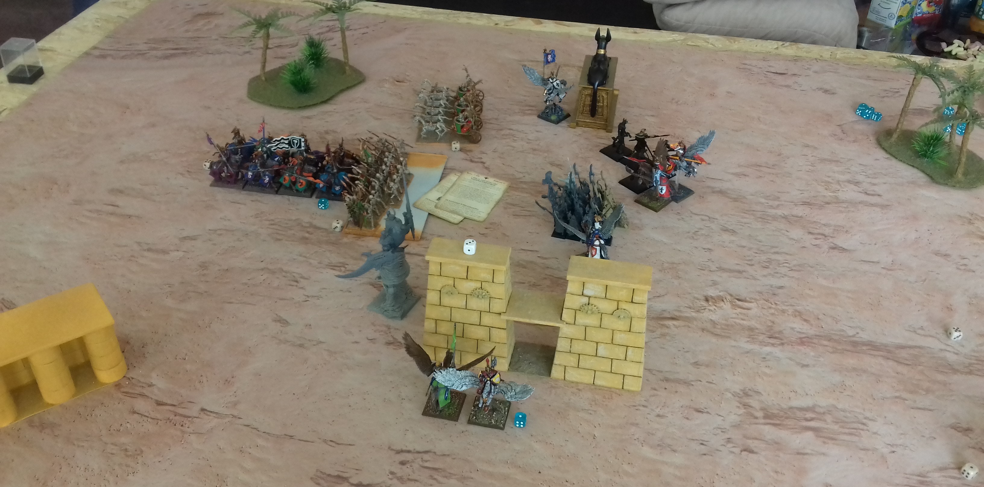 Aber weiter geht’s, nächster Speilzug Bretonen Pegasusreiter greifen Horrors und Dämonetten an, natürlich schaffen Arthurius Ritter ihre Angriffsbewegung und gelangen in den Rücken meiner Dämonetten(gut die hatte ich scheiße ausgerichtet und die Reichweite der Bretonen völlig unterschätzt). Diese hauen erstmal zwei Ritter aus den Sätteln und verwunden einen Pegasus, müssen danach aber ordentlich einstecken.