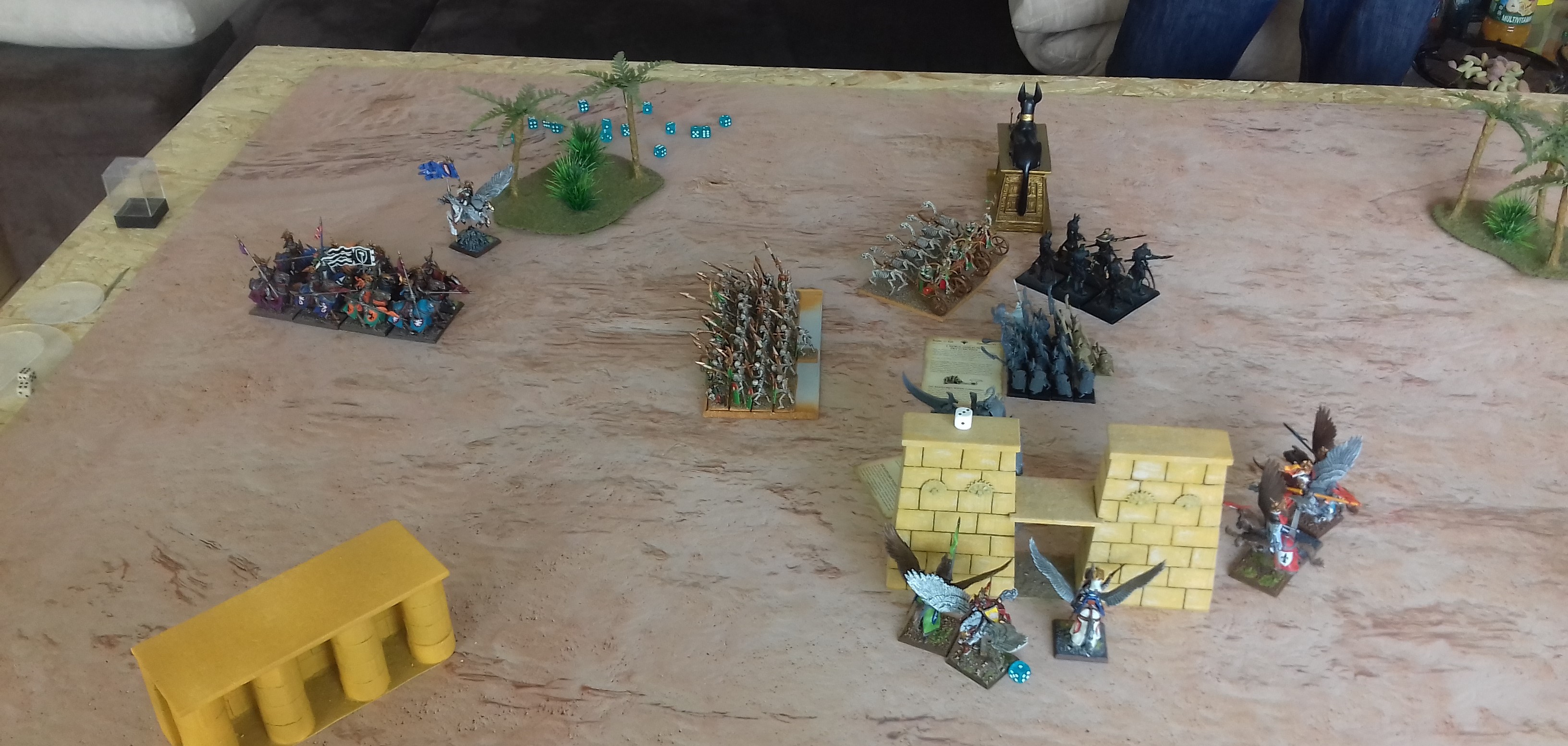 Der Nahkampf Pegasi, Slaaneshbestien war wenig aufregend, man schlug aufeinander ein, ich verlor 5 LP durch Instabilität, das übliche halt. Am Schluß standen noch 4? Pegasi, der Paladin und eine Slaaneshbestie.