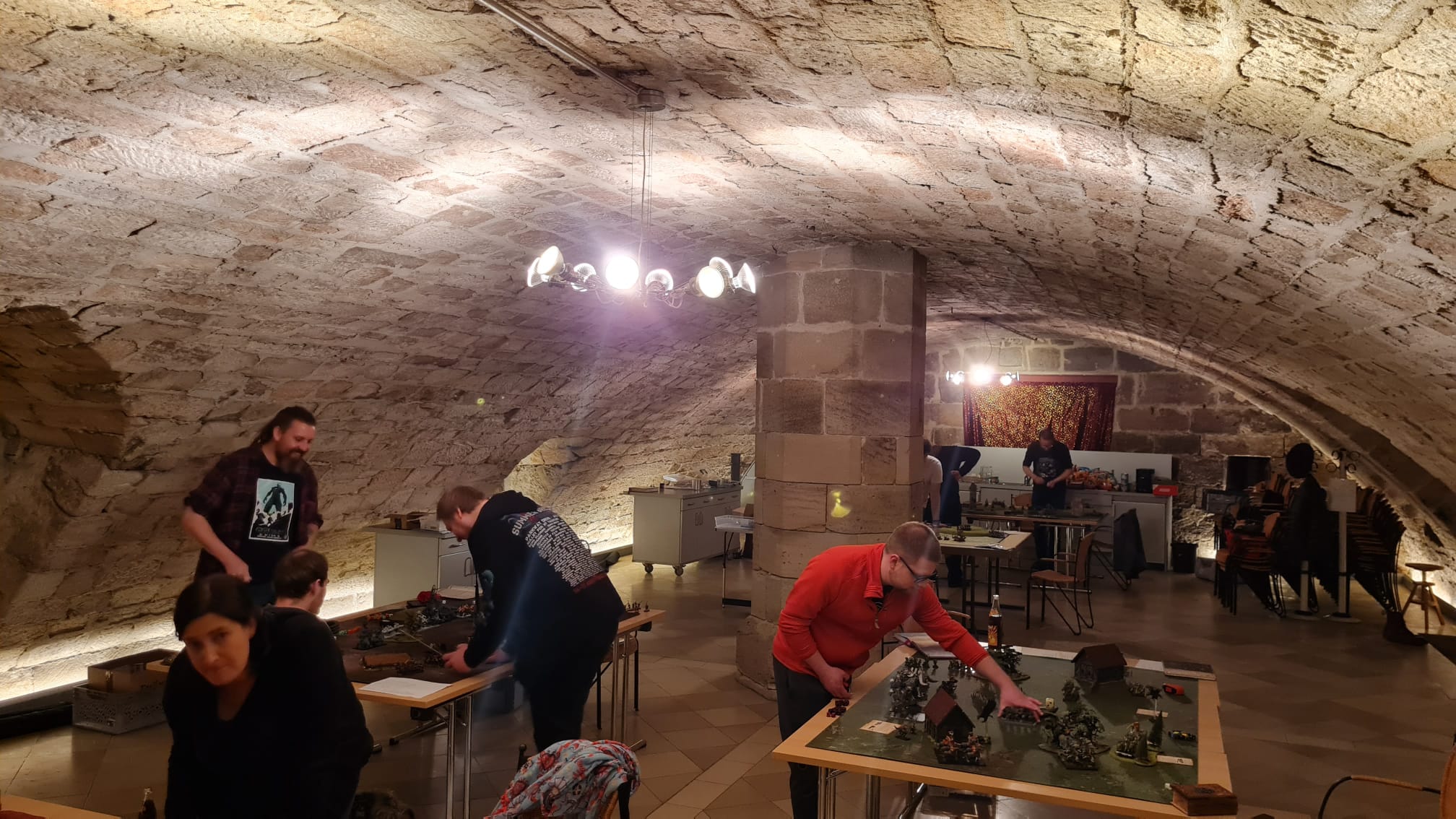 Die runde Decke, das Gemäuer, die kleine in Stein gehauene Kapelle, die Schießscharten zum Hof hinaus...All das umrahmte die fünf Spiel-Tische, an denen die zehn Teilnehmer*innen ihre Truppen ins Getümmel warfen!