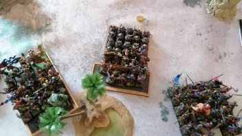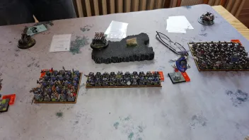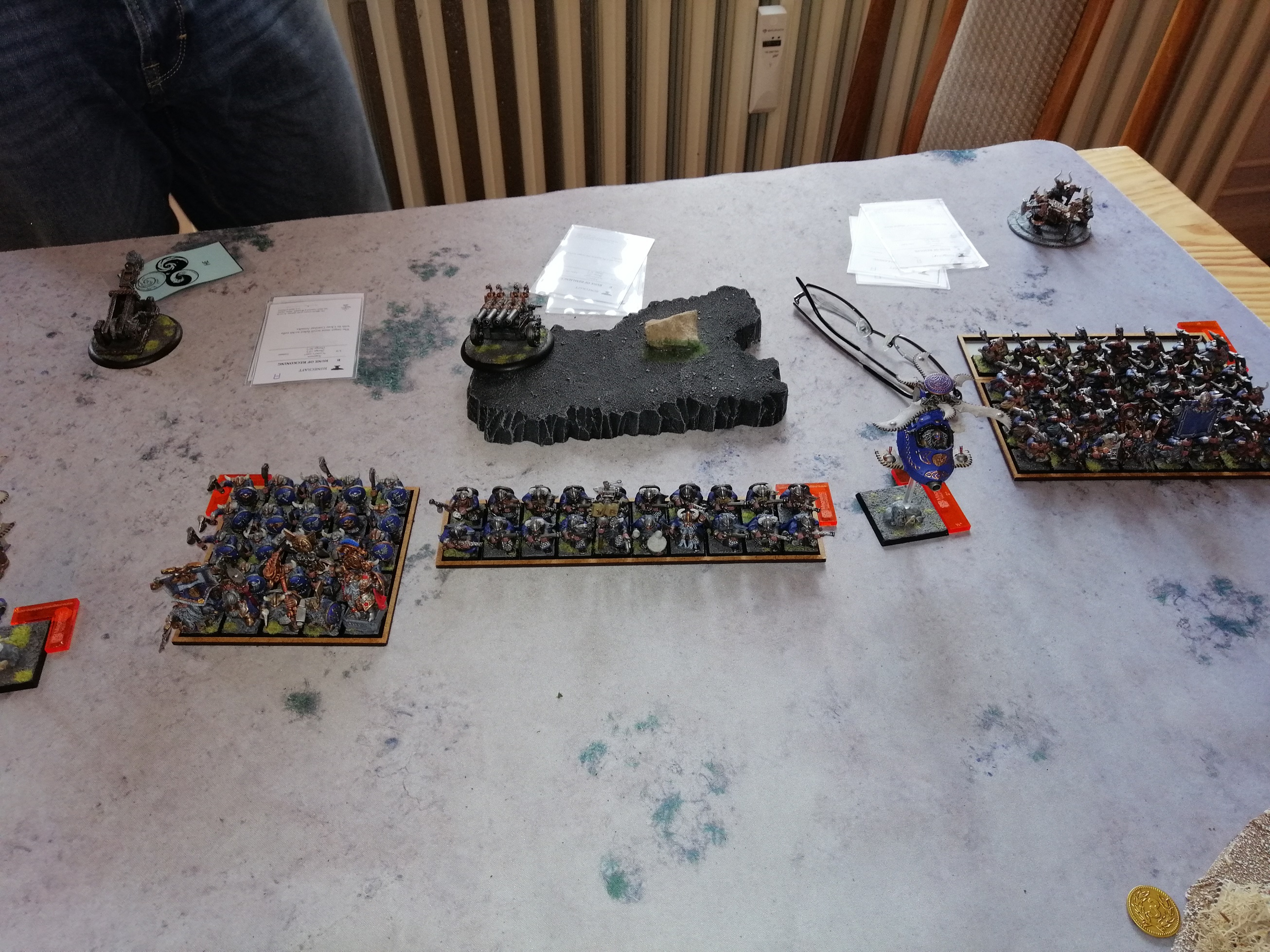 Alles muss man selbst machen, sagt sich der Zahlmeister. Ihr seht im Bild oben hinter dem Orktotem die Schützeneinheit der Zwerge.