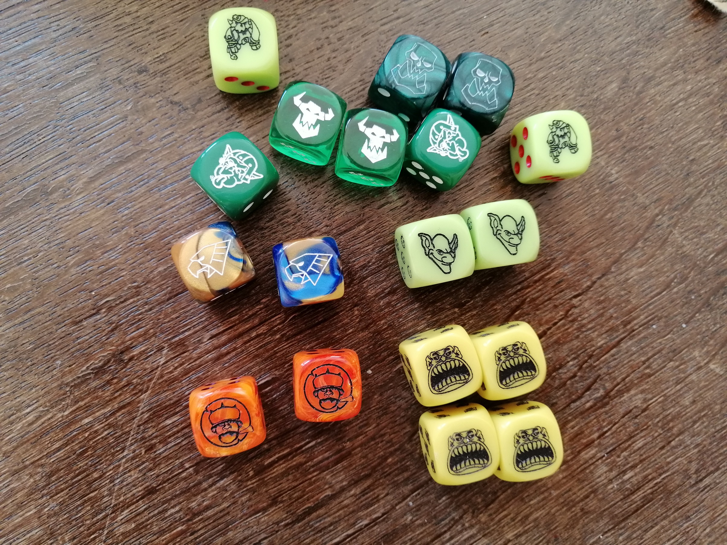 Unten links sind die Halbling-Würfel, der Rest stellt Orks, Goblins, Oger und äh, Adler da(für eine menschliche Fraktion).