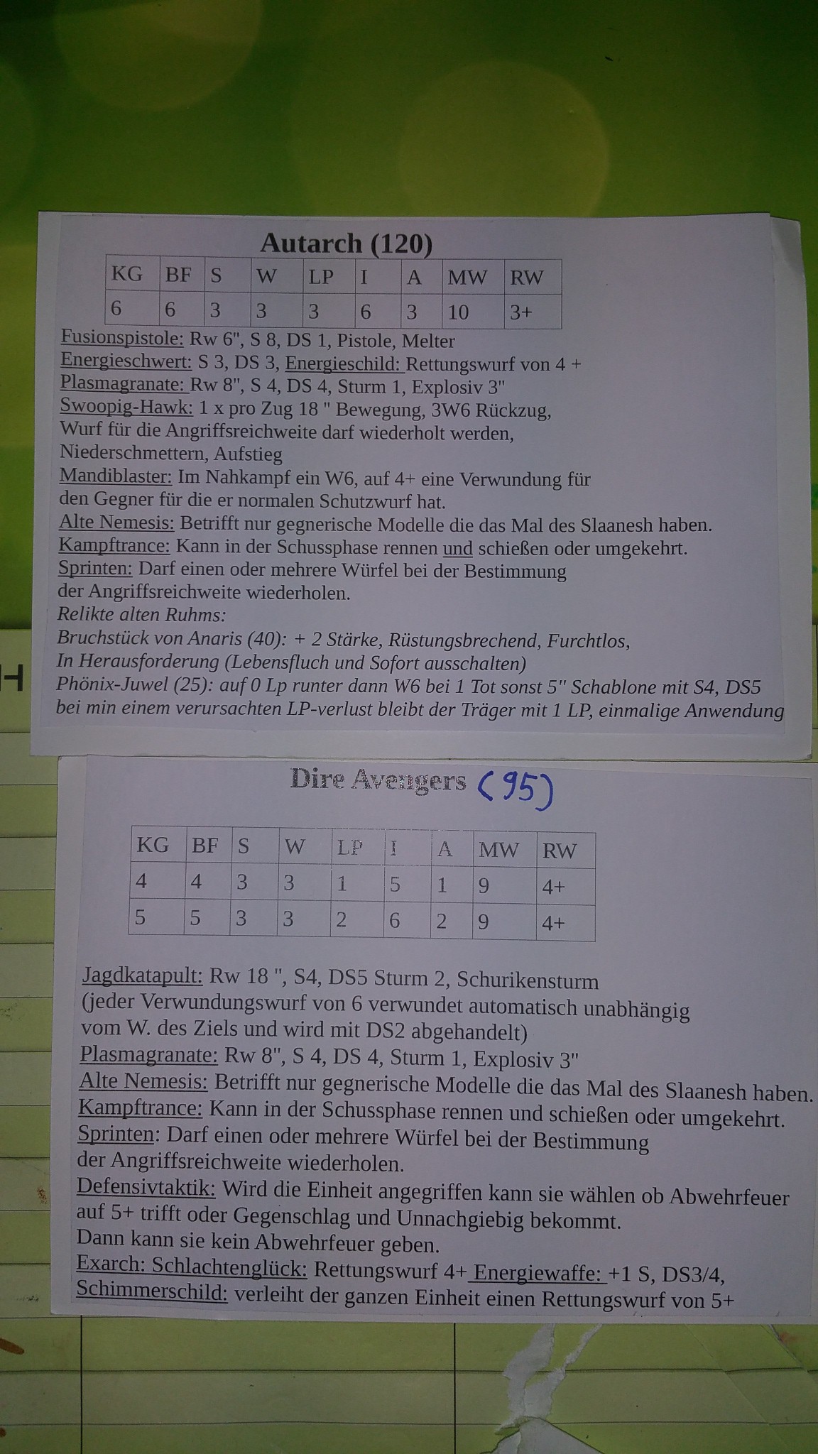 Soeben habe ich mit der des Wraithknights endlich die letzte Karteikarte für die Truppen des Sohns fertiggestellt.