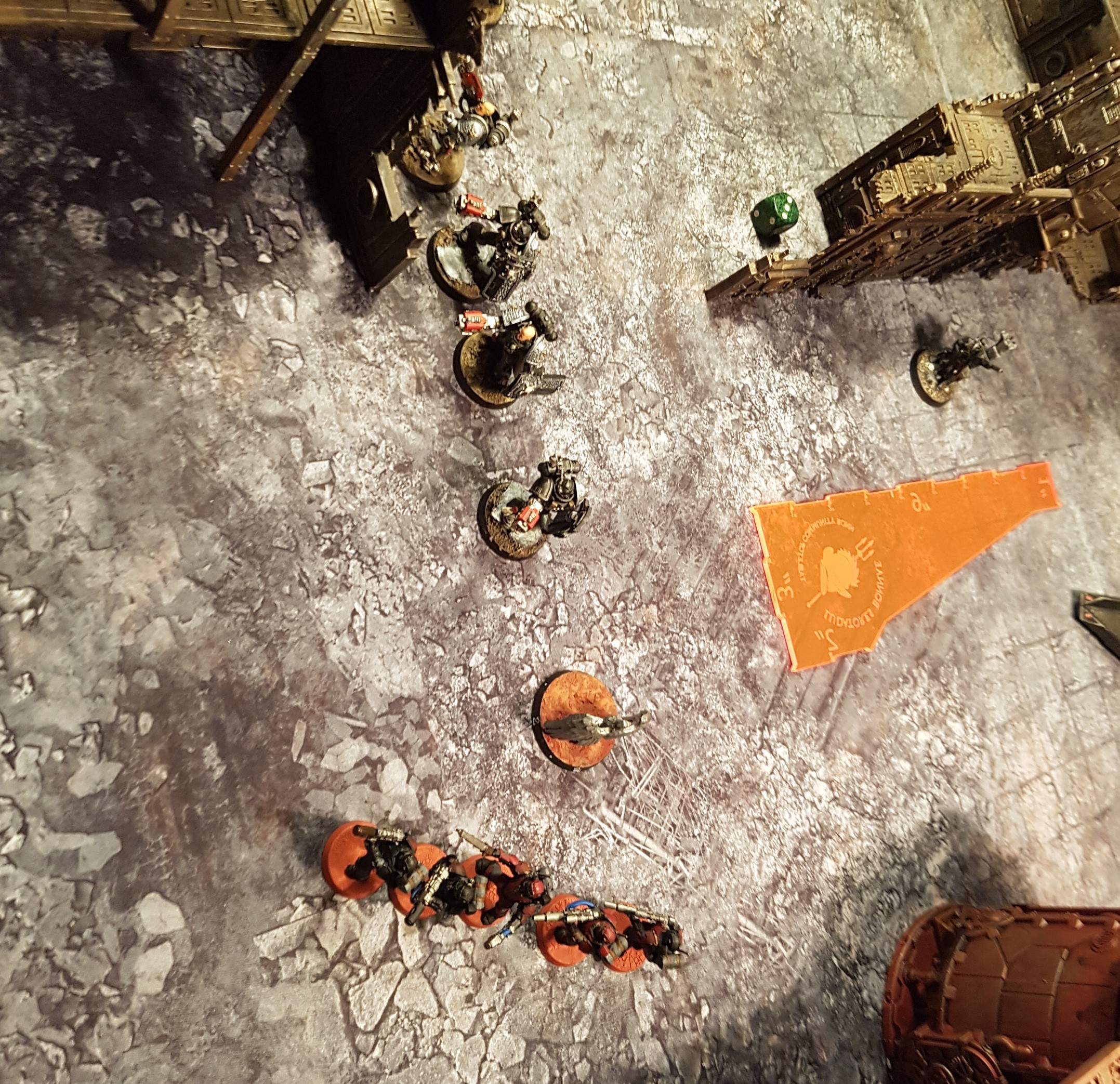 Taktisch war mein Vorpreschen auf jeden Fall super gut. Durch die 14 Zoll Bewegung der Tauroxe kommen die schon ganz schön nach vorne. Die Läufer besetzen die Zone dazwischen. Dadurch muss sich der Gegner erst mal mühsam voran arbeiten. Wenn ich an der rechten Seite mit dem Sentinal nach rechts gerückt wäre anstatt dem Taurox zu folgen, hätte sein Dropod gar nicht in meine Flanke gekonnt. Hätte er den 1. Zug gehabt, wären die Kapseln direkt vor meiner Nase gelandet und hätten dadurch unheimlich viel Druck erzeugt.