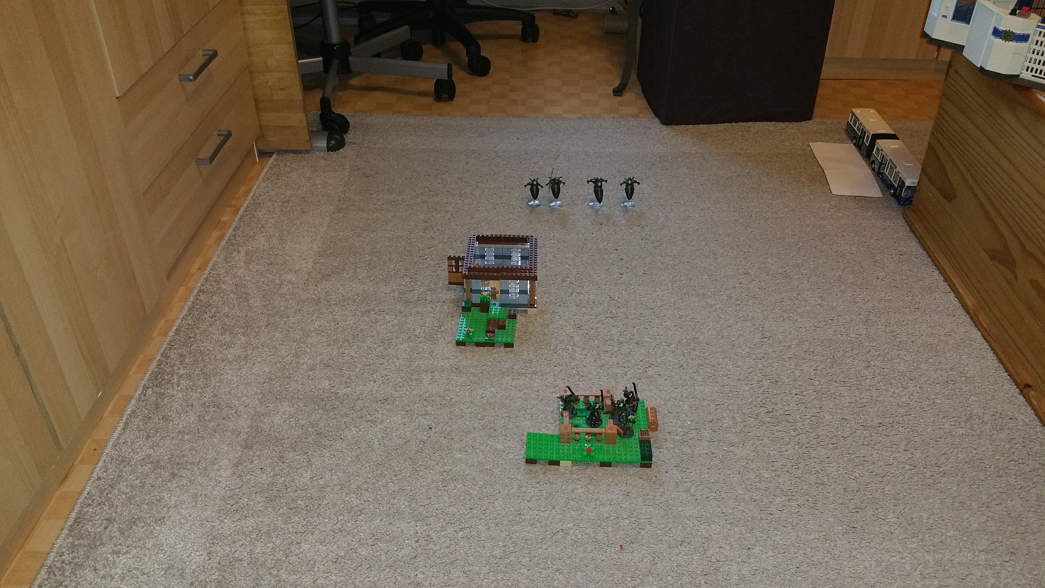 Ich hatte eigentlich gehofft das ganze am Samstag im Shop durchzuführen. Aber das hat leider nicht geklappt. Am Sonntag hatten wir dann mal eine gute Stunde Zeit und haben auf dem Teppich in seinem Zimmer mit improvisiertem Gelände aus Lego gespielt.