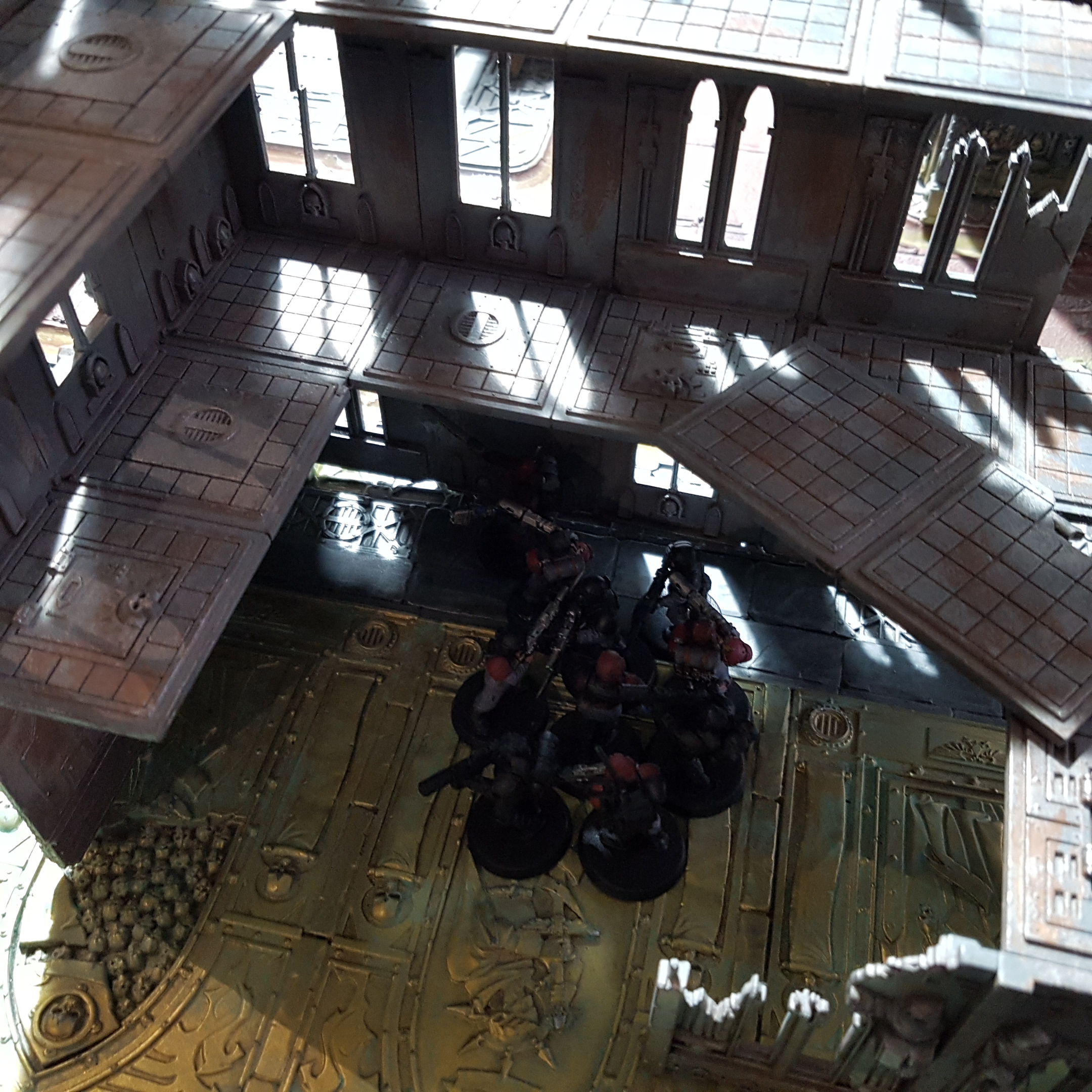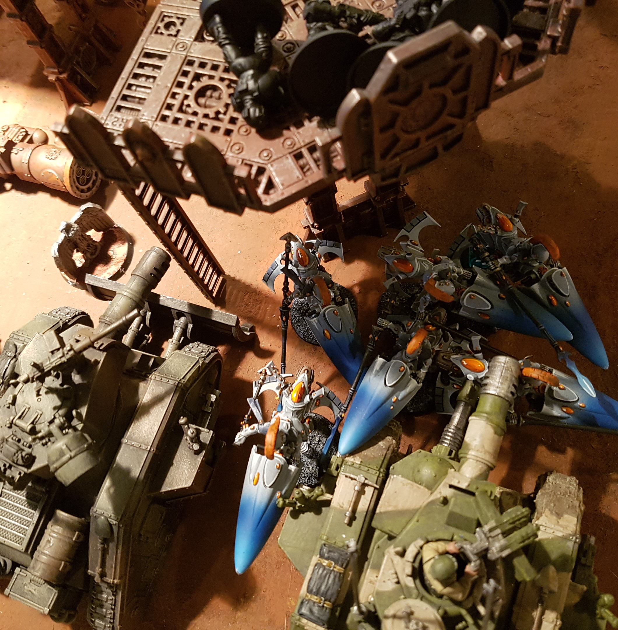 Die Bullgryns bewegen sich in Richtung Waffenplattform aber anscheinend sind ihre Beine vom eingepferchten Transport noch Taub den trotz das sie versuchen zu rennen, erreichen sie ihr Ziel nicht mal annähernd. Die Scions verlassen ihre Deckung und positionieren sich auf der Straße, wo sie zwar weniger geschützt sind aber dafür den Käfern zeigen, dass sie nicht so leicht die strategisch wichtige Kreuzung einnehmen können. Damit sie aber nicht ungeschützt sind, legt Roy Siegfried einen Schleier über den Trupp der ihre Konturen für den Feind verschwimmen lässt. Währendessen überfliegt die Valkyrie das Gelände und feuert dabei ihre Waffen auf verschiedene Ziele ab. Die beiden Tauroxe und der Trupp Scions eröffnen auch das Feuer. Die ersten Käfer werden niedergestreckt auch der große geflügelte Käfer welcher im Vorfeld von der Aufklärung zur Unterscheidung (Standardvorgehensweise der imperialen Truppen um diese Wesen besser zu unterscheiden und ihre Bewegungen genauer nachvollziehen zu können) Quentin Tyranido getauft wurde bekommt einige leichte Treffer ab. Die Zwillings-Gatling des einen Taurox mäht eine ganze Reihe der dicht aneinander gedrängten Genestealer um.