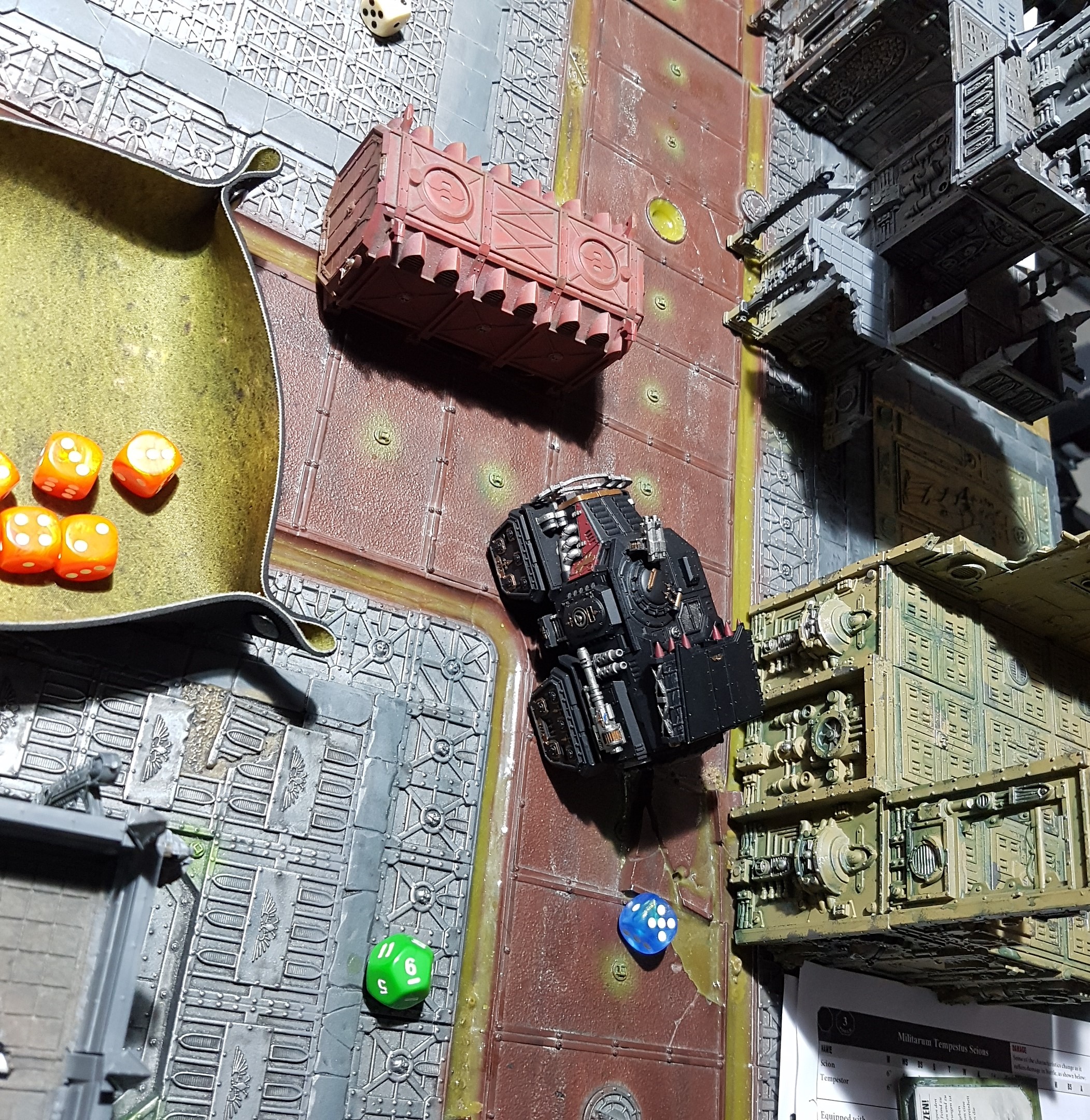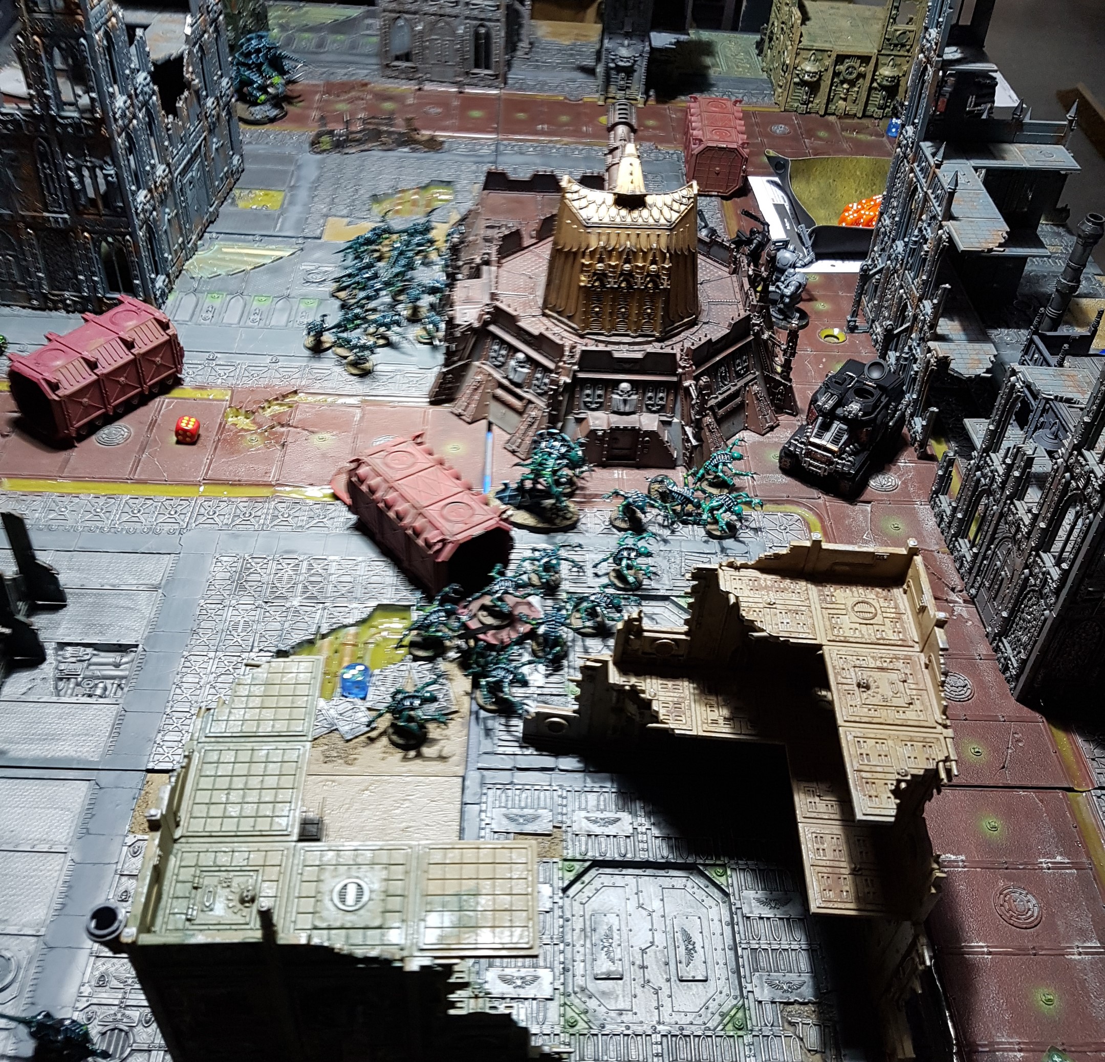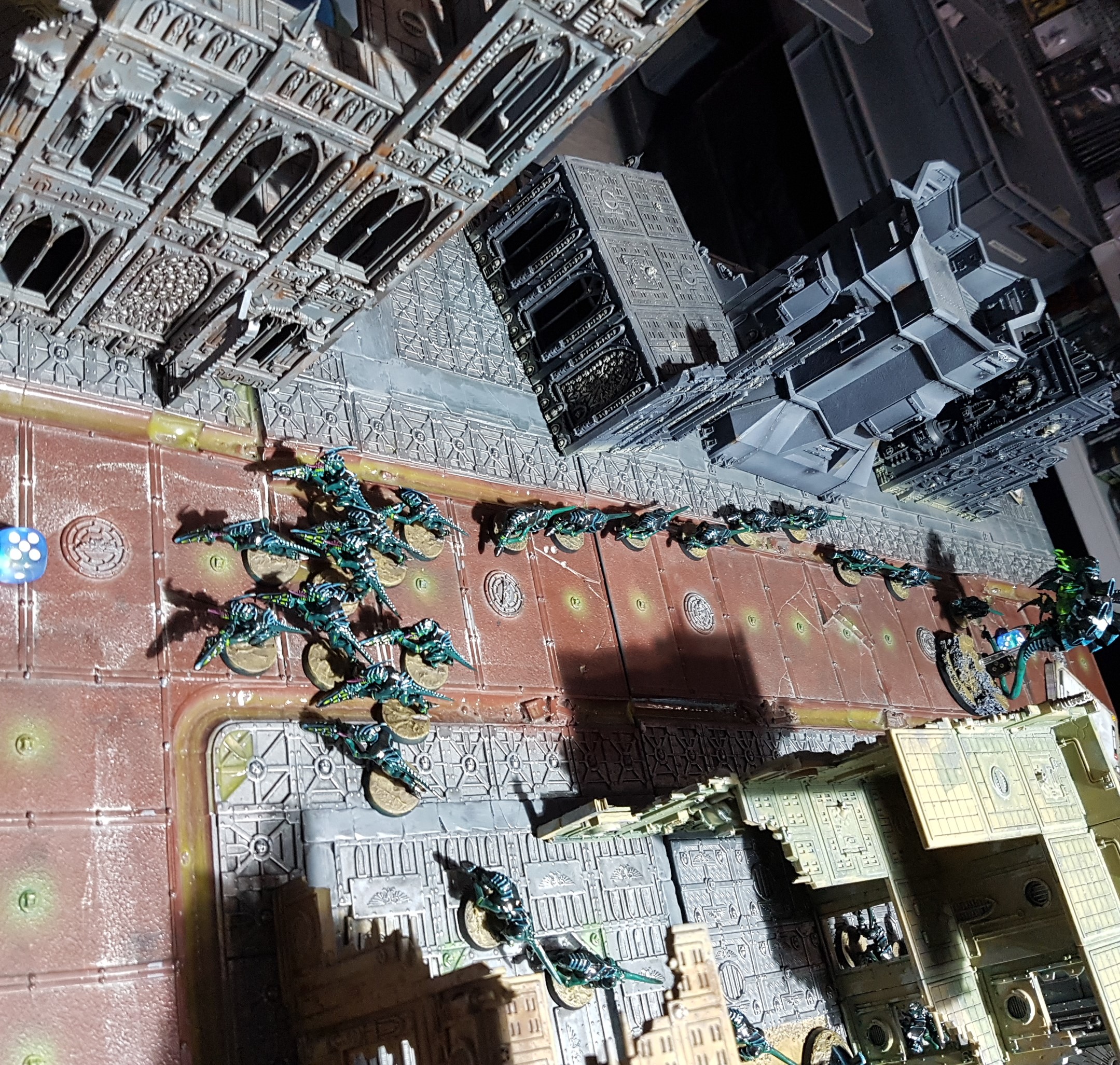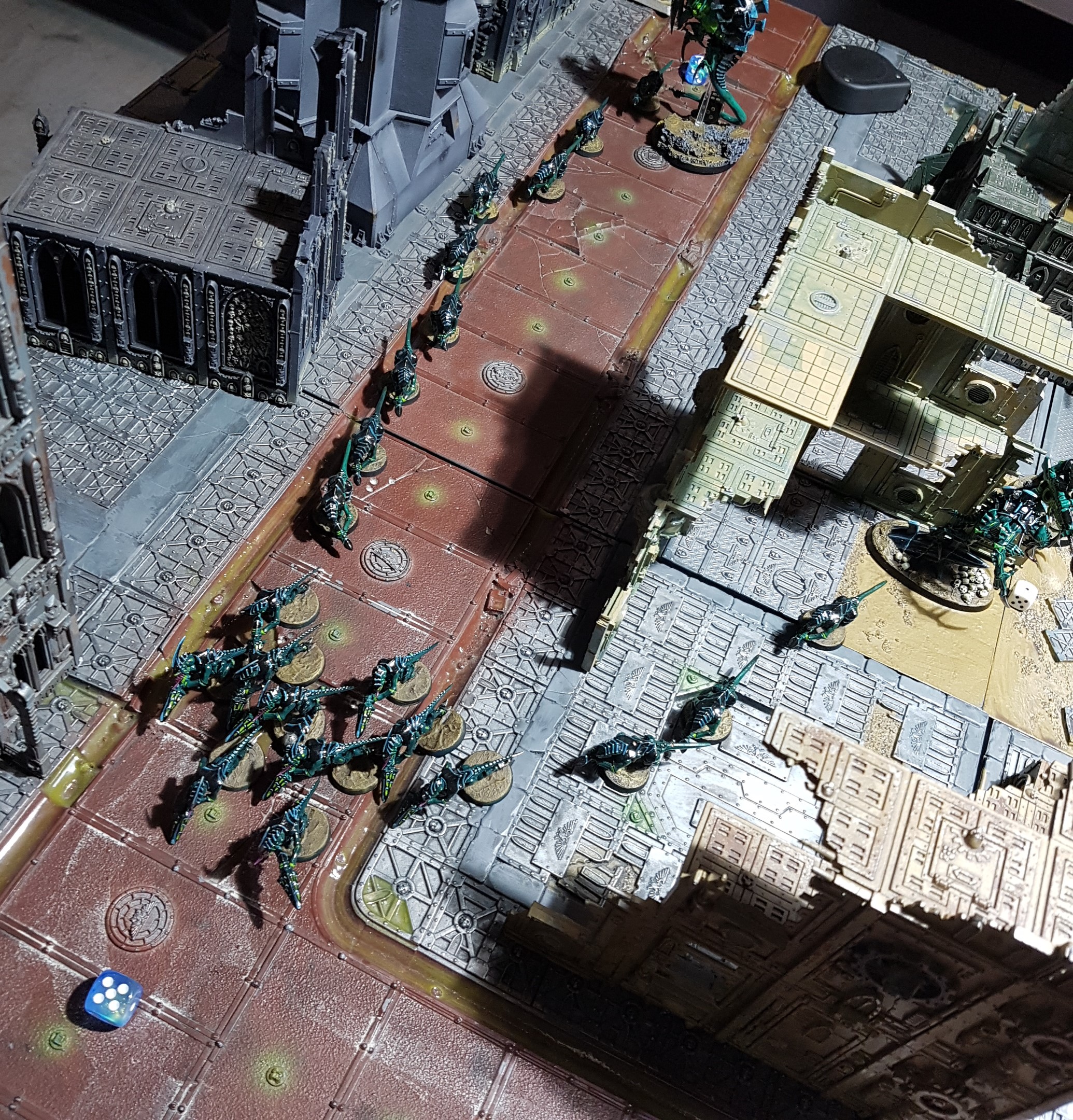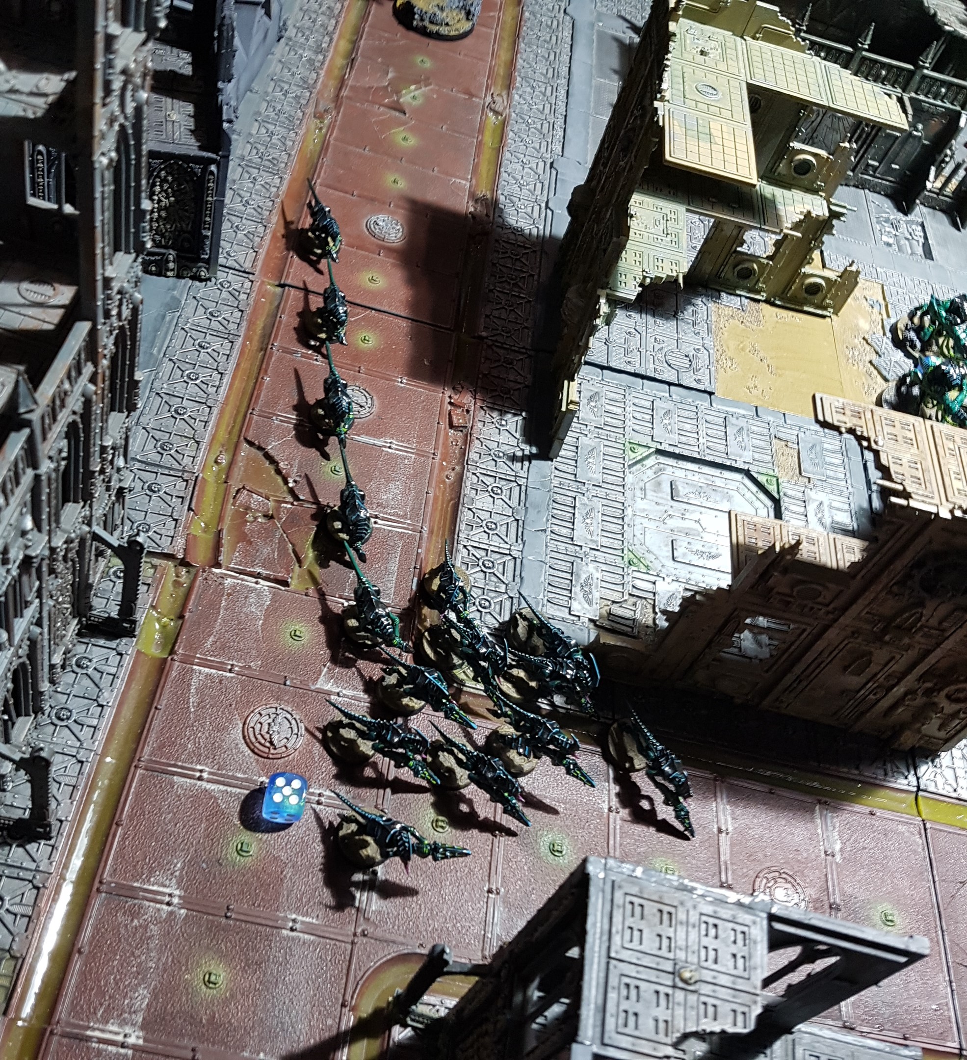 Die Bullgryns bewegen sich in Richtung Waffenplattform aber anscheinend sind ihre Beine vom eingepferchten Transport noch Taub den trotz das sie versuchen zu rennen, erreichen sie ihr Ziel nicht mal annähernd. Die Scions verlassen ihre Deckung und positionieren sich auf der Straße, wo sie zwar weniger geschützt sind aber dafür den Käfern zeigen, dass sie nicht so leicht die strategisch wichtige Kreuzung einnehmen können. Damit sie aber nicht ungeschützt sind, legt Roy Siegfried einen Schleier über den Trupp der ihre Konturen für den Feind verschwimmen lässt. Währendessen überfliegt die Valkyrie das Gelände und feuert dabei ihre Waffen auf verschiedene Ziele ab. Die beiden Tauroxe und der Trupp Scions eröffnen auch das Feuer. Die ersten Käfer werden niedergestreckt auch der große geflügelte Käfer welcher im Vorfeld von der Aufklärung zur Unterscheidung (Standardvorgehensweise der imperialen Truppen um diese Wesen besser zu unterscheiden und ihre Bewegungen genauer nachvollziehen zu können) Quentin Tyranido getauft wurde bekommt einige leichte Treffer ab. Die Zwillings-Gatling des einen Taurox mäht eine ganze Reihe der dicht aneinander gedrängten Genestealer um.