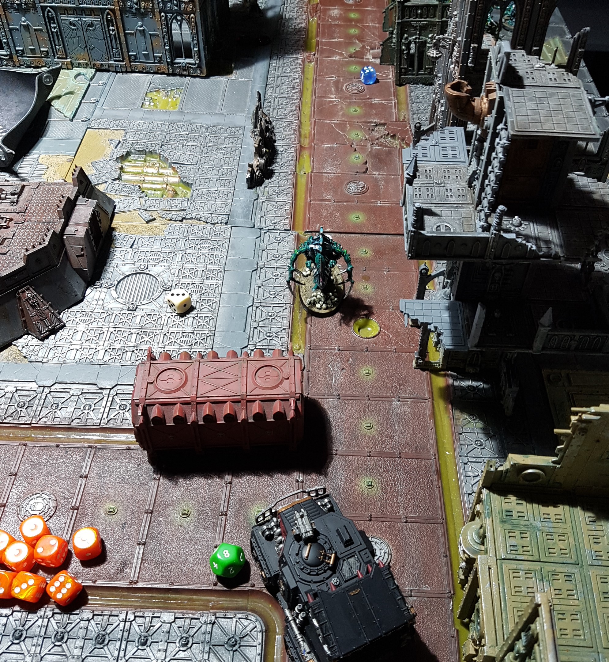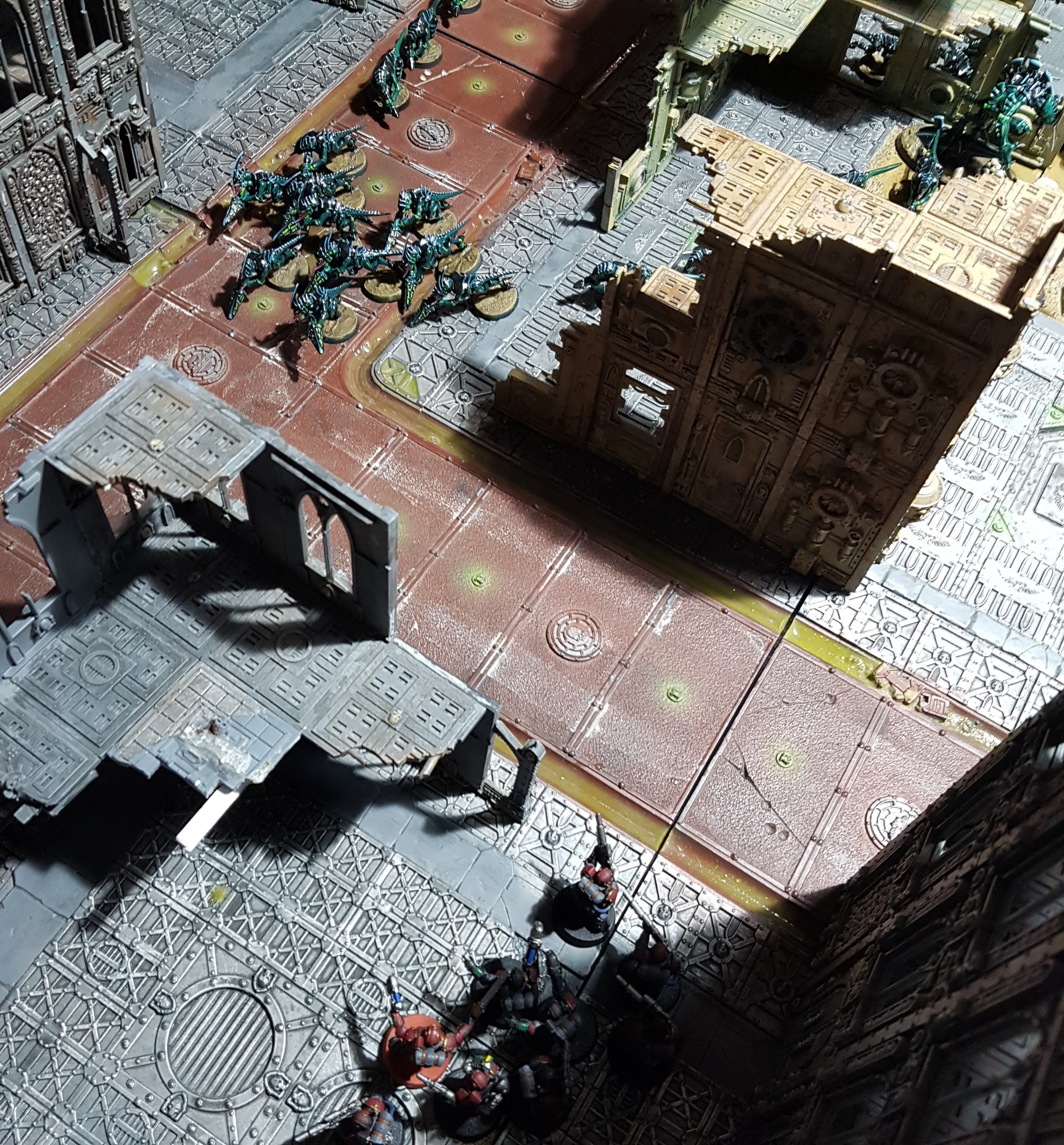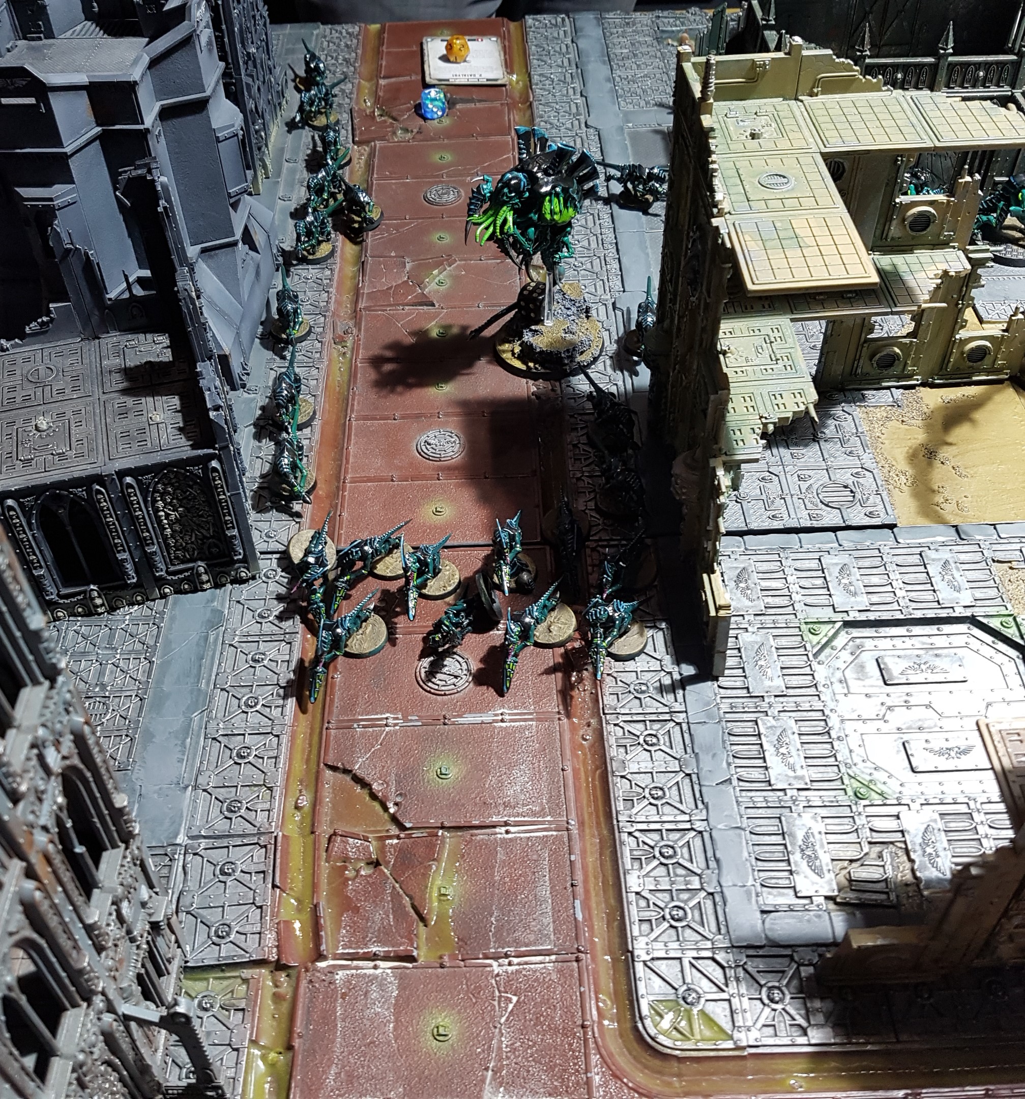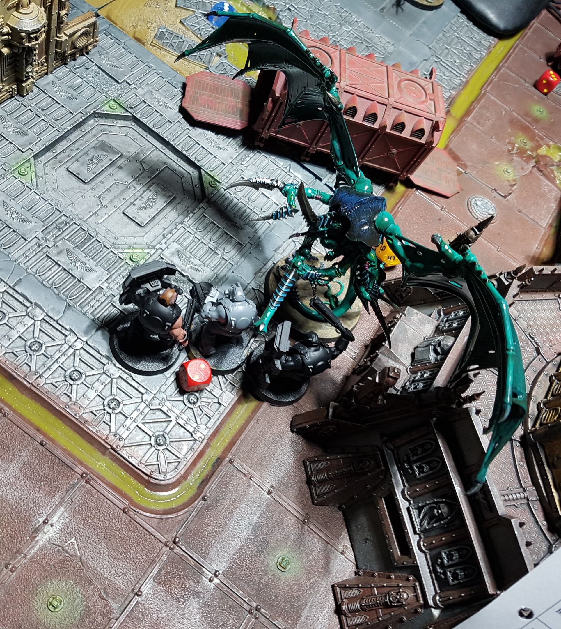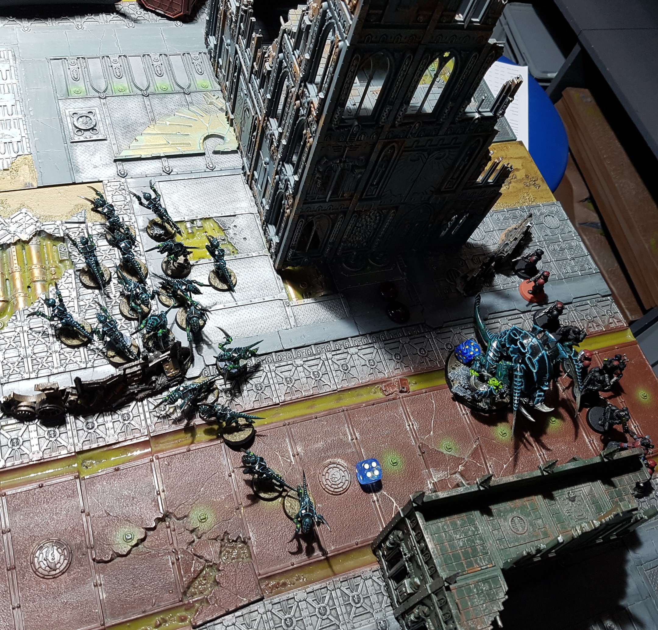 Die Bullgryns bewegen sich in Richtung Waffenplattform aber anscheinend sind ihre Beine vom eingepferchten Transport noch Taub den trotz das sie versuchen zu rennen, erreichen sie ihr Ziel nicht mal annähernd. Die Scions verlassen ihre Deckung und positionieren sich auf der Straße, wo sie zwar weniger geschützt sind aber dafür den Käfern zeigen, dass sie nicht so leicht die strategisch wichtige Kreuzung einnehmen können. Damit sie aber nicht ungeschützt sind, legt Roy Siegfried einen Schleier über den Trupp der ihre Konturen für den Feind verschwimmen lässt. Währendessen überfliegt die Valkyrie das Gelände und feuert dabei ihre Waffen auf verschiedene Ziele ab. Die beiden Tauroxe und der Trupp Scions eröffnen auch das Feuer. Die ersten Käfer werden niedergestreckt auch der große geflügelte Käfer welcher im Vorfeld von der Aufklärung zur Unterscheidung (Standardvorgehensweise der imperialen Truppen um diese Wesen besser zu unterscheiden und ihre Bewegungen genauer nachvollziehen zu können) Quentin Tyranido getauft wurde bekommt einige leichte Treffer ab. Die Zwillings-Gatling des einen Taurox mäht eine ganze Reihe der dicht aneinander gedrängten Genestealer um.