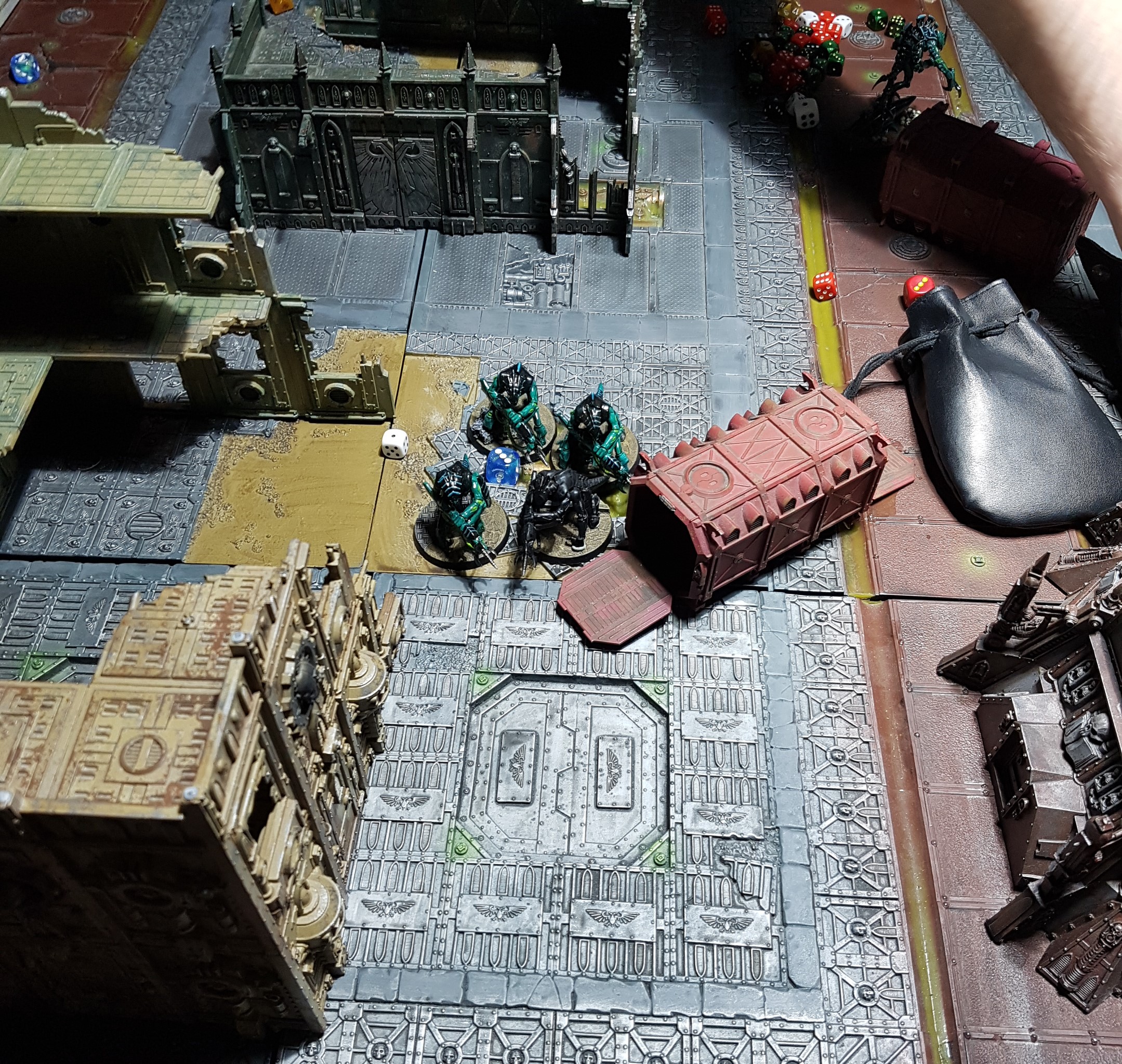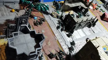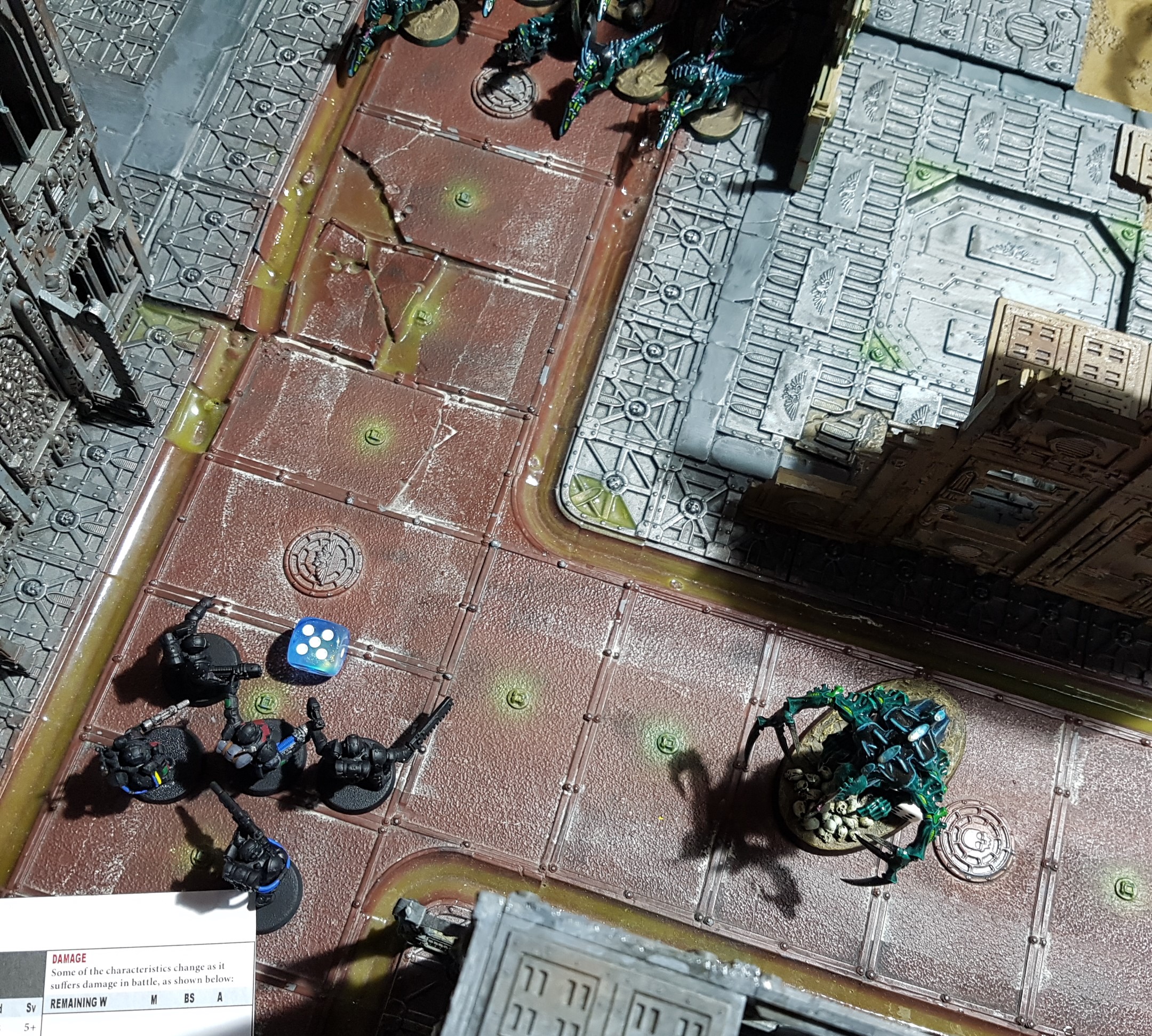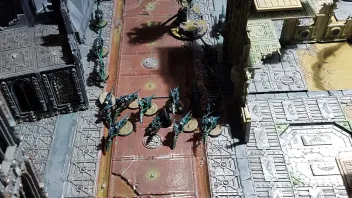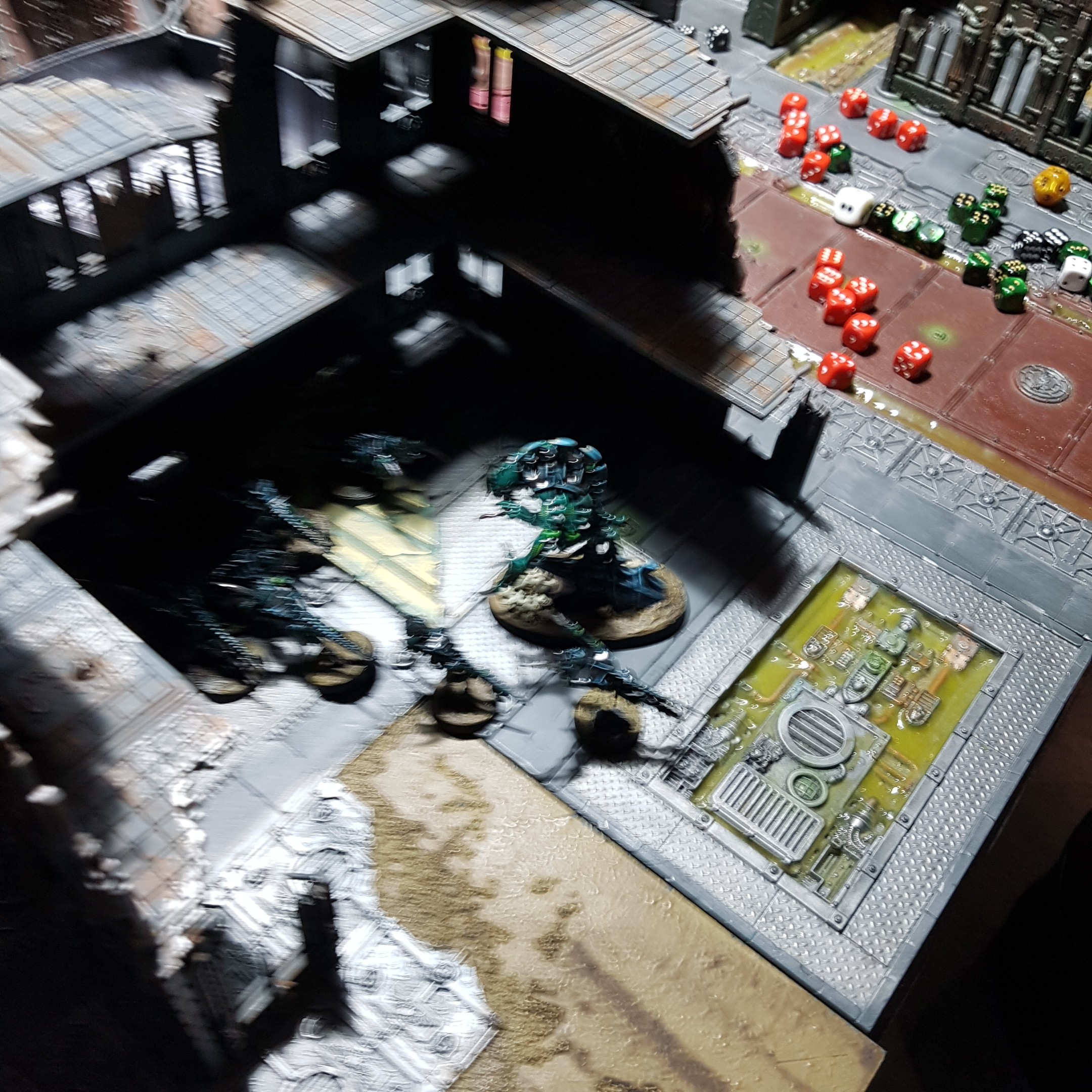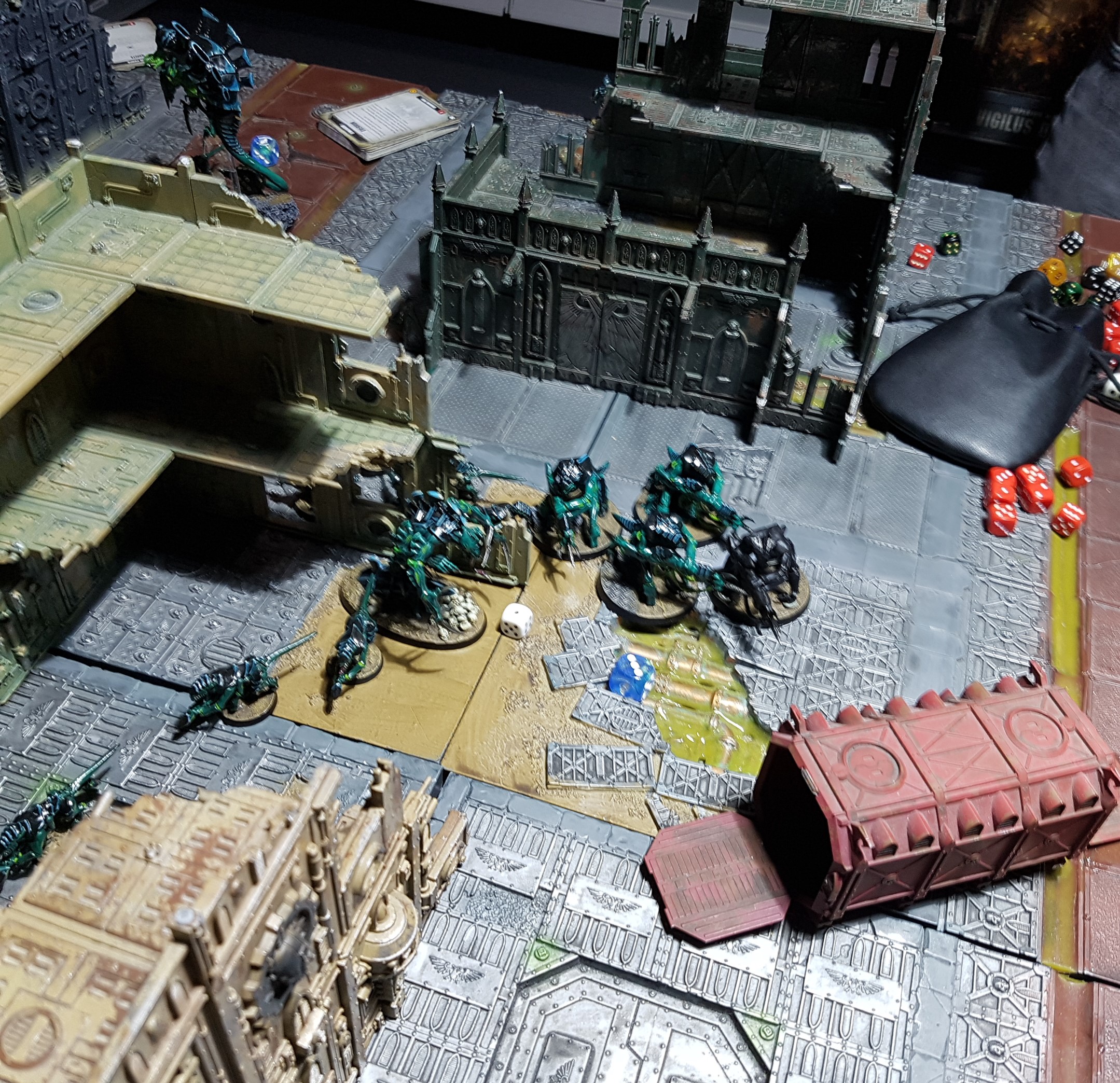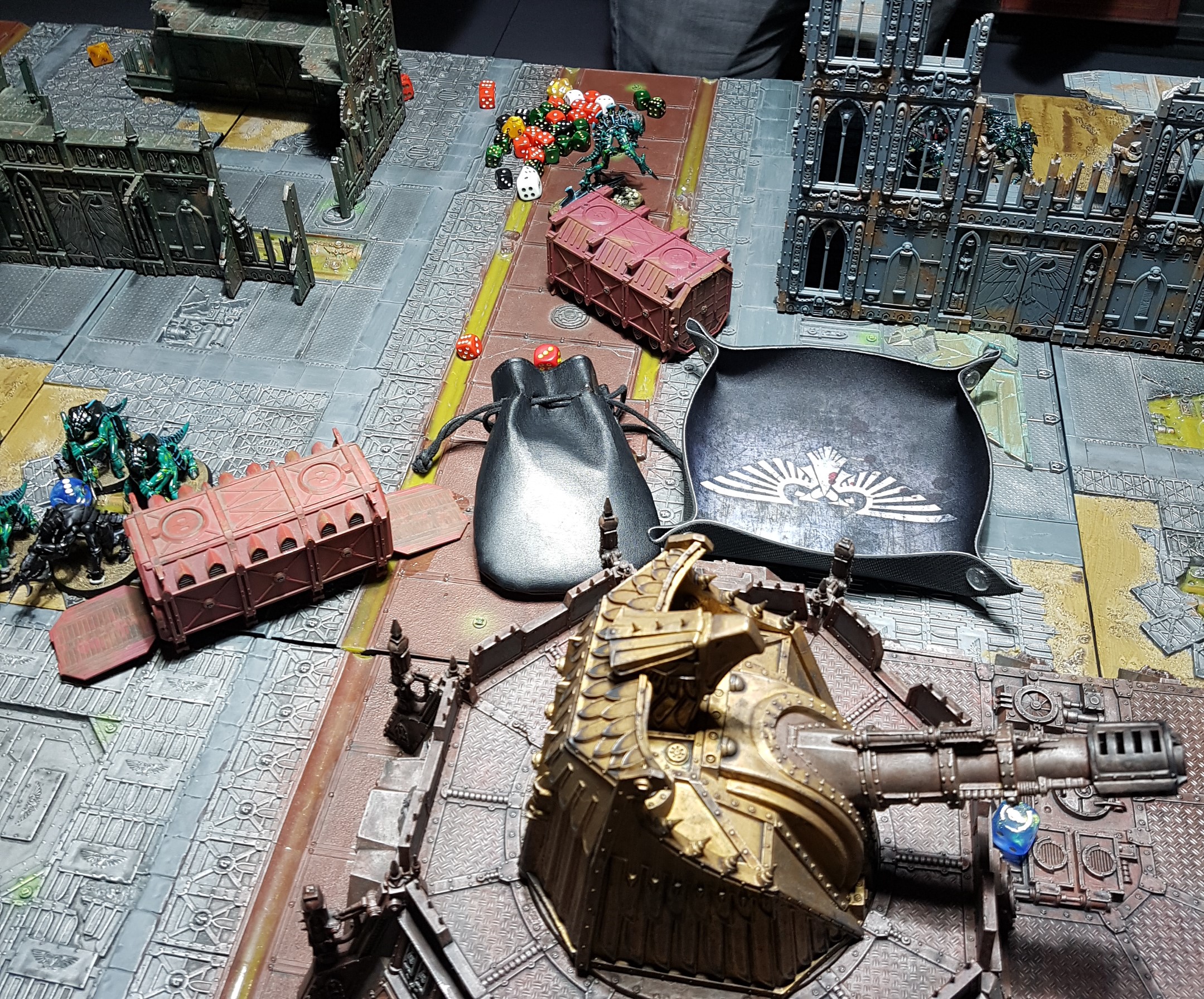 Die Bullgryns bewegen sich in Richtung Waffenplattform aber anscheinend sind ihre Beine vom eingepferchten Transport noch Taub den trotz das sie versuchen zu rennen, erreichen sie ihr Ziel nicht mal annähernd. Die Scions verlassen ihre Deckung und positionieren sich auf der Straße, wo sie zwar weniger geschützt sind aber dafür den Käfern zeigen, dass sie nicht so leicht die strategisch wichtige Kreuzung einnehmen können. Damit sie aber nicht ungeschützt sind, legt Roy Siegfried einen Schleier über den Trupp der ihre Konturen für den Feind verschwimmen lässt. Währendessen überfliegt die Valkyrie das Gelände und feuert dabei ihre Waffen auf verschiedene Ziele ab. Die beiden Tauroxe und der Trupp Scions eröffnen auch das Feuer. Die ersten Käfer werden niedergestreckt auch der große geflügelte Käfer welcher im Vorfeld von der Aufklärung zur Unterscheidung (Standardvorgehensweise der imperialen Truppen um diese Wesen besser zu unterscheiden und ihre Bewegungen genauer nachvollziehen zu können) Quentin Tyranido getauft wurde bekommt einige leichte Treffer ab. Die Zwillings-Gatling des einen Taurox mäht eine ganze Reihe der dicht aneinander gedrängten Genestealer um.