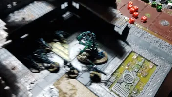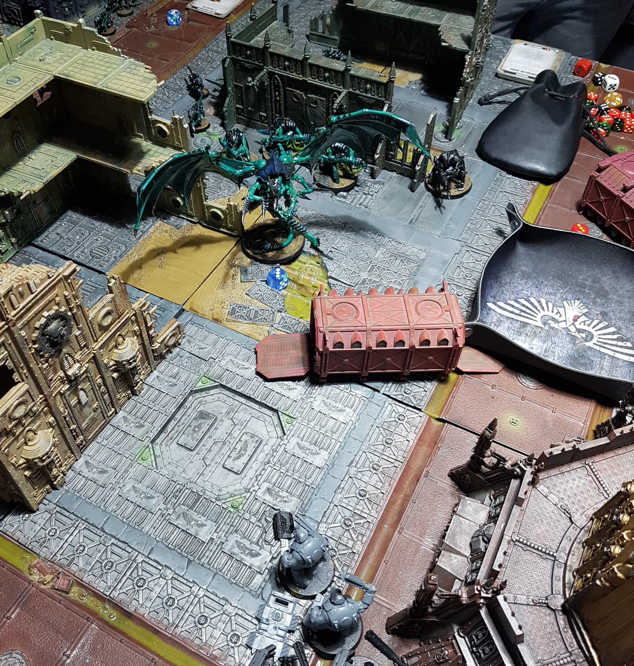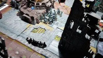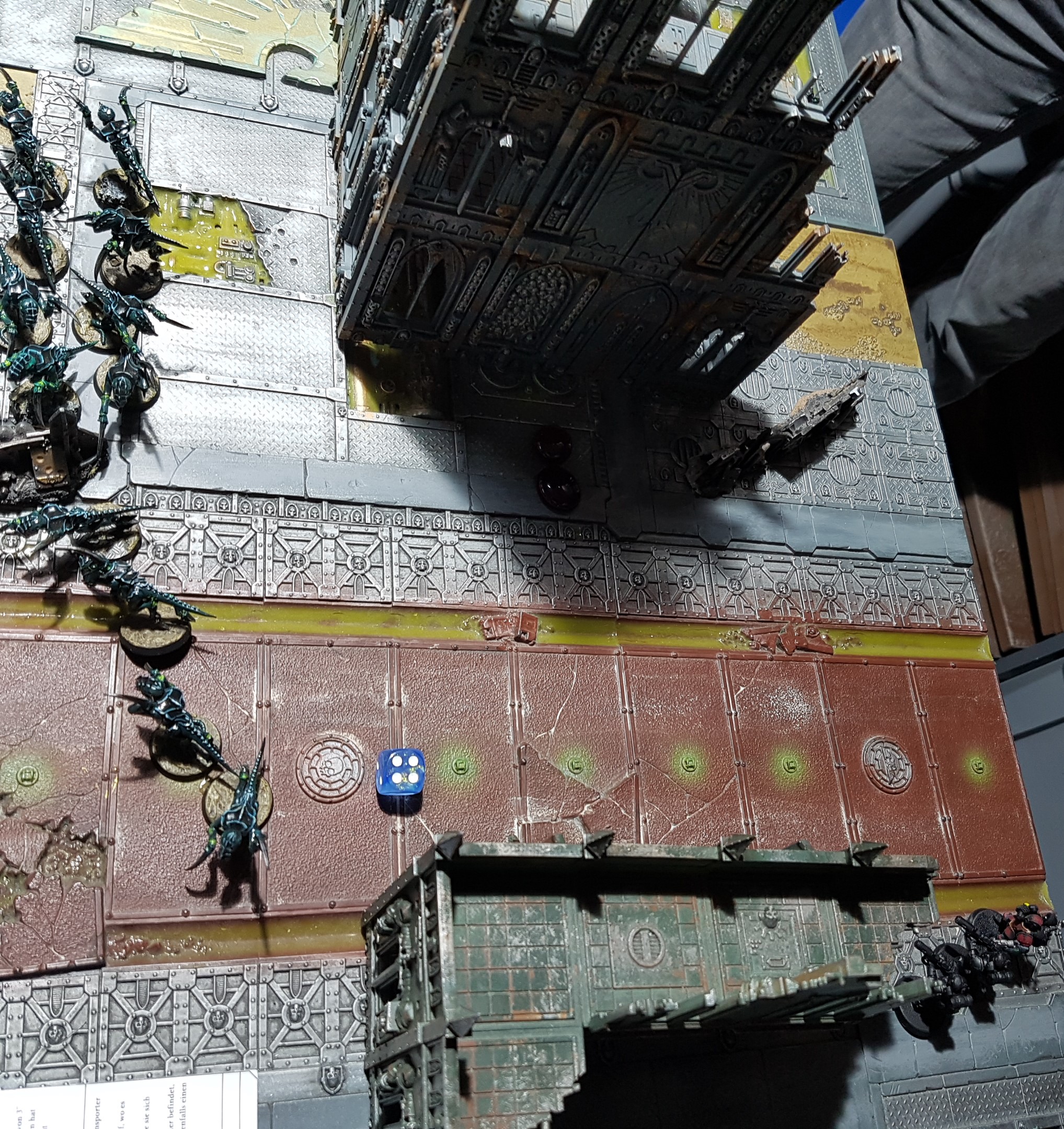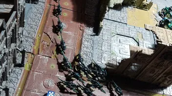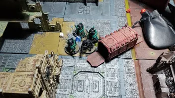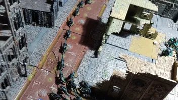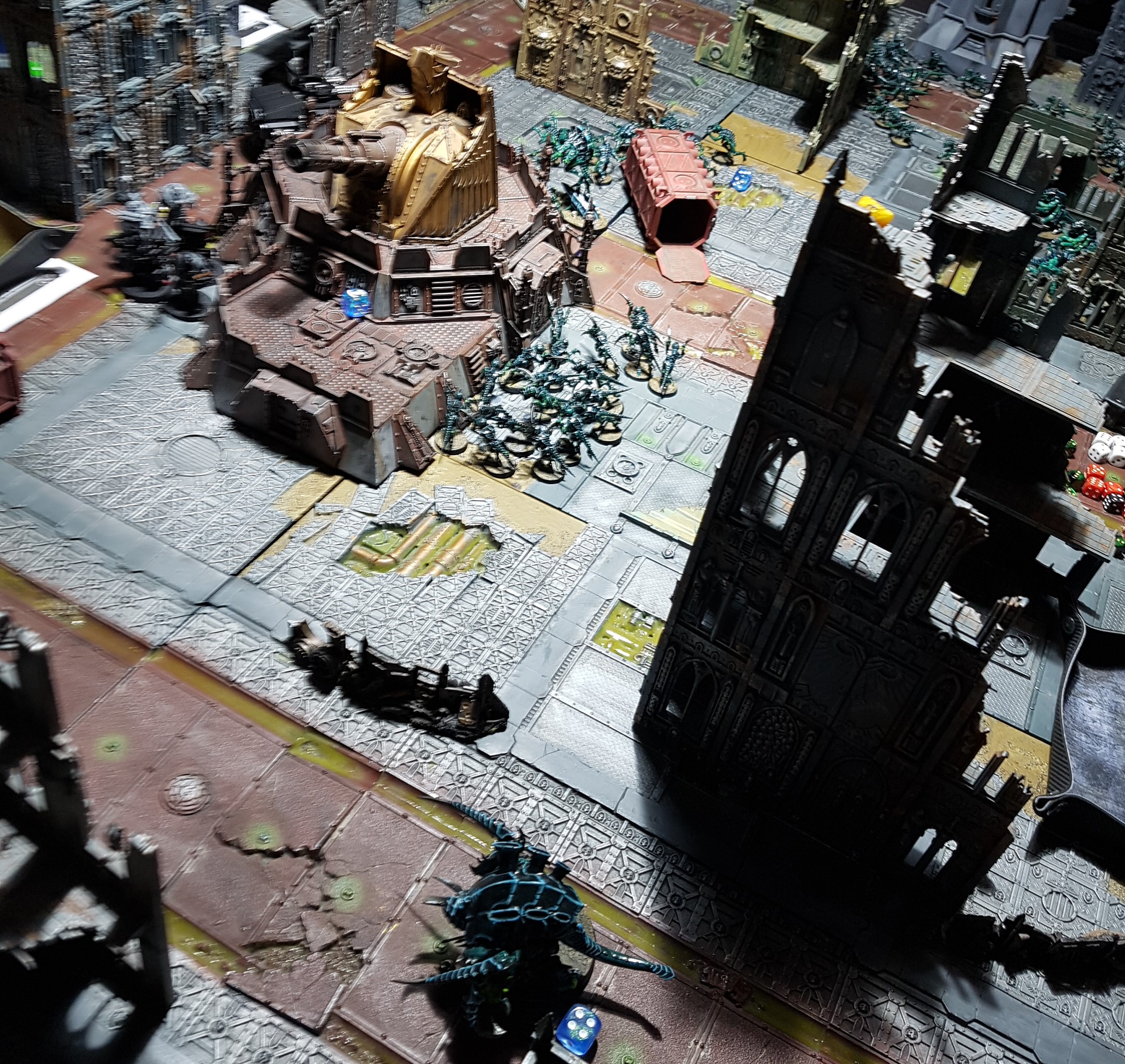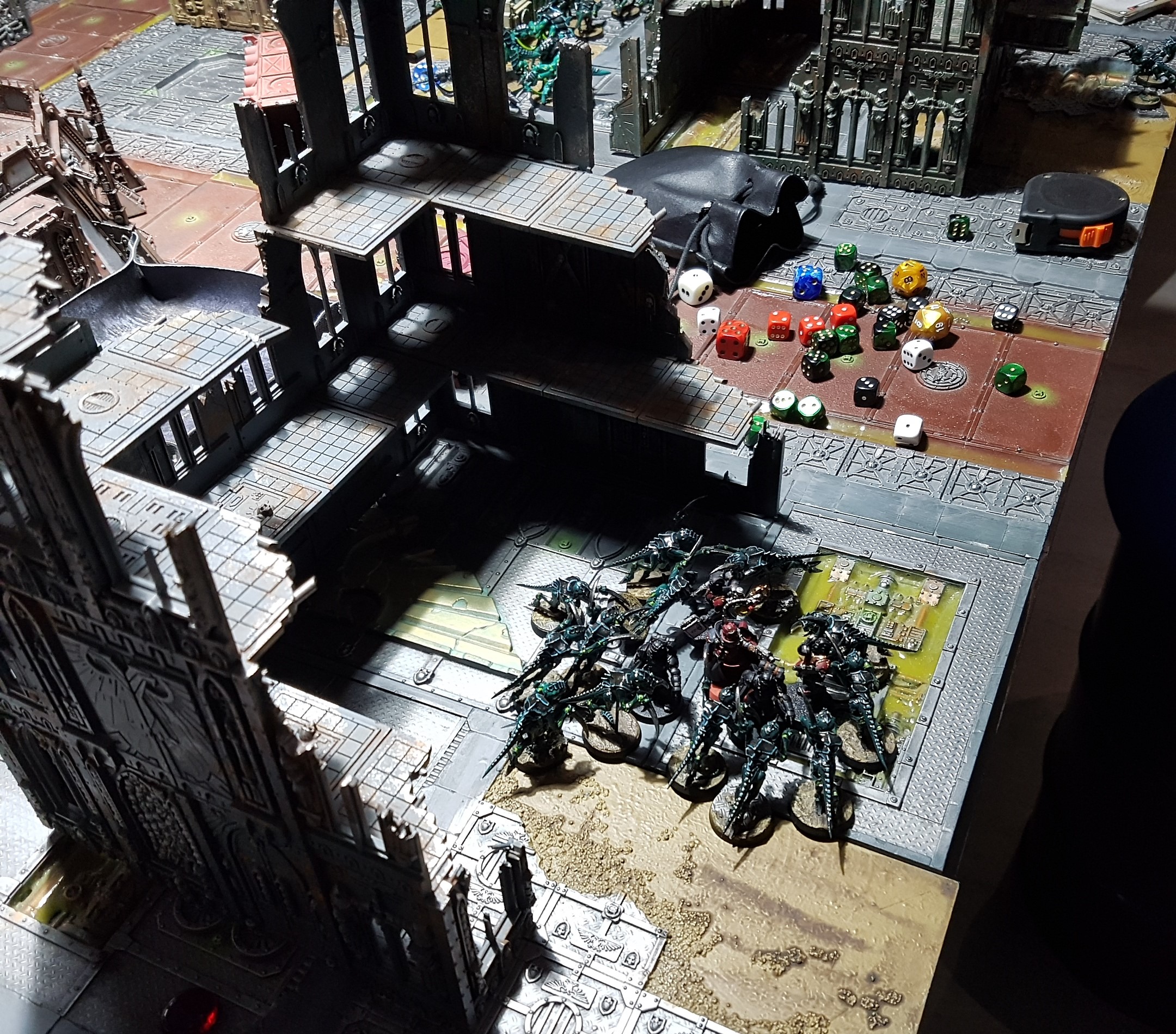 Die Bullgryns bewegen sich in Richtung Waffenplattform aber anscheinend sind ihre Beine vom eingepferchten Transport noch Taub den trotz das sie versuchen zu rennen, erreichen sie ihr Ziel nicht mal annähernd. Die Scions verlassen ihre Deckung und positionieren sich auf der Straße, wo sie zwar weniger geschützt sind aber dafür den Käfern zeigen, dass sie nicht so leicht die strategisch wichtige Kreuzung einnehmen können. Damit sie aber nicht ungeschützt sind, legt Roy Siegfried einen Schleier über den Trupp der ihre Konturen für den Feind verschwimmen lässt. Währendessen überfliegt die Valkyrie das Gelände und feuert dabei ihre Waffen auf verschiedene Ziele ab. Die beiden Tauroxe und der Trupp Scions eröffnen auch das Feuer. Die ersten Käfer werden niedergestreckt auch der große geflügelte Käfer welcher im Vorfeld von der Aufklärung zur Unterscheidung (Standardvorgehensweise der imperialen Truppen um diese Wesen besser zu unterscheiden und ihre Bewegungen genauer nachvollziehen zu können) Quentin Tyranido getauft wurde bekommt einige leichte Treffer ab. Die Zwillings-Gatling des einen Taurox mäht eine ganze Reihe der dicht aneinander gedrängten Genestealer um.