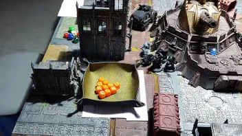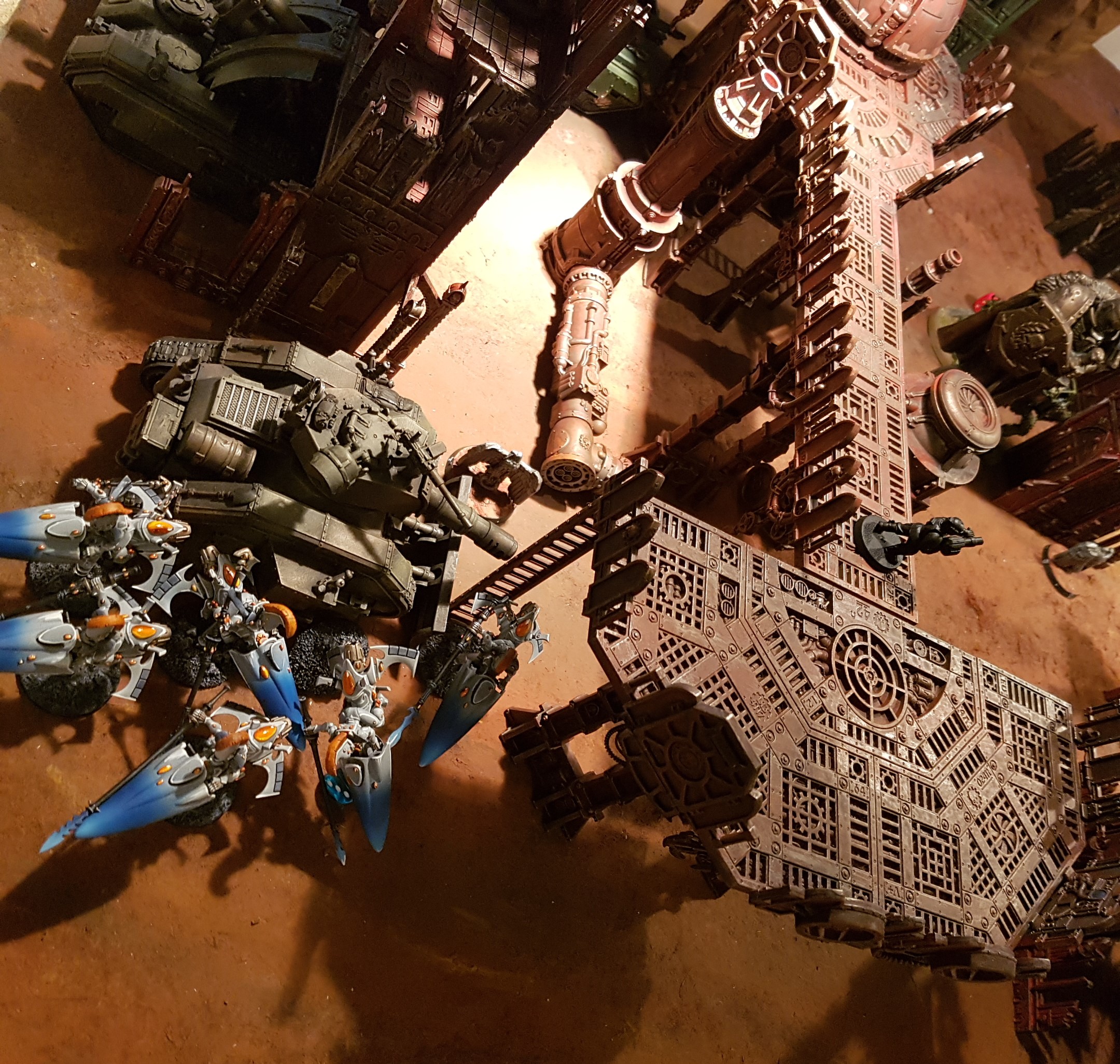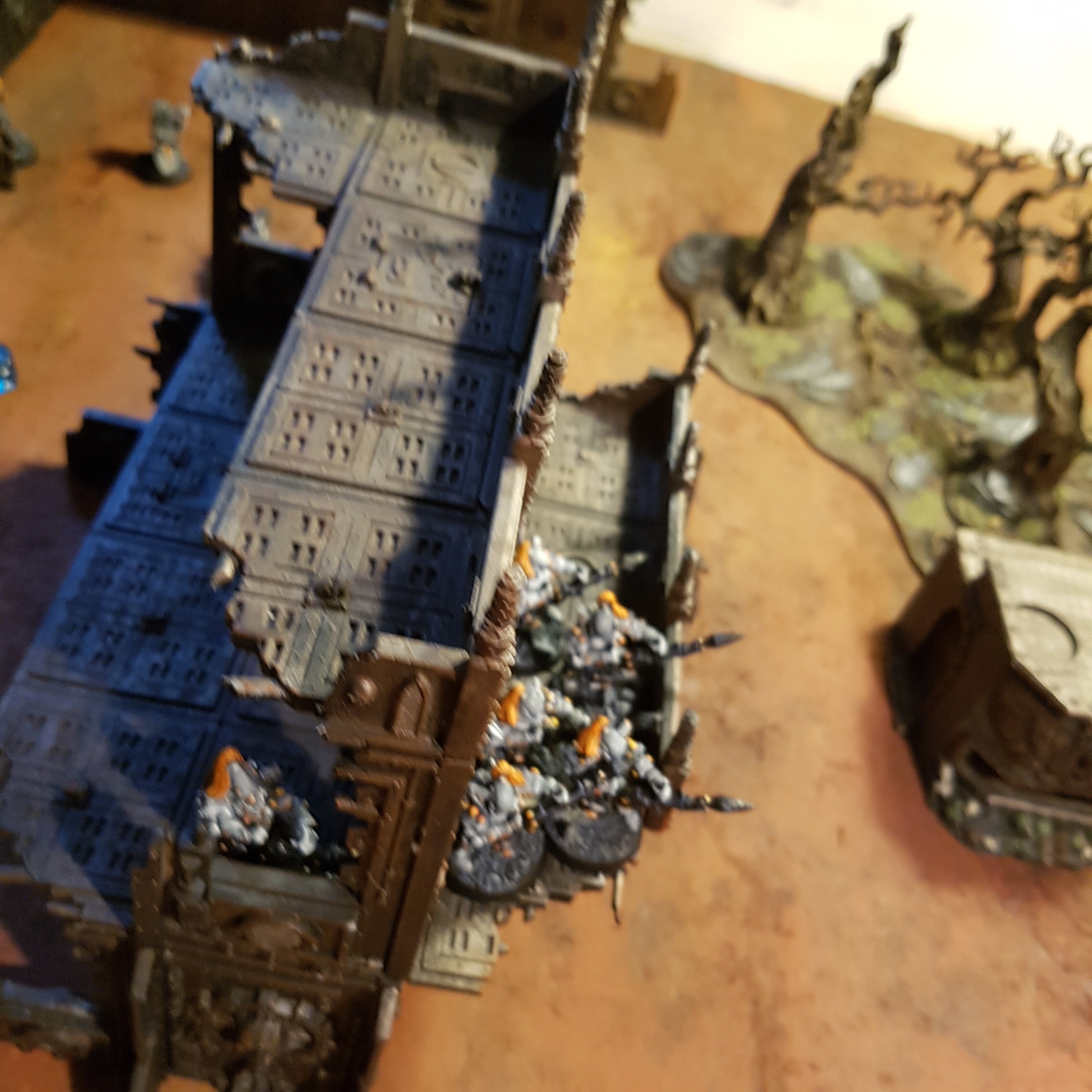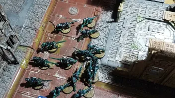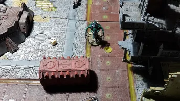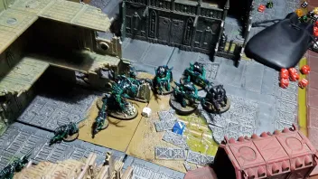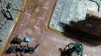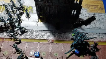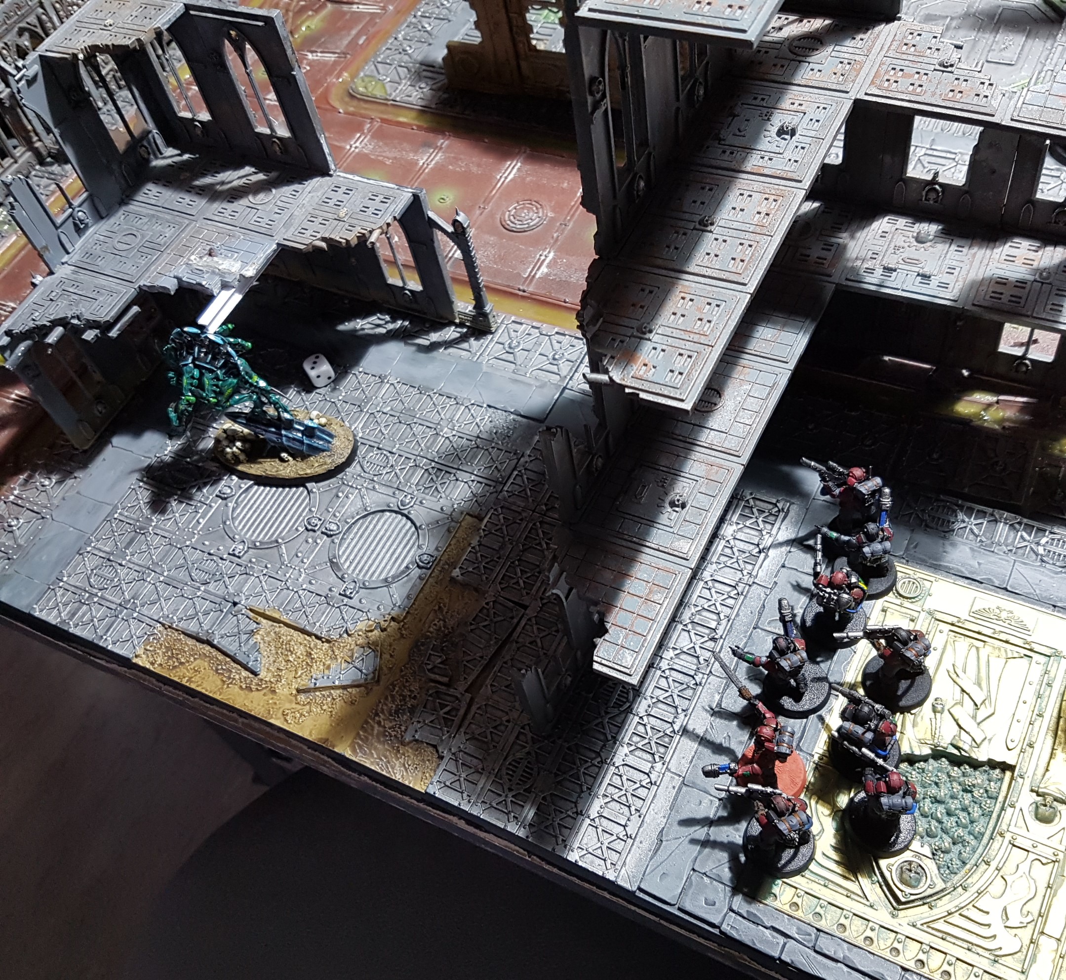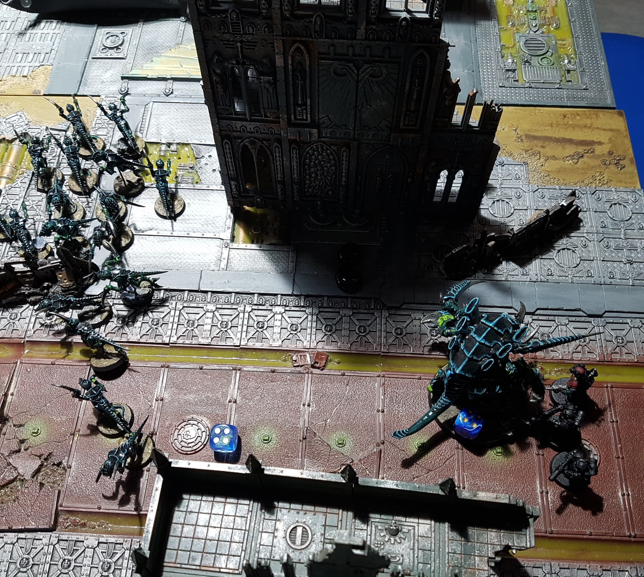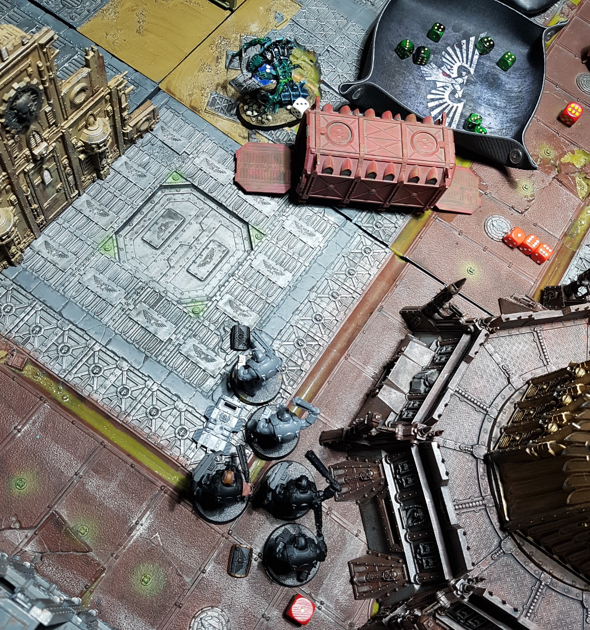 Die Bullgryns bewegen sich in Richtung Waffenplattform aber anscheinend sind ihre Beine vom eingepferchten Transport noch Taub den trotz das sie versuchen zu rennen, erreichen sie ihr Ziel nicht mal annähernd. Die Scions verlassen ihre Deckung und positionieren sich auf der Straße, wo sie zwar weniger geschützt sind aber dafür den Käfern zeigen, dass sie nicht so leicht die strategisch wichtige Kreuzung einnehmen können. Damit sie aber nicht ungeschützt sind, legt Roy Siegfried einen Schleier über den Trupp der ihre Konturen für den Feind verschwimmen lässt. Währendessen überfliegt die Valkyrie das Gelände und feuert dabei ihre Waffen auf verschiedene Ziele ab. Die beiden Tauroxe und der Trupp Scions eröffnen auch das Feuer. Die ersten Käfer werden niedergestreckt auch der große geflügelte Käfer welcher im Vorfeld von der Aufklärung zur Unterscheidung (Standardvorgehensweise der imperialen Truppen um diese Wesen besser zu unterscheiden und ihre Bewegungen genauer nachvollziehen zu können) Quentin Tyranido getauft wurde bekommt einige leichte Treffer ab. Die Zwillings-Gatling des einen Taurox mäht eine ganze Reihe der dicht aneinander gedrängten Genestealer um.