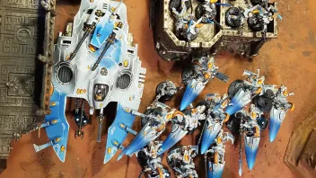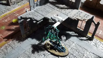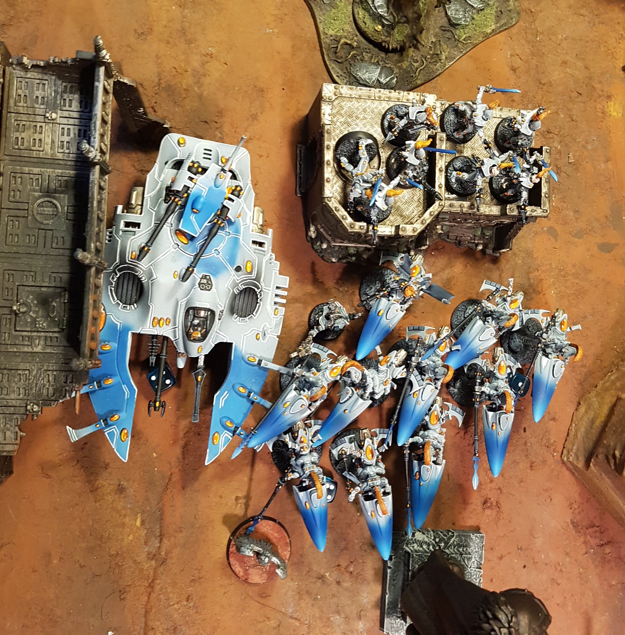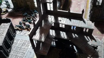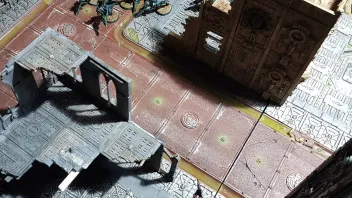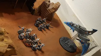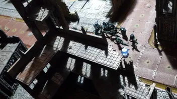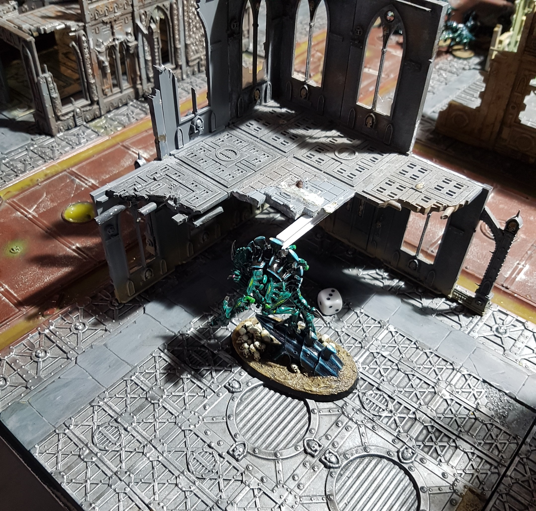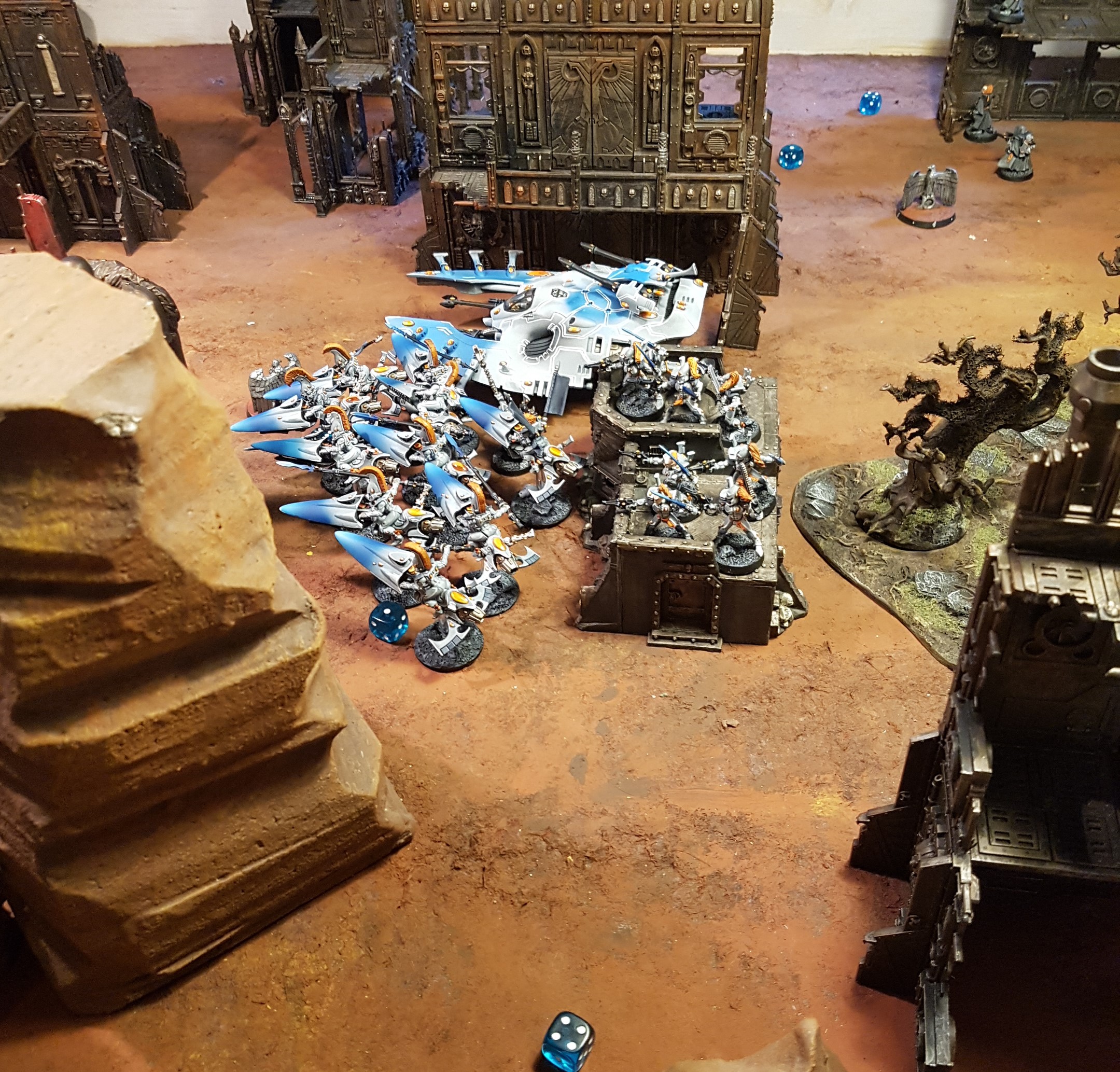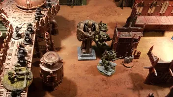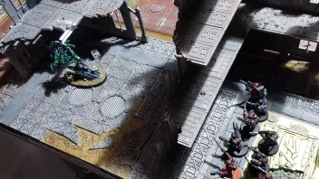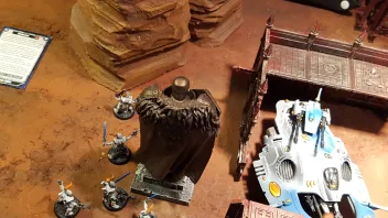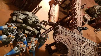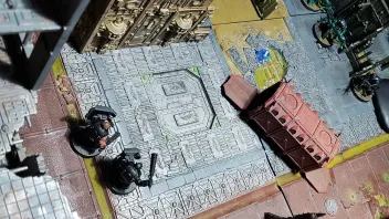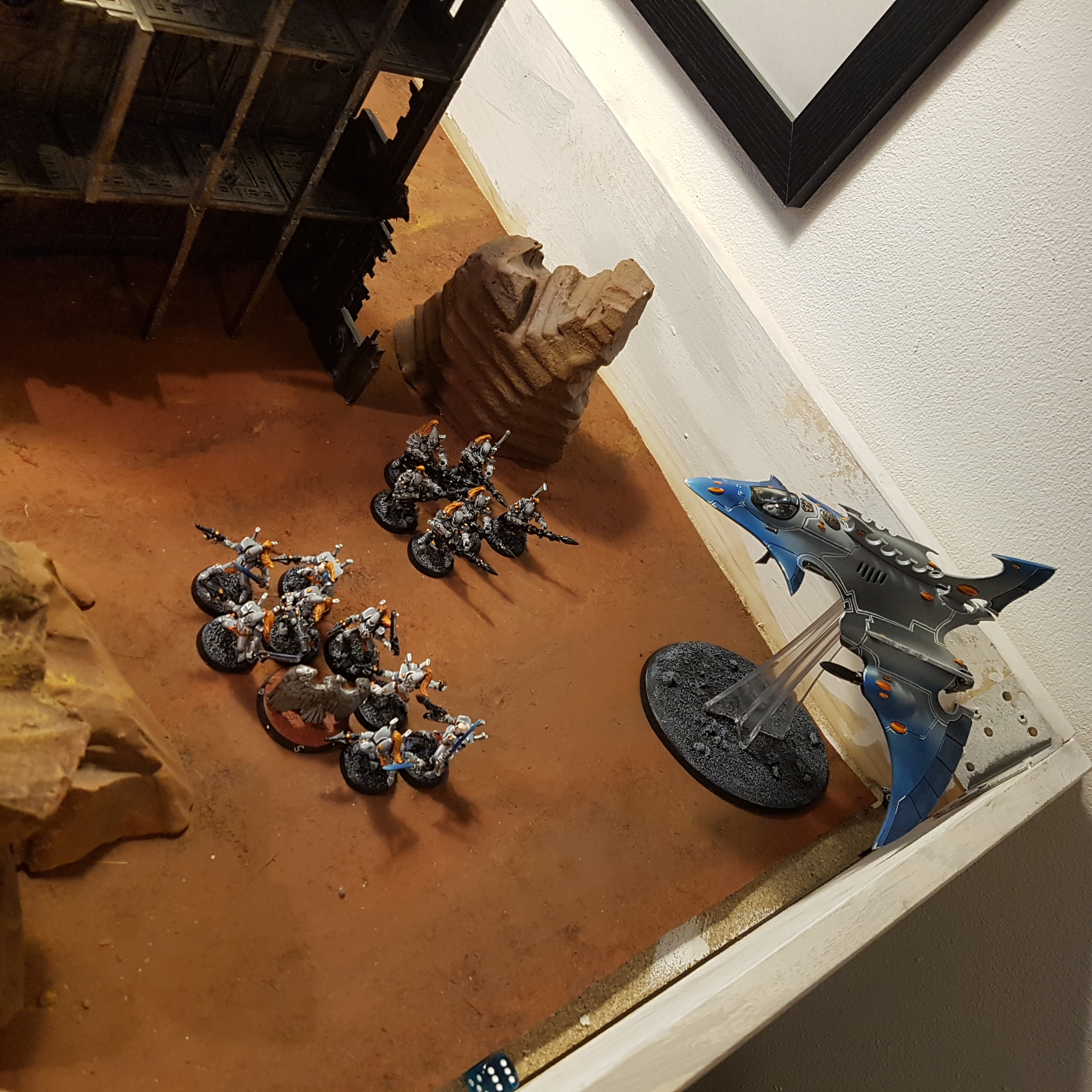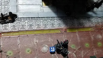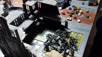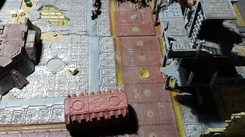 Die Bullgryns bewegen sich in Richtung Waffenplattform aber anscheinend sind ihre Beine vom eingepferchten Transport noch Taub den trotz das sie versuchen zu rennen, erreichen sie ihr Ziel nicht mal annähernd. Die Scions verlassen ihre Deckung und positionieren sich auf der Straße, wo sie zwar weniger geschützt sind aber dafür den Käfern zeigen, dass sie nicht so leicht die strategisch wichtige Kreuzung einnehmen können. Damit sie aber nicht ungeschützt sind, legt Roy Siegfried einen Schleier über den Trupp der ihre Konturen für den Feind verschwimmen lässt. Währendessen überfliegt die Valkyrie das Gelände und feuert dabei ihre Waffen auf verschiedene Ziele ab. Die beiden Tauroxe und der Trupp Scions eröffnen auch das Feuer. Die ersten Käfer werden niedergestreckt auch der große geflügelte Käfer welcher im Vorfeld von der Aufklärung zur Unterscheidung (Standardvorgehensweise der imperialen Truppen um diese Wesen besser zu unterscheiden und ihre Bewegungen genauer nachvollziehen zu können) Quentin Tyranido getauft wurde bekommt einige leichte Treffer ab. Die Zwillings-Gatling des einen Taurox mäht eine ganze Reihe der dicht aneinander gedrängten Genestealer um.
