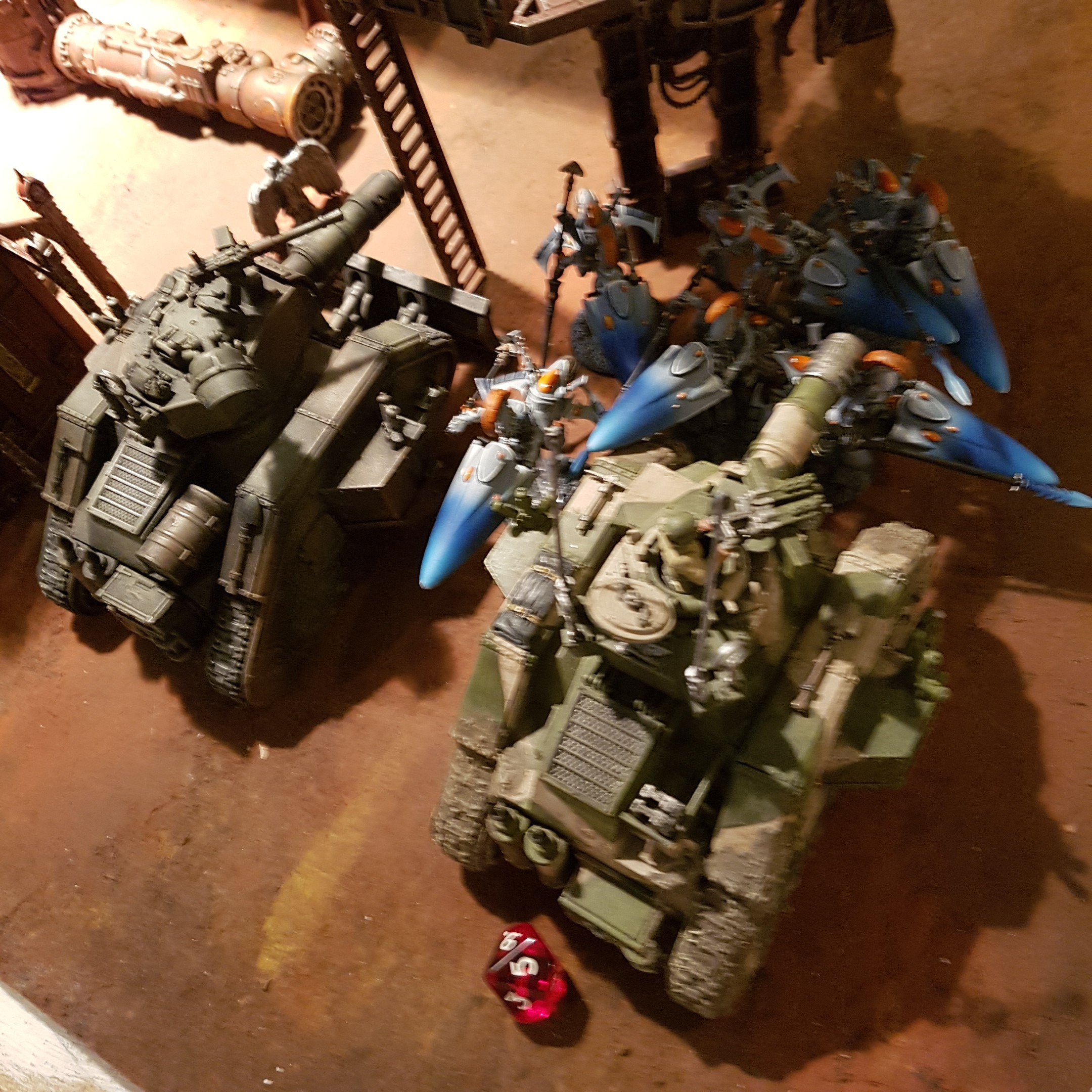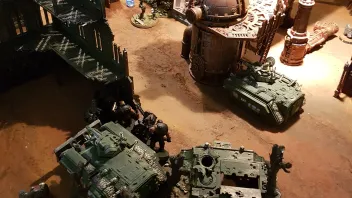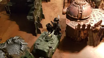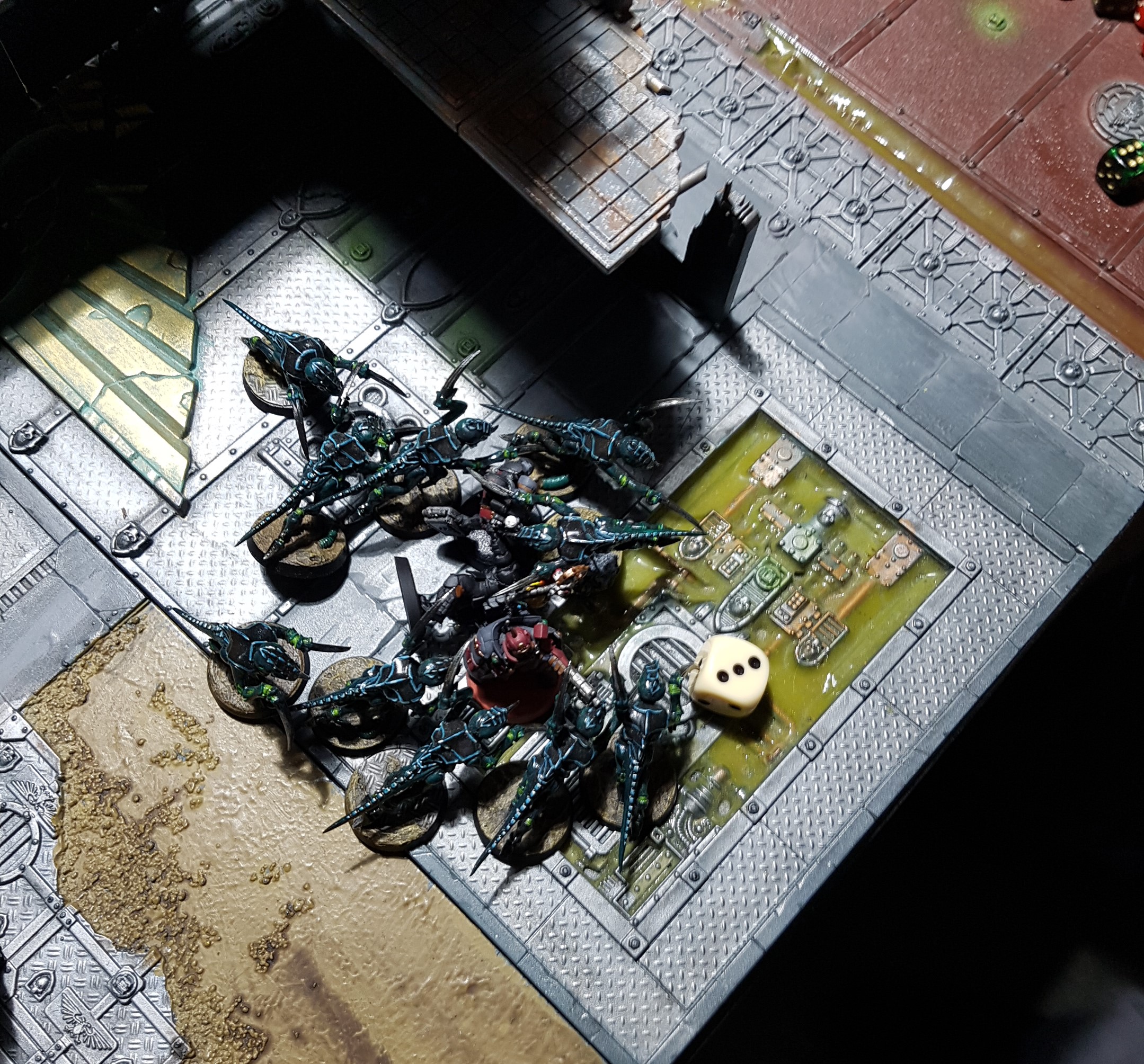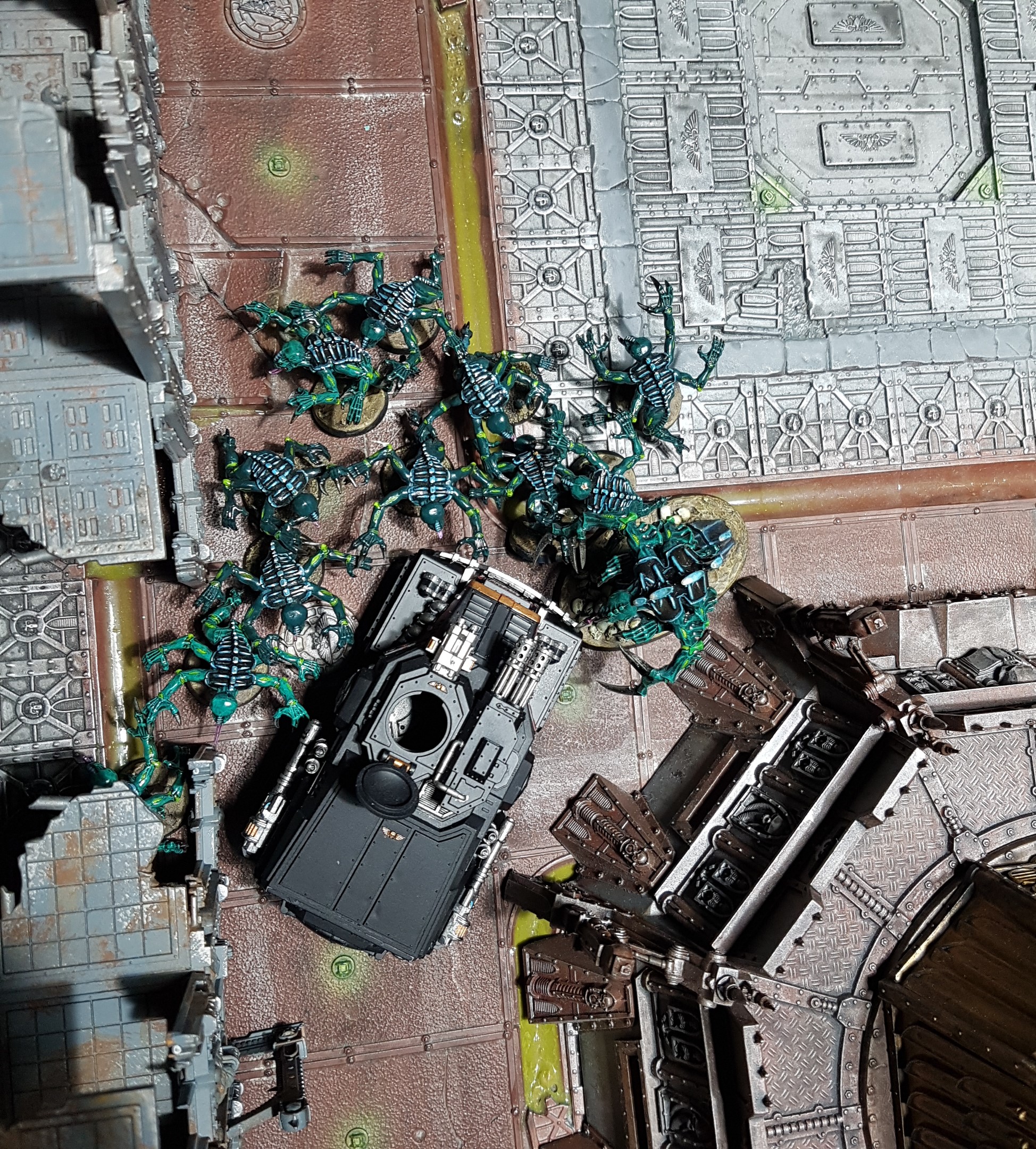 Der Gatling-Taurox feuert seine Waffen bis sie glühen auf die heranstürmenden Genestealer ab und einige dieser Vierarmigen Kreaturen fallen und werden dann von den anderen Xenos überrannt. Sie sind so zahlreich das sie es schließlich schaffen, den Taurox einzukeilen. Der von der Aufklärung Jules Winnfield getaufte große Käfer hat gedeckt von den Genestealern ebenfalls das Fahrzeug erreicht. Der gut Bewaffnete aber nur leicht gepanzerte Transporter hat gegen diese Wesen keine Chance. Jedoch zerrt einer Xenos in seinem Zerstörungsrausch an der Kraftstoffleitung und als diese reist ergießt sich der Treibstoff auf die glühende Gatling. Der Taurox explodiert. Einige der Angreifer verglühen im Feuerball. Jules Winnfield macht entsetzliche Geräusche als glühende Trümmer ihn treffen. Auch einem Bullgryn steckt ein Metallteil im massigen Oberarm aber er scheint nicht beeindruckt.