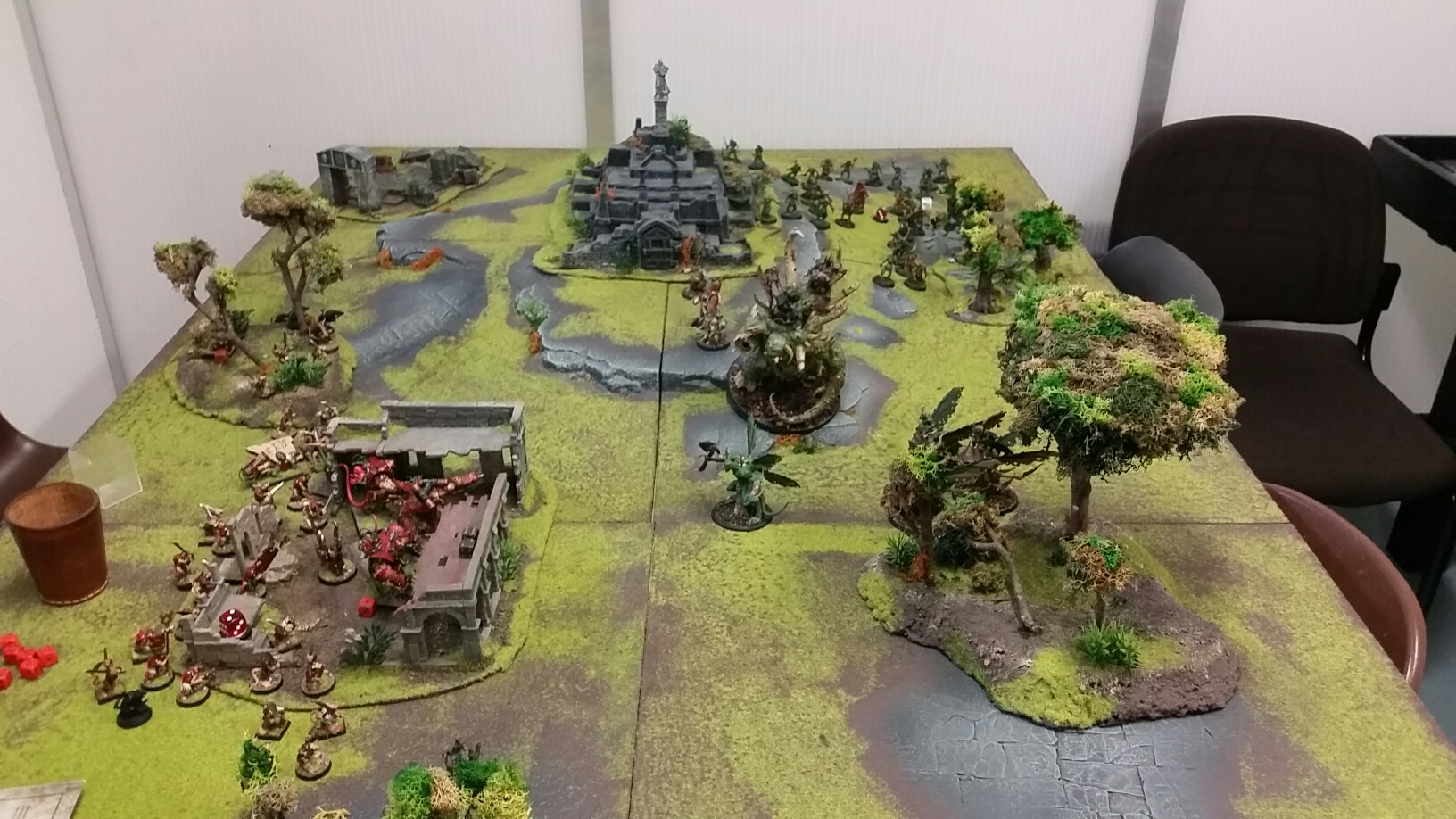 Tja eigentlich hat alles ganz gut geklappt. Lediglich eine kleine Blocker Einheit auf meinem 2. MZ hab ich vermisst aber bei 1250 Punktemuss man halt abstriche machen. Mit den Seuchenhütern hätte ich mich bereits in meiner ersten Runde vom Carnosaurier lösen sollen um aufs MZ zu gehen und der Glootkin hätte den Slan angehen müssen, naja. Alles in allem war ich recht zufrieden nur das mit den 6er und dem Rad. Naja.