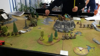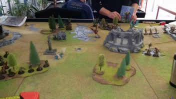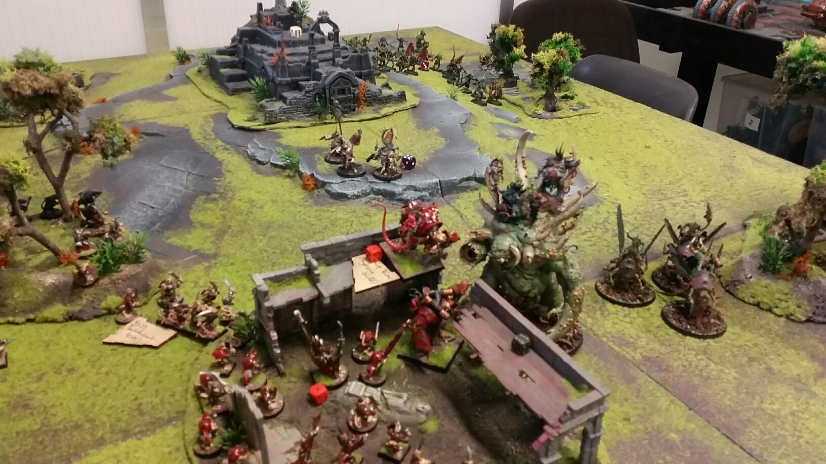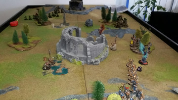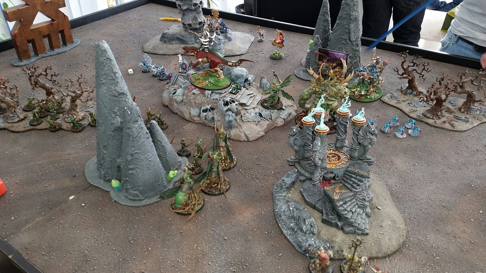 Der Ret des Gemetzels, er portete Stegadon und Carnosaurier da hin, punktete. Im Gegenzug löschte ich die CSkinks und das Stegadon mit Glootkin auch aus und punktete auch.