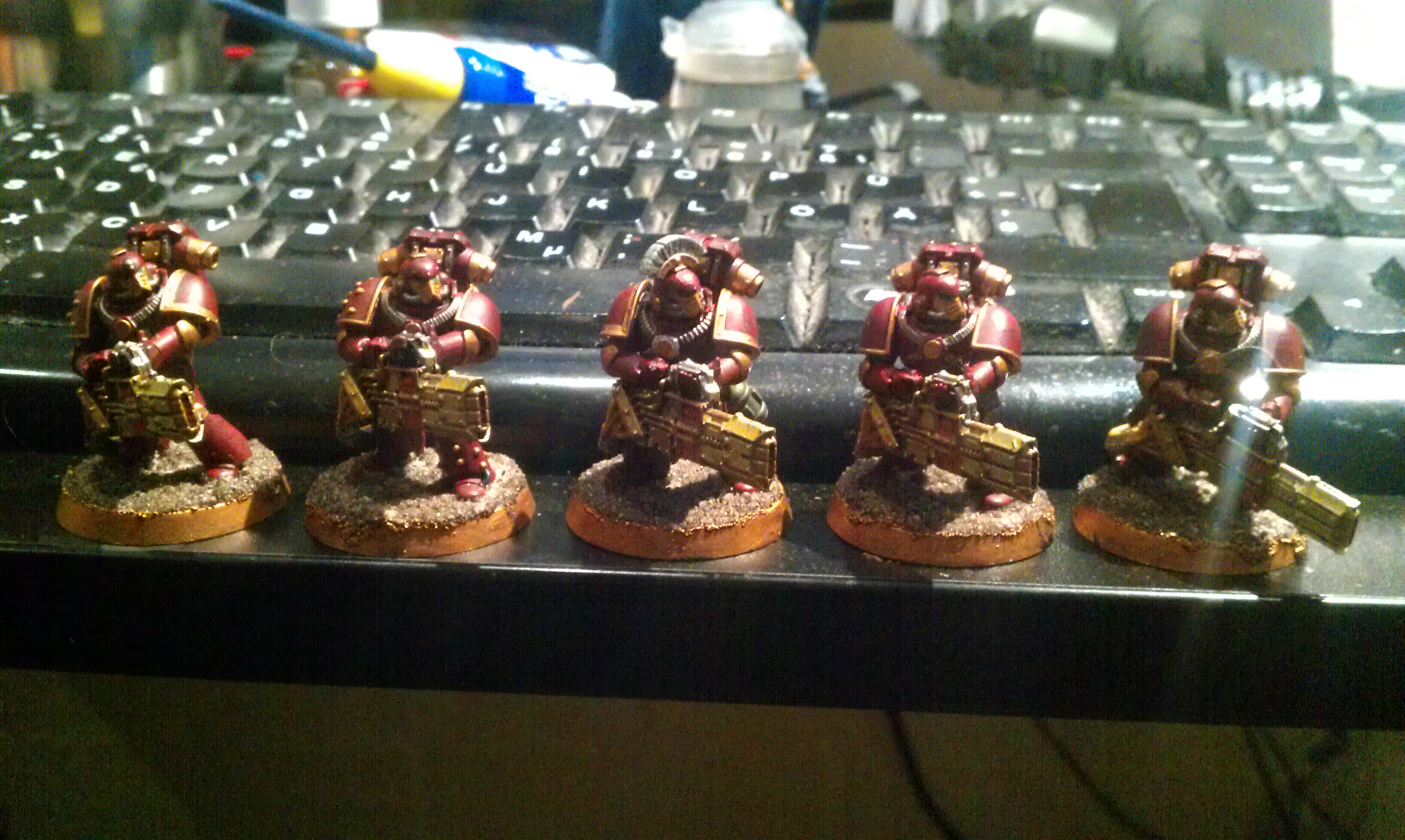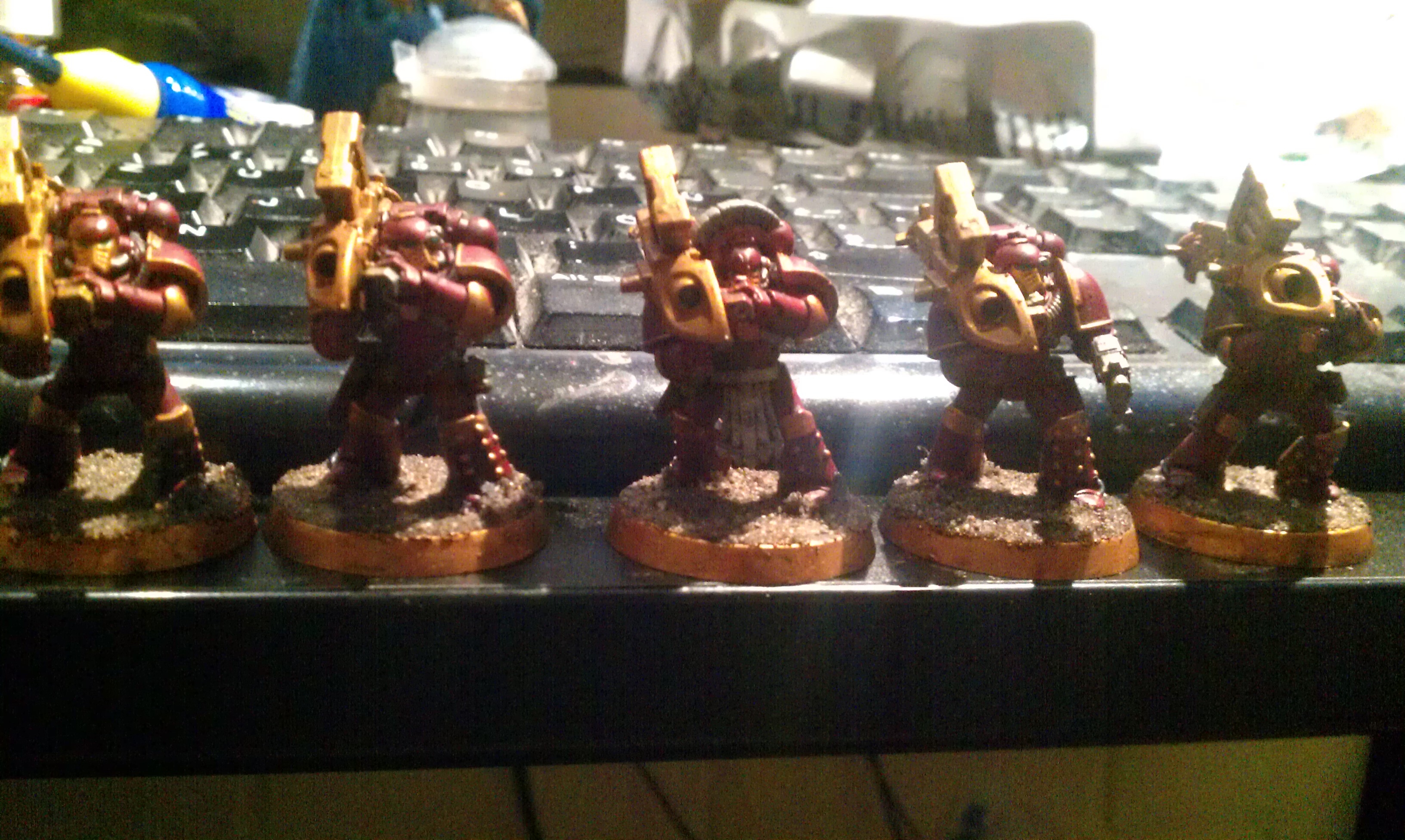 Ein Cataphracii Terminator Trupp der noch mit 5 weiteren ausgebaut wird und ein Legion Veteran Tactical Squad mit Schwebo und Melter samt Sarg mit E Schwert und Plasma Pistolle.